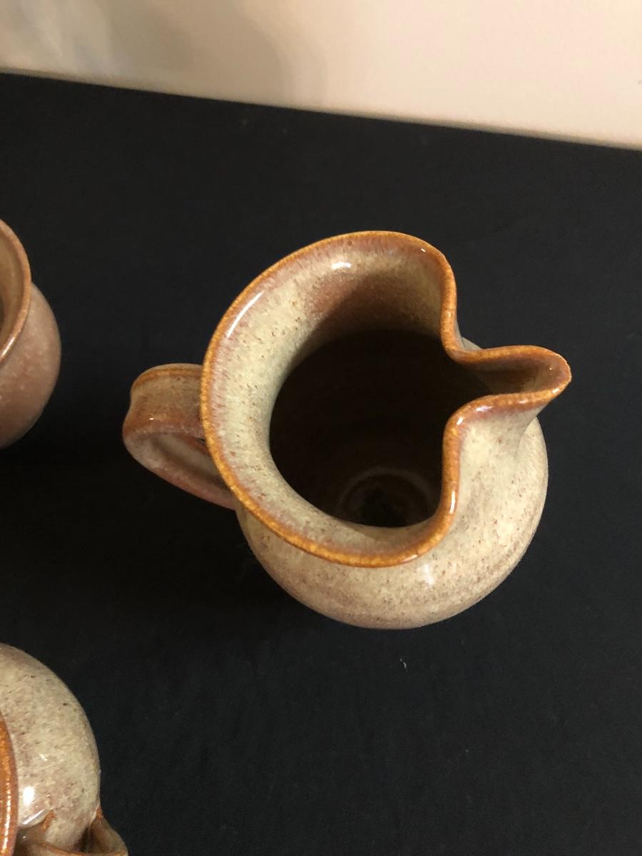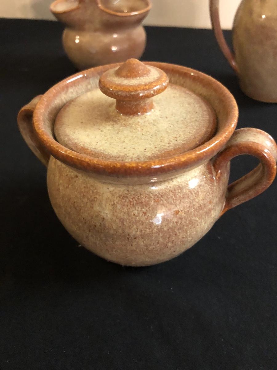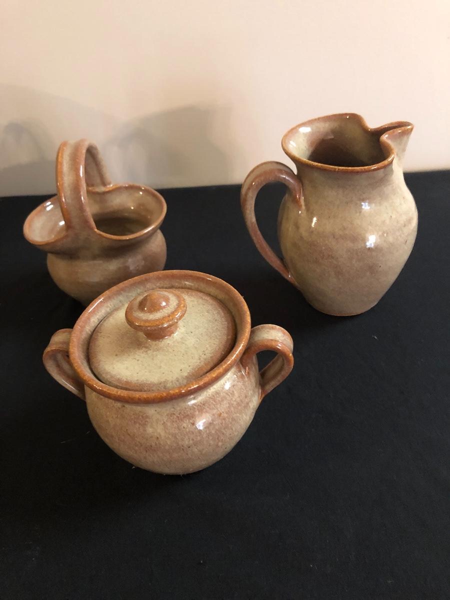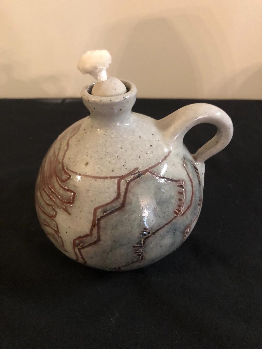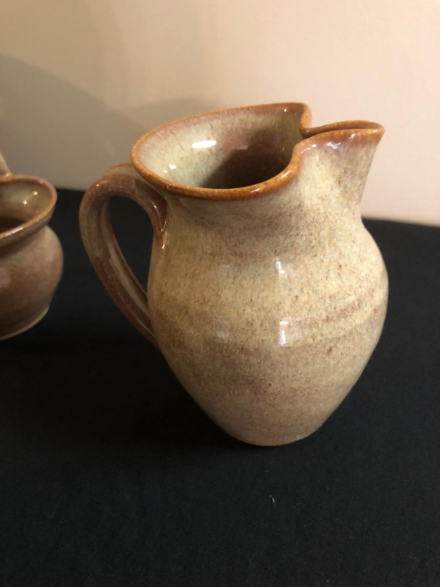The blue speckled plate is 10.5” in diameter and signed by Laura Moore and it is called Potluck - 1986. The brown creamer, sugar bowl and basket is from the same collection. The hand painted bowl signed by Nancy is 8.5” in diameter. The vase has a “W” on its’ bottom and is 7.5” tall. Wagner is the signature on the bottom of the oil lamp. The heart vase/votive is from Morgan Pottery, NC.