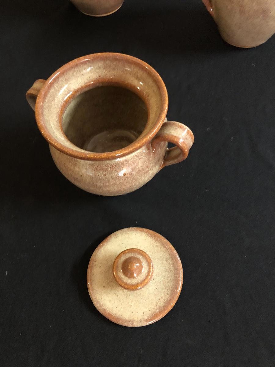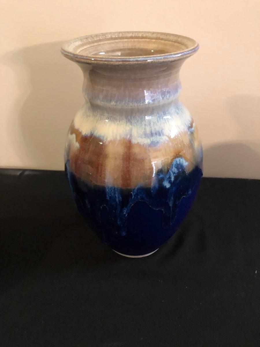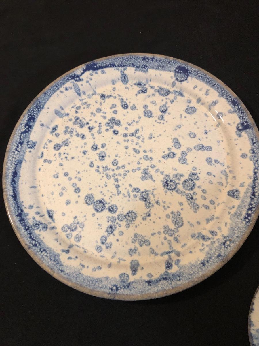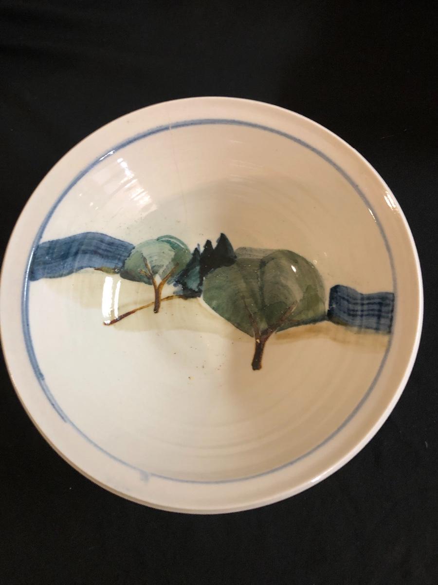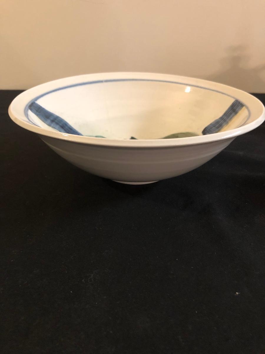The blue speckled plate is 10.5” in diameter and signed by Laura Moore and it is called Potluck - 1986. The brown creamer, sugar bowl and basket is from the same collection. The hand painted bowl signed by Nancy is 8.5” in diameter. The vase has a “W” on its’ bottom and is 7.5” tall. Wagner is the signature on the bottom of the oil lamp. The heart vase/votive is from Morgan Pottery, NC.