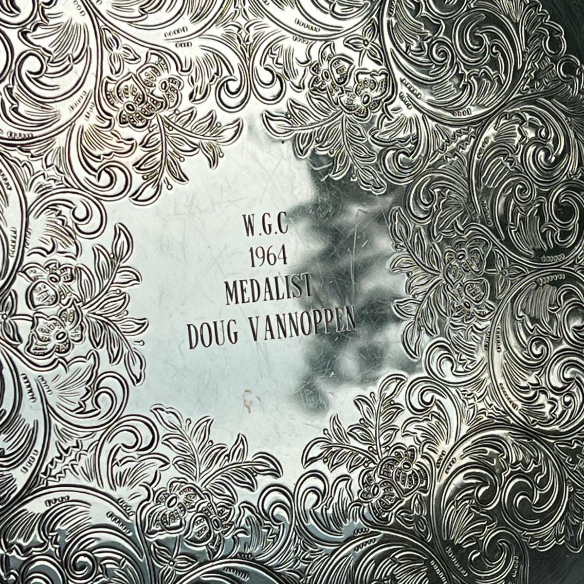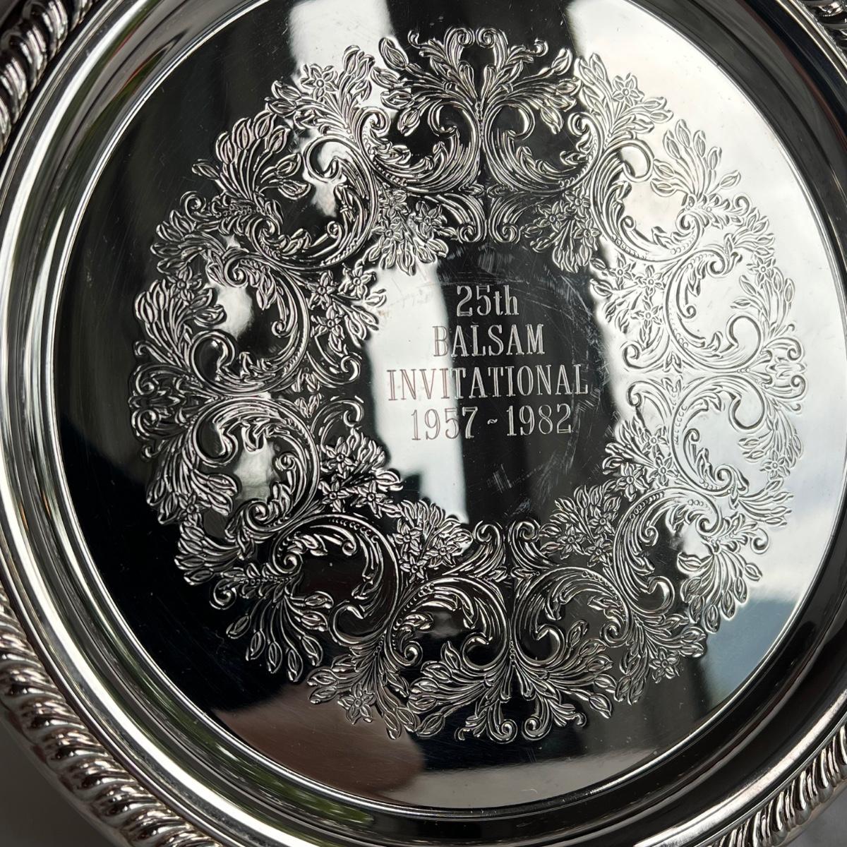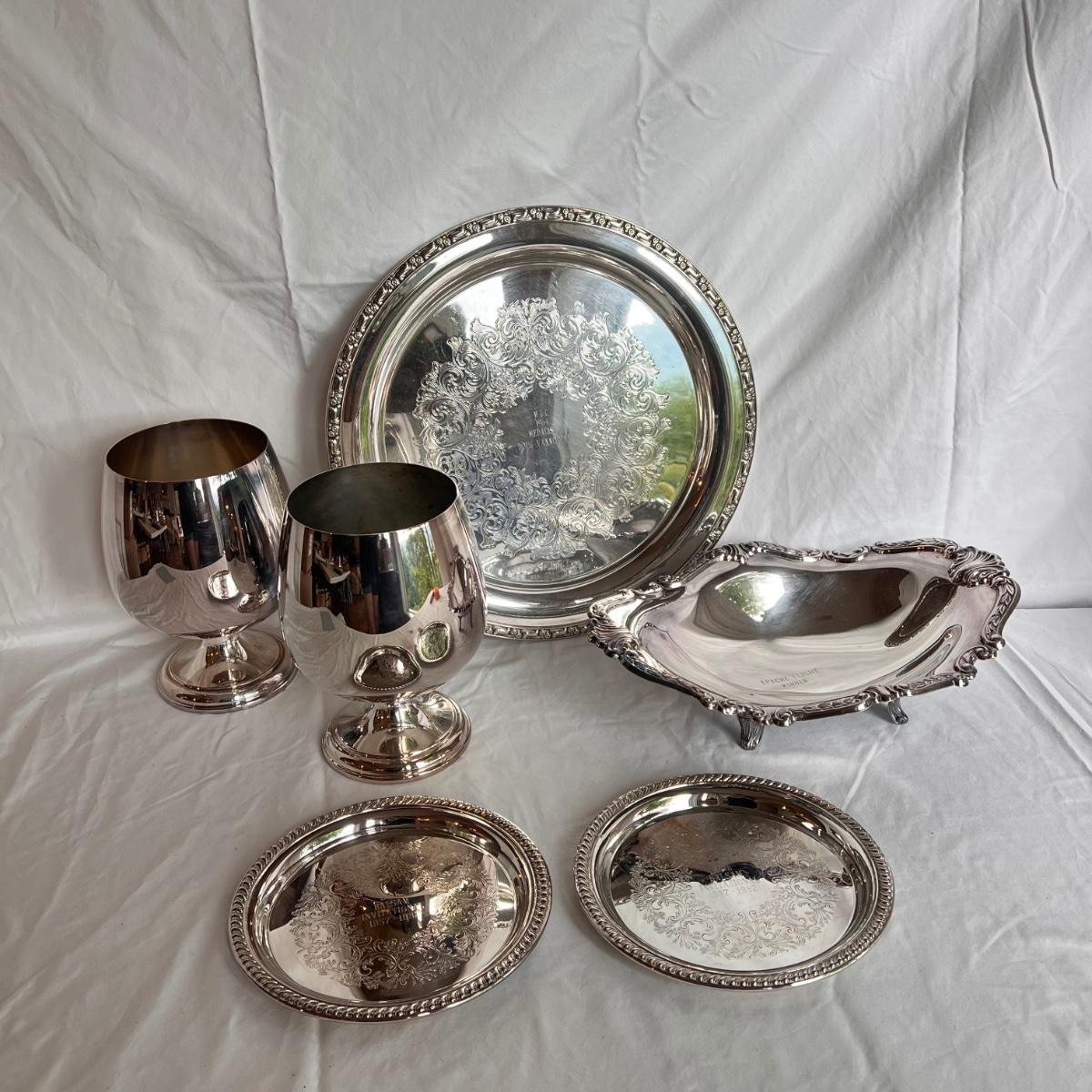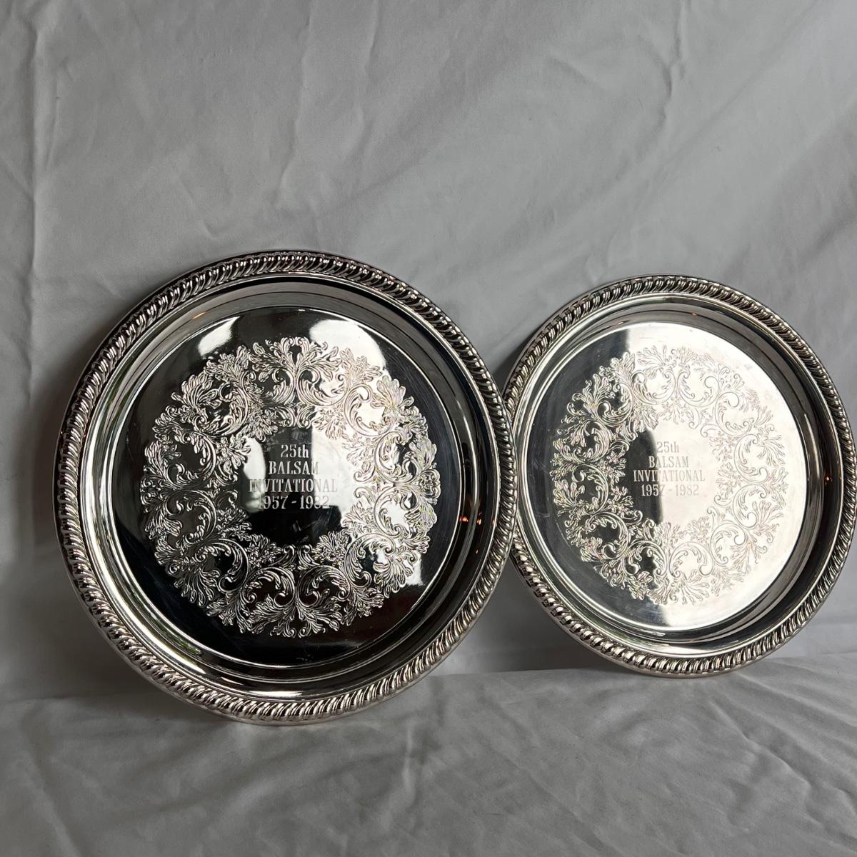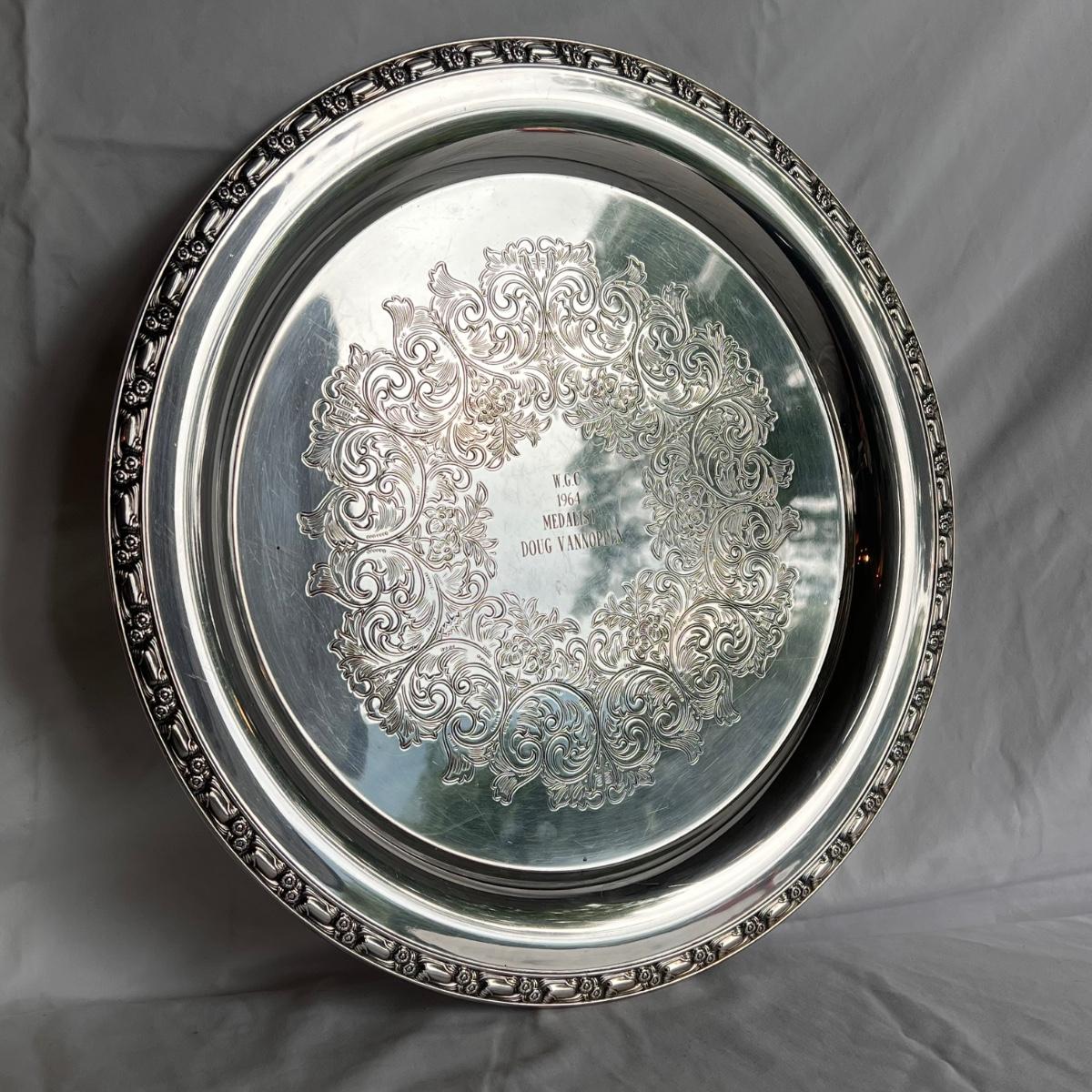 This lot included one large serving tray with “W.G.C. 1964 Medalist Doug VanNoppen” engraved, two plates with “25th Balsam Invitational 1957-1982” engraved, one deep bowl with “Apache Flight Winner” engraved, and two large cups with Sheridan silver plates stamped on the bottom. The largest dish measures 14.95” x .95”H. Shipping available.