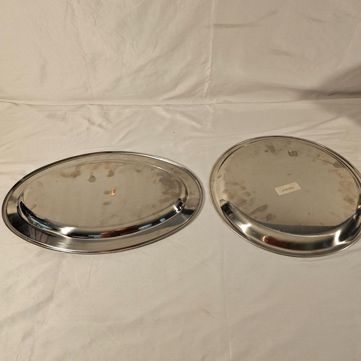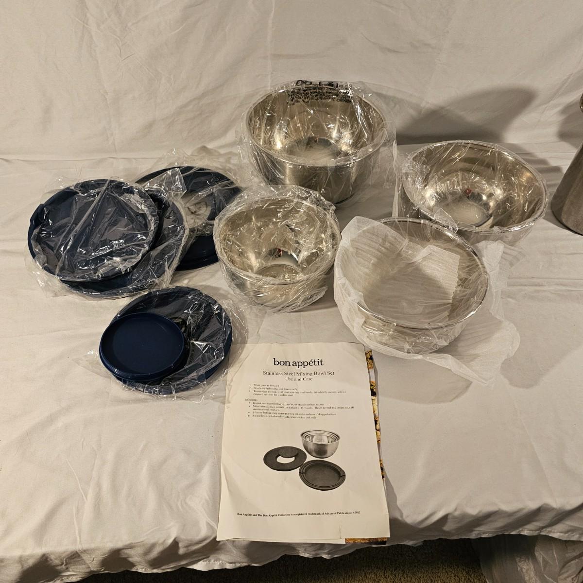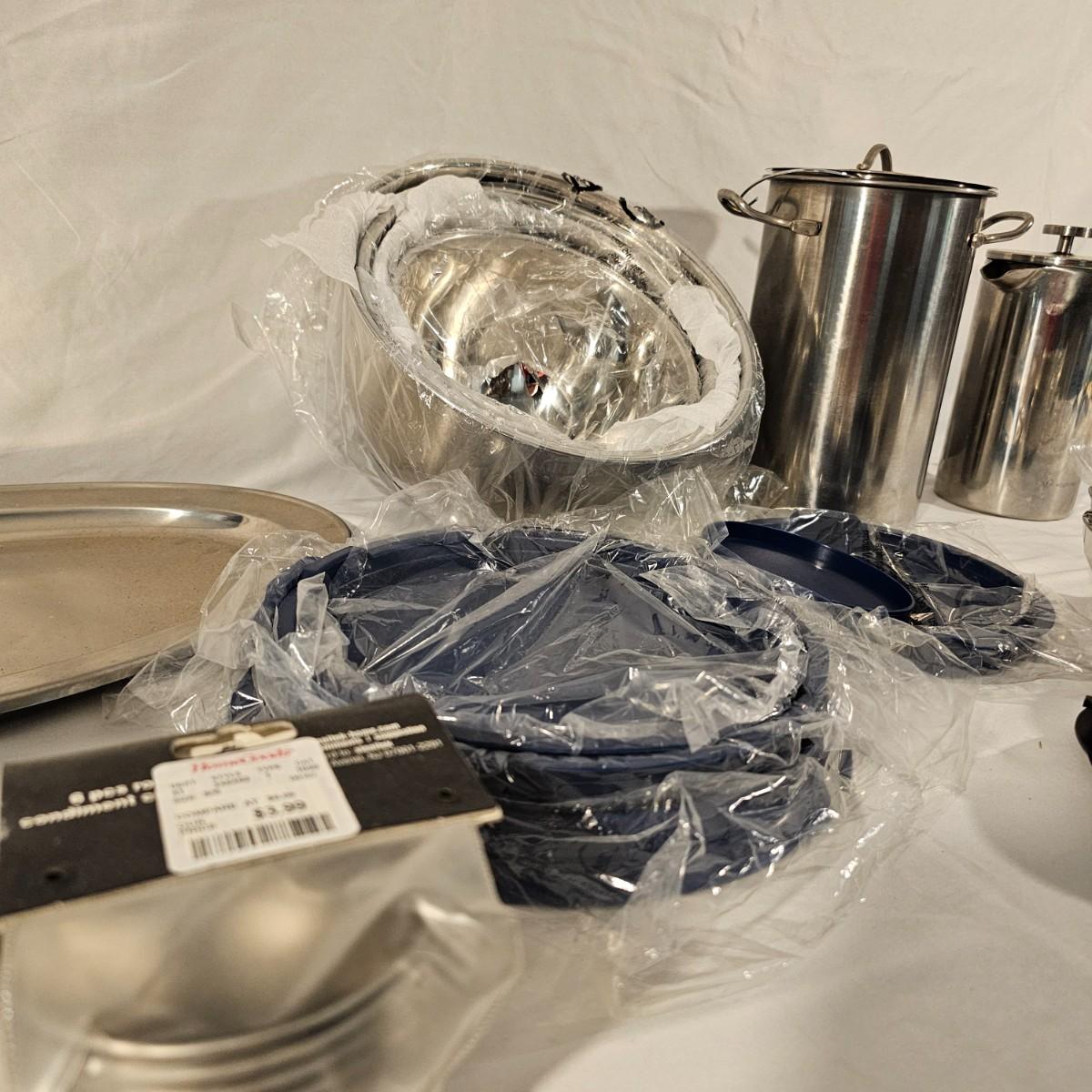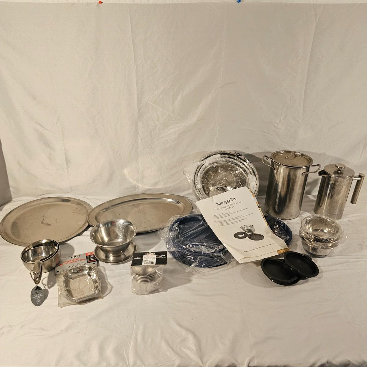 Bowls, platters, measuring cups, storage, more. All items stainless unless otherwise marked. Large bowl set by Cooks Essentials with lids, largest is 10"D. Round platter is 12.5"D, oval is 16" x 10.5". Set of off-size measuring cups. See photos for details. Shipping available.