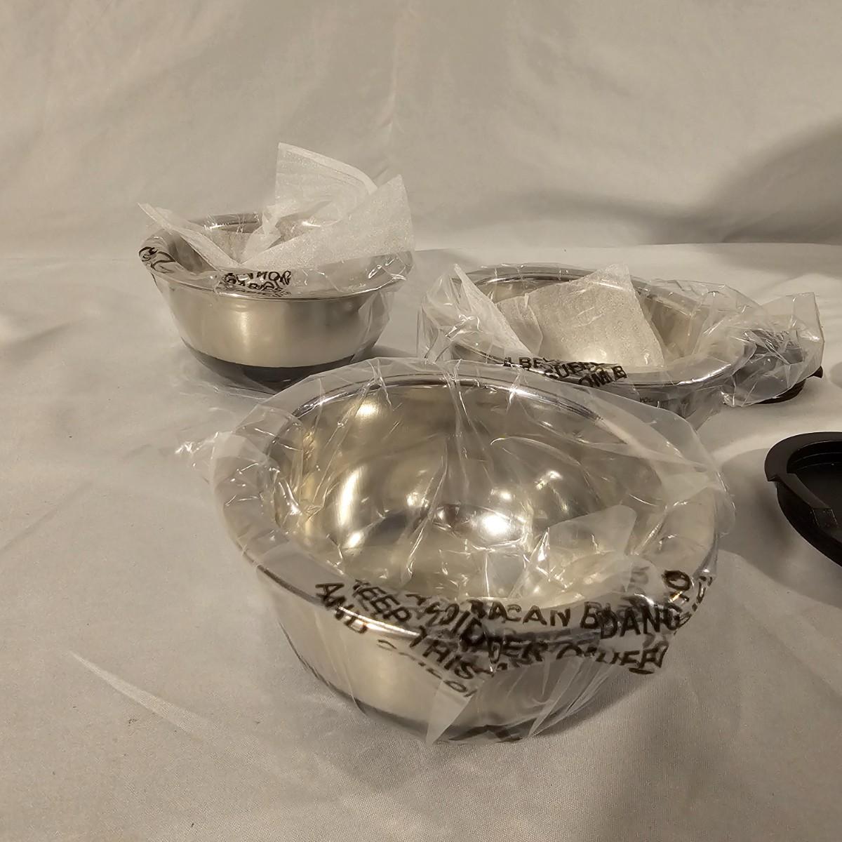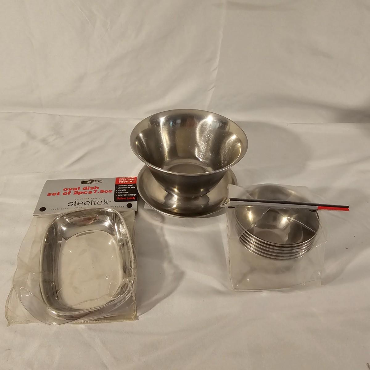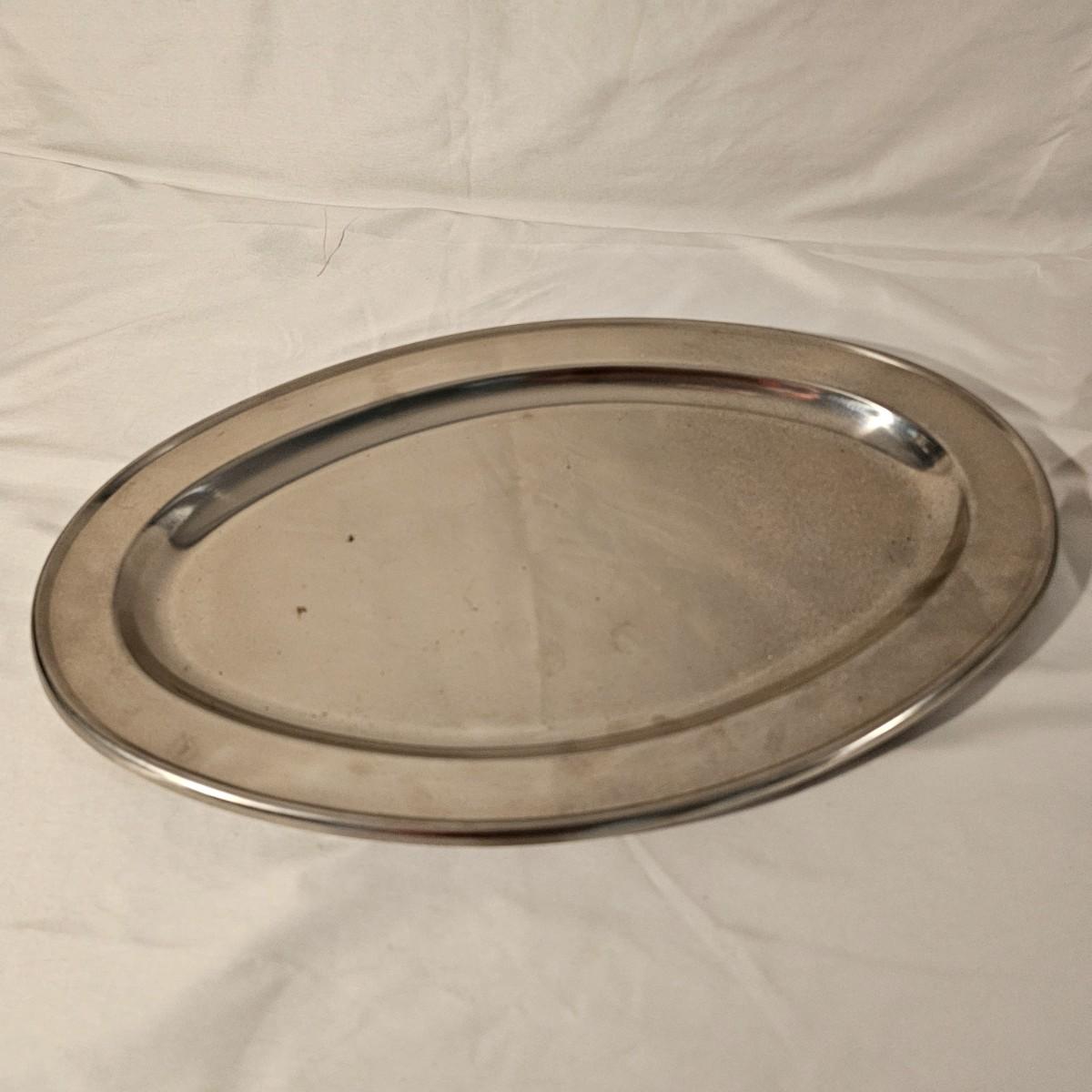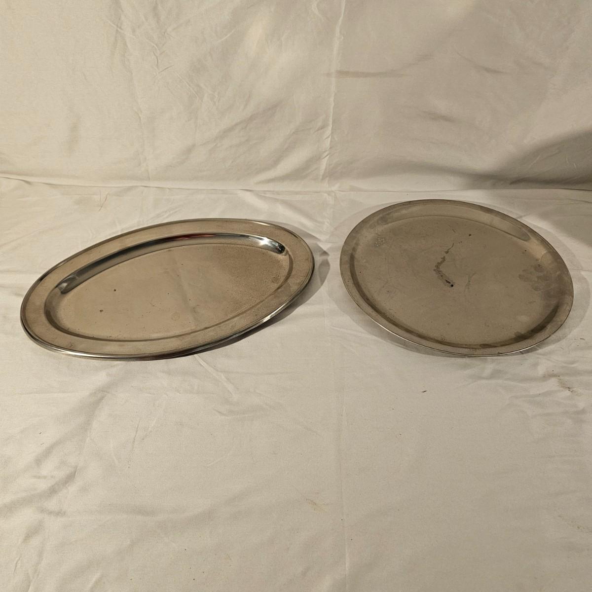 Bowls, platters, measuring cups, storage, more. All items stainless unless otherwise marked. Large bowl set by Cooks Essentials with lids, largest is 10"D. Round platter is 12.5"D, oval is 16" x 10.5". Set of off-size measuring cups. See photos for details. Shipping available.