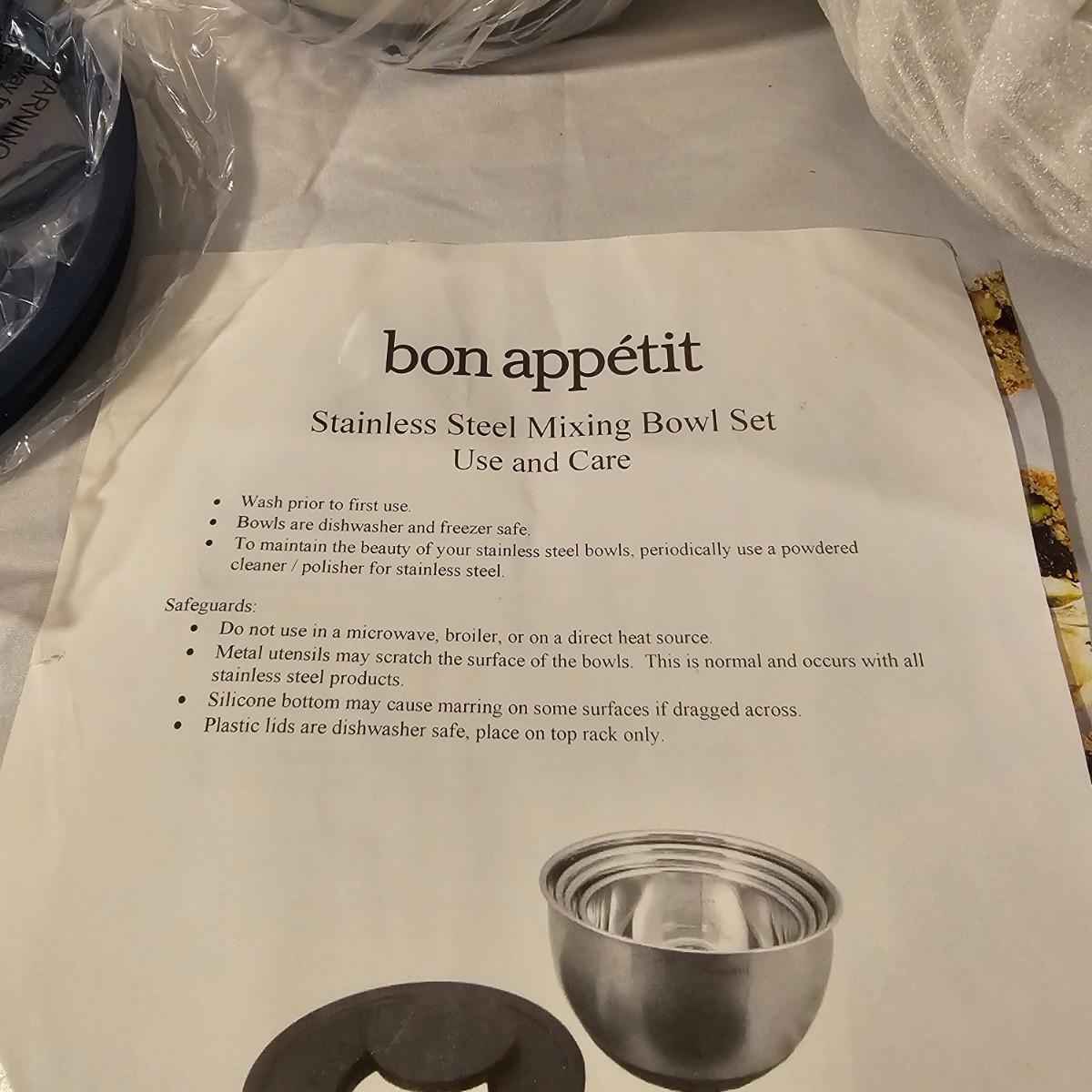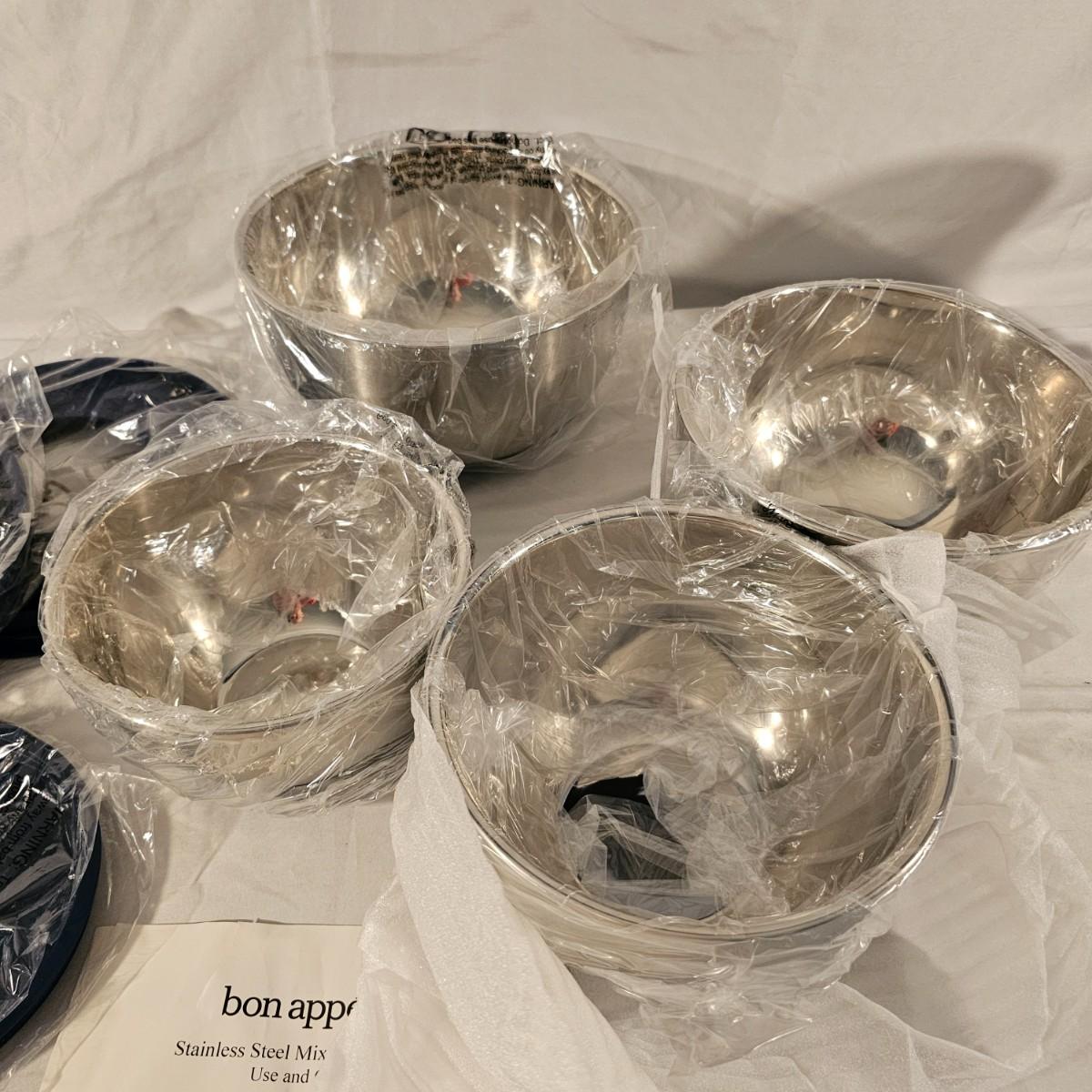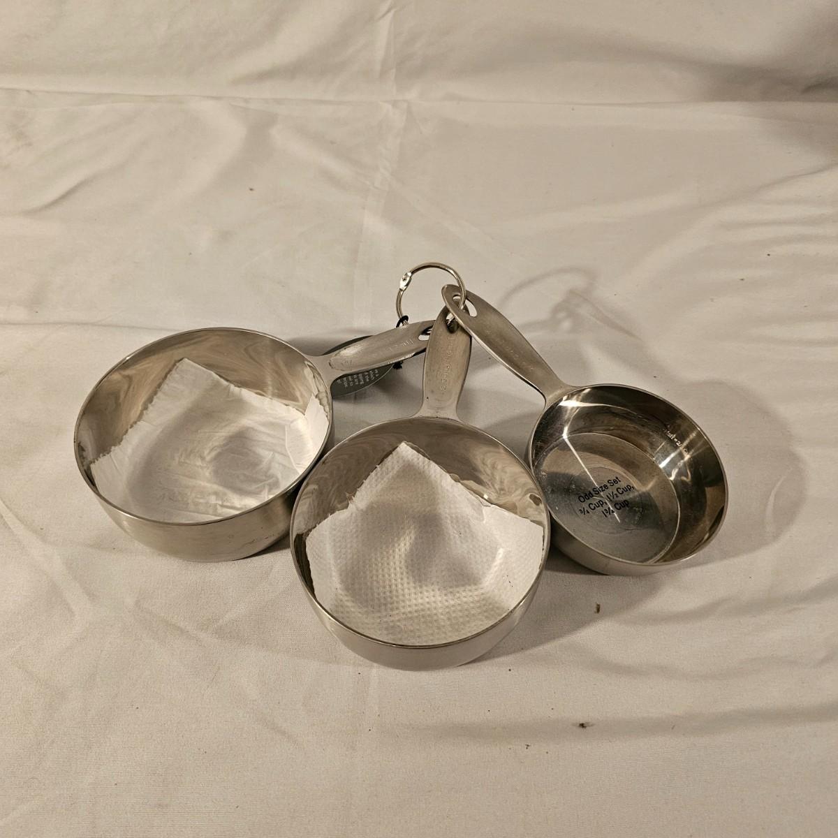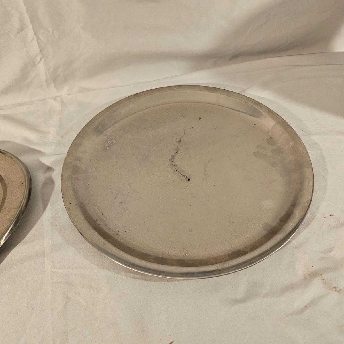 Bowls, platters, measuring cups, storage, more. All items stainless unless otherwise marked. Large bowl set by Cooks Essentials with lids, largest is 10"D. Round platter is 12.5"D, oval is 16" x 10.5". Set of off-size measuring cups. See photos for details. Shipping available.