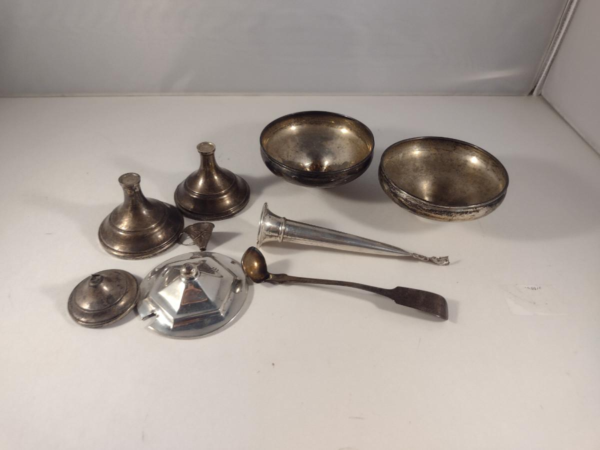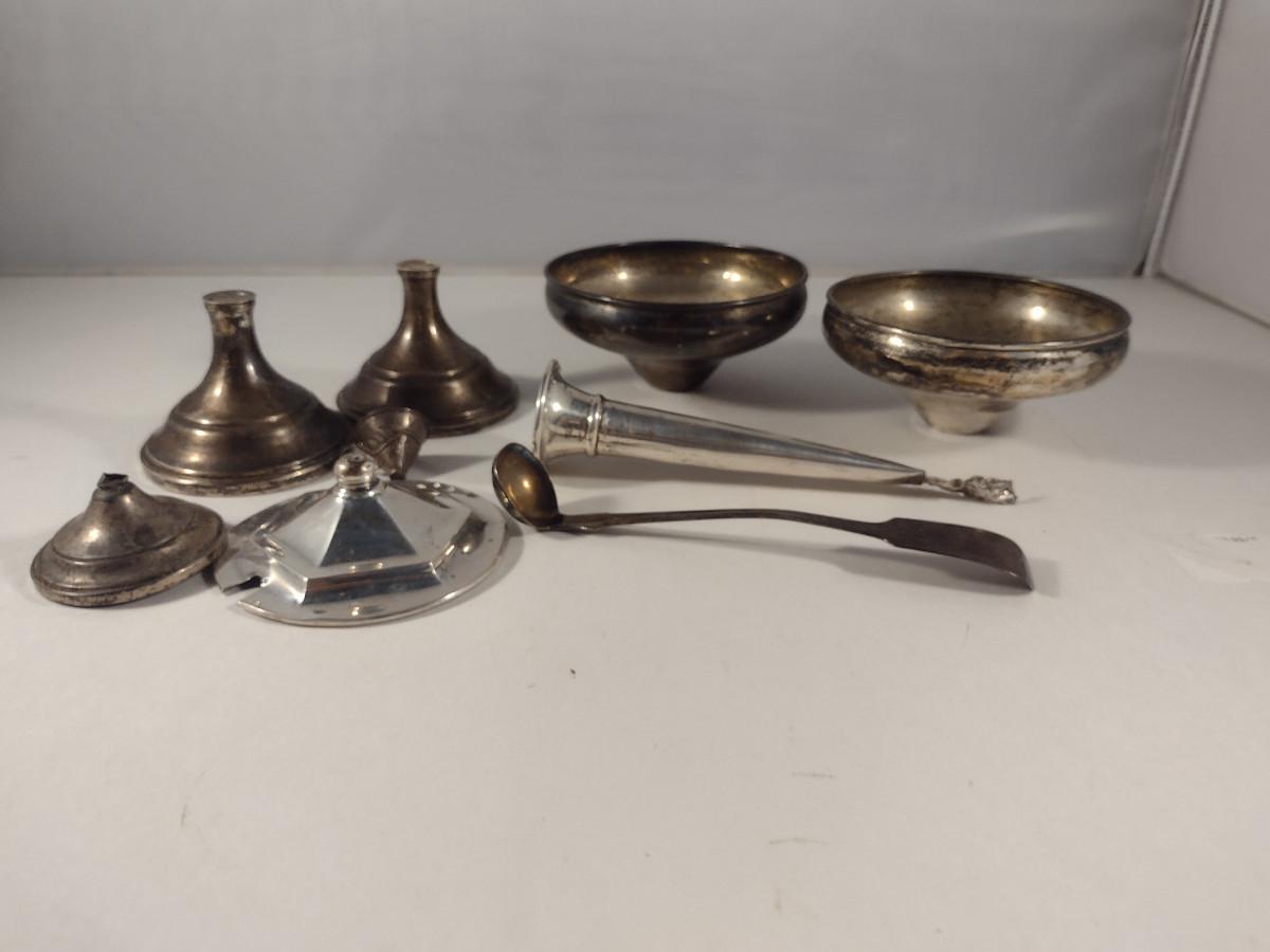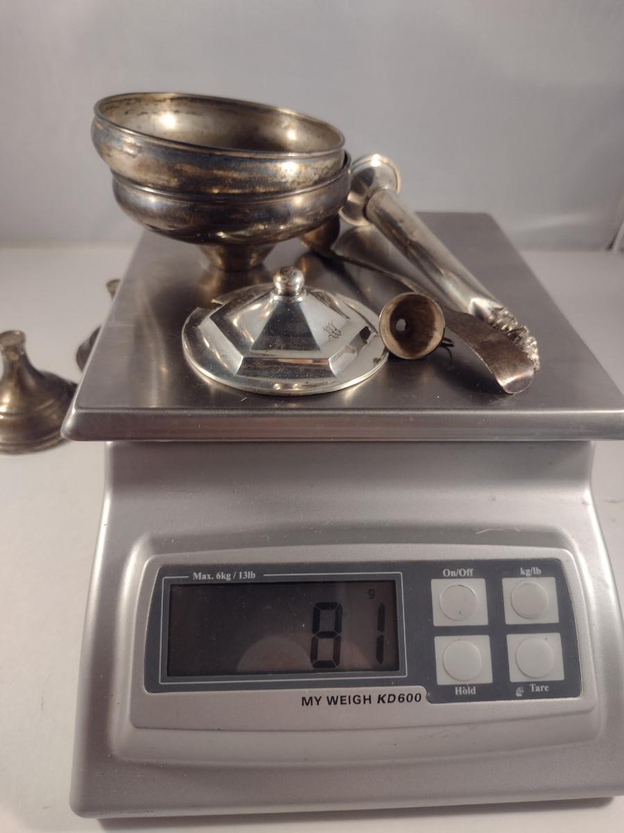 Assorted Sterling Silver- Approx Total Weight 81 Grams. Items are mostly damaged and are in poor condition. Weight does not include the three weighted bottoms