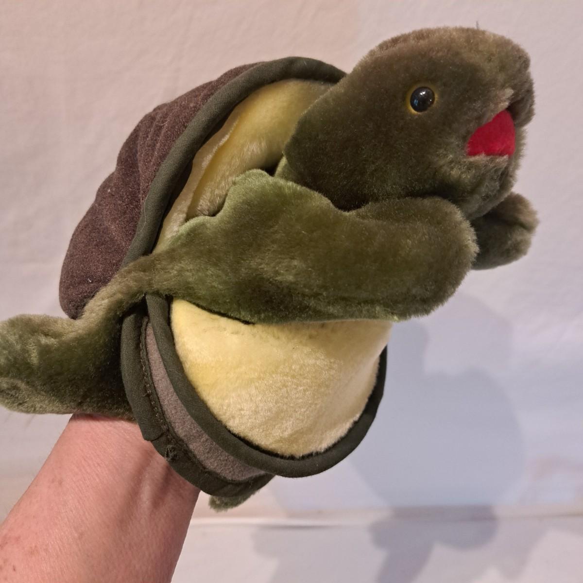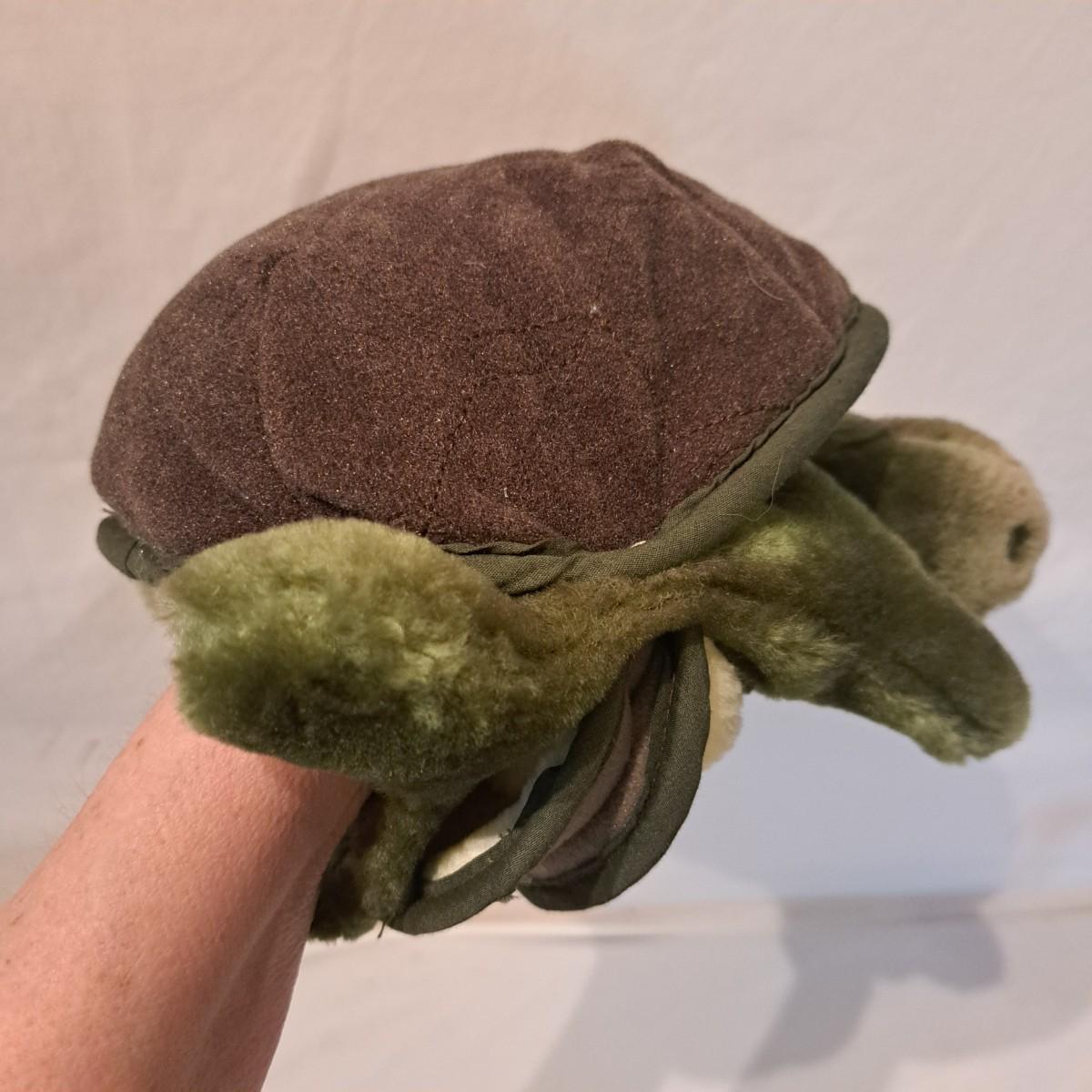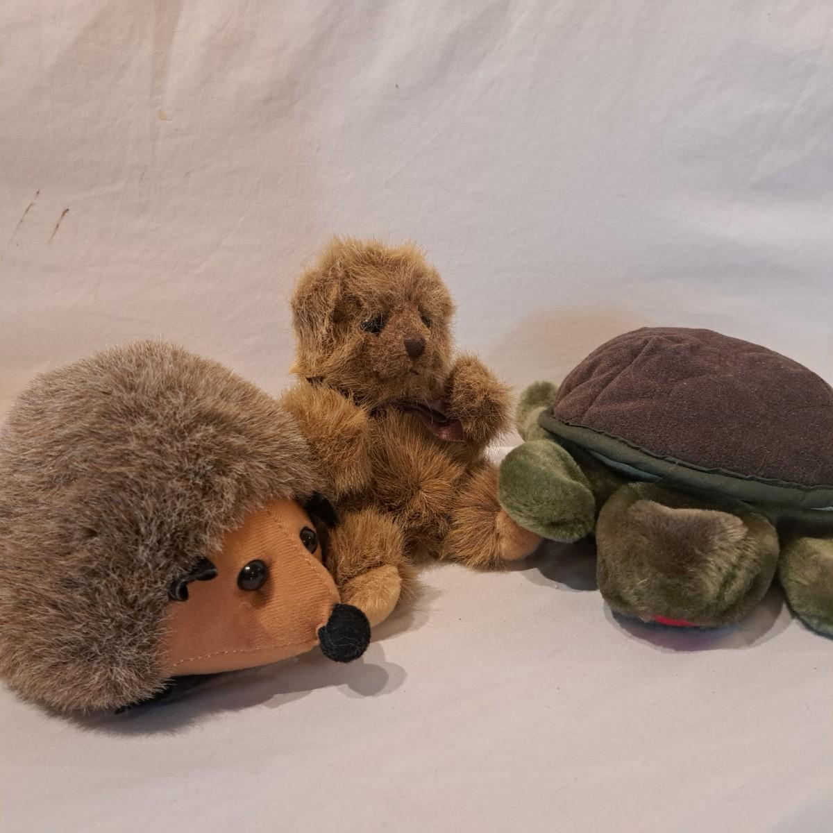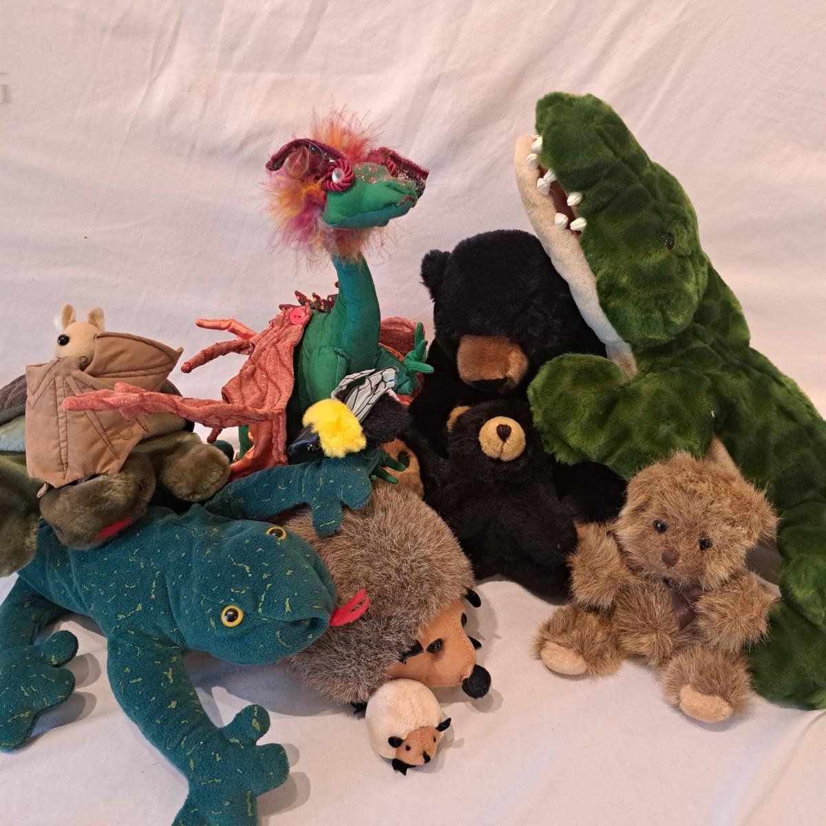A mix of ten stuffed animals and hand puppets! The lizard, turtle, pink bunny, Stella Luna bat and faux leather bumble bee are hand/finger puppets ranging in size from 3" in length (bumble bee) to a lizard 18" in length. The others include an alligator 20"in length, the three bears range from 5"H to 10.5"H, plain stuffed animals. The hedgehog has a zip in its bottom that reveals a baby hedgehog hidden inside! The 12"H beautiful dragon with feathery retro hair, pearl button eyes and fancy orange wings appears to be hand-made and has movable internal wires for different poses. Please see photos of tags for toy makers. Shipping available.