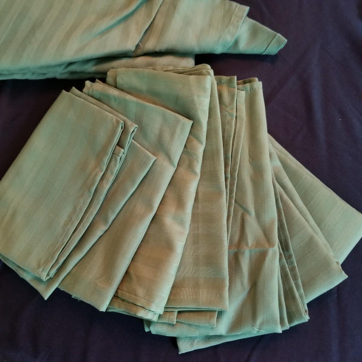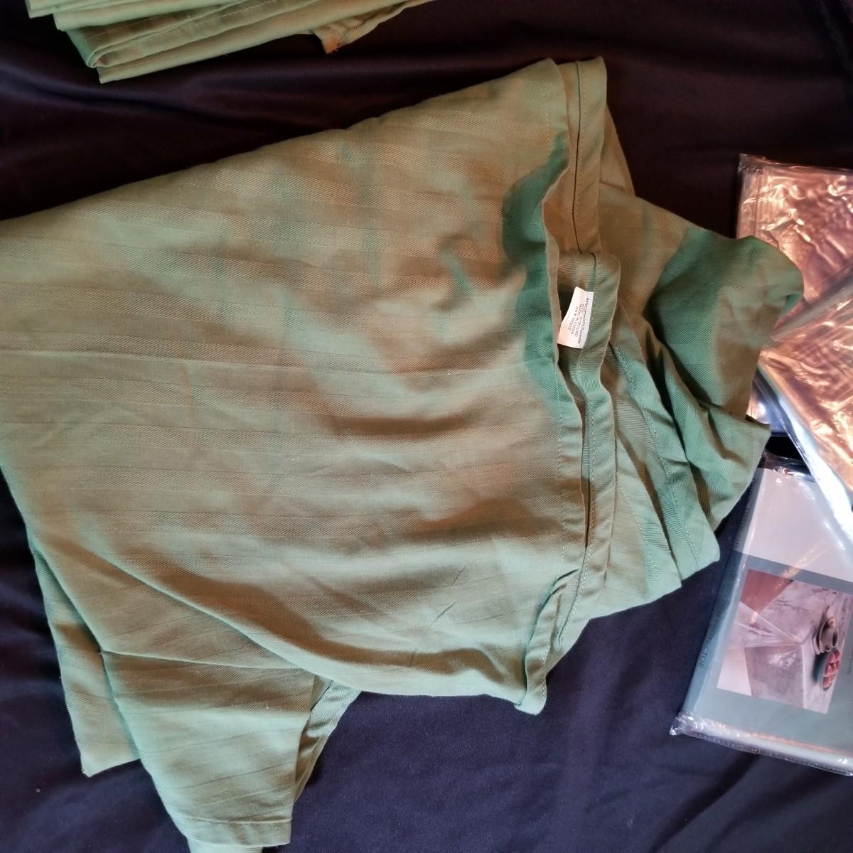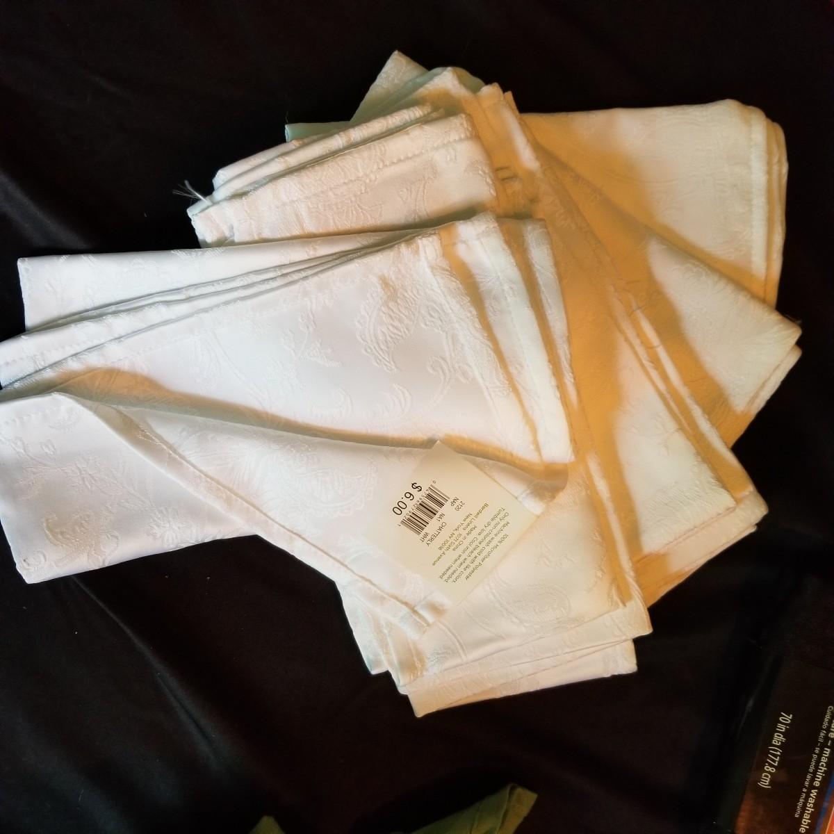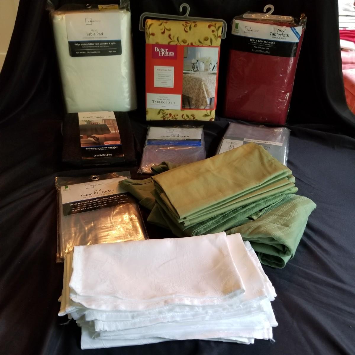 A mix of tablecloths, pad, and protective covers as well as cloth napkins. 70" round dark green tablecloth with eight matching napkins, 18" square. Also five plain green napkins, same size. Seven white polyester napkins, 18" square. Seven items shown in packages are new, see photos for sizes. Other items gently used. Shipping available.
