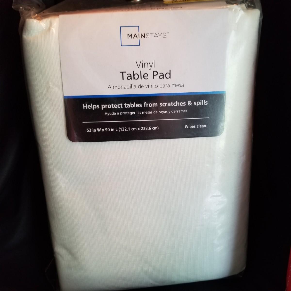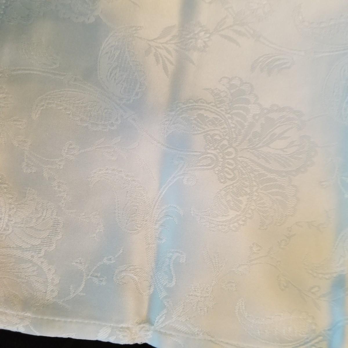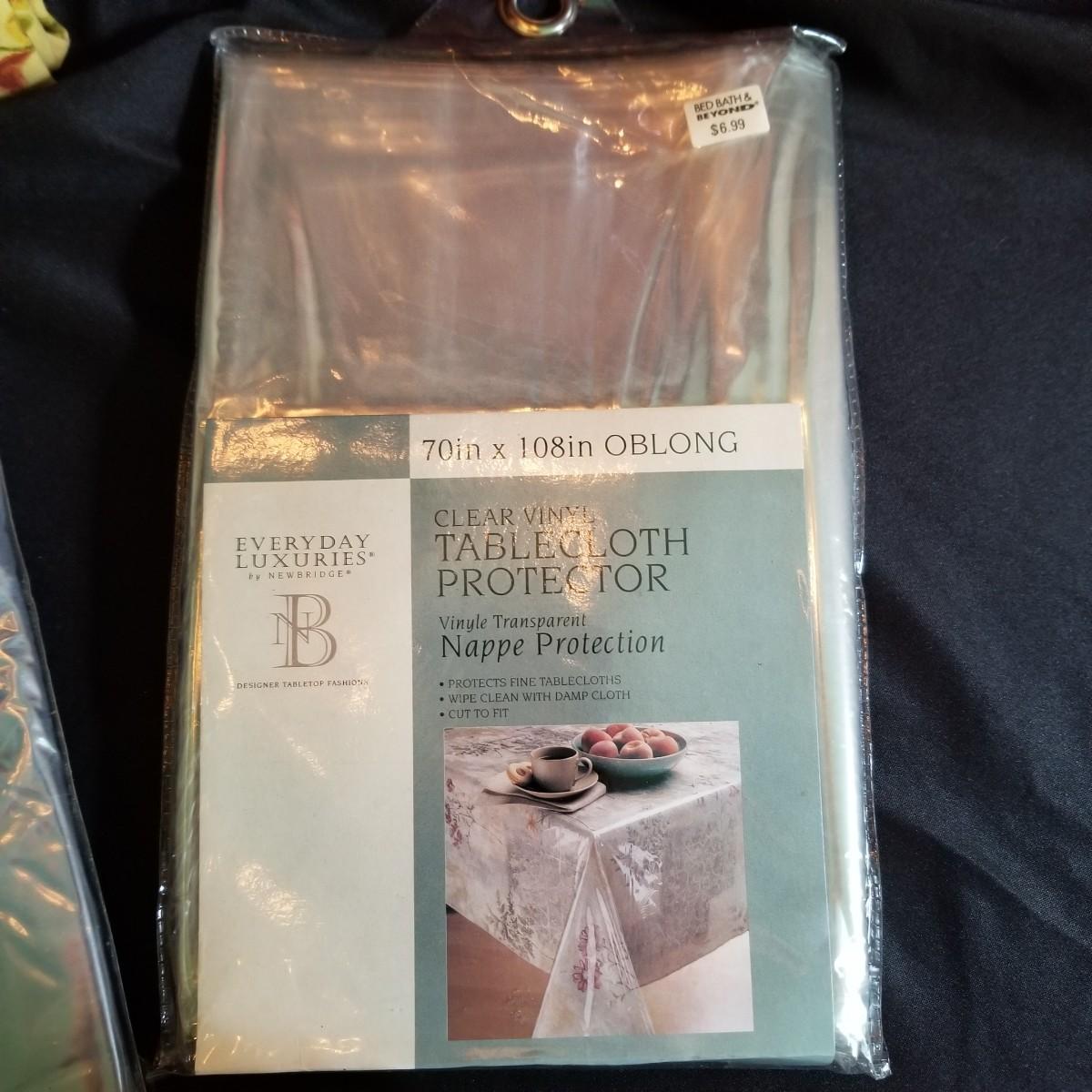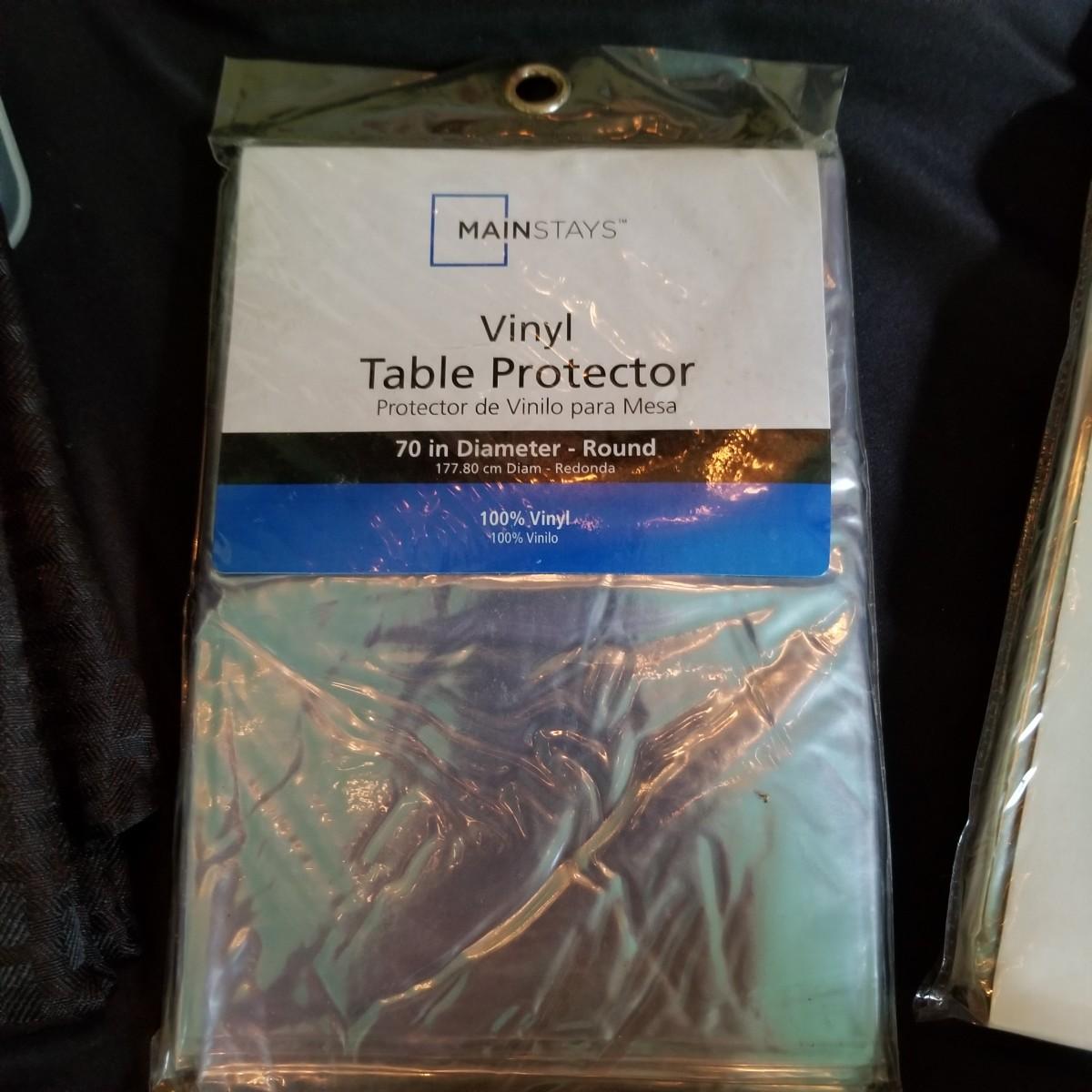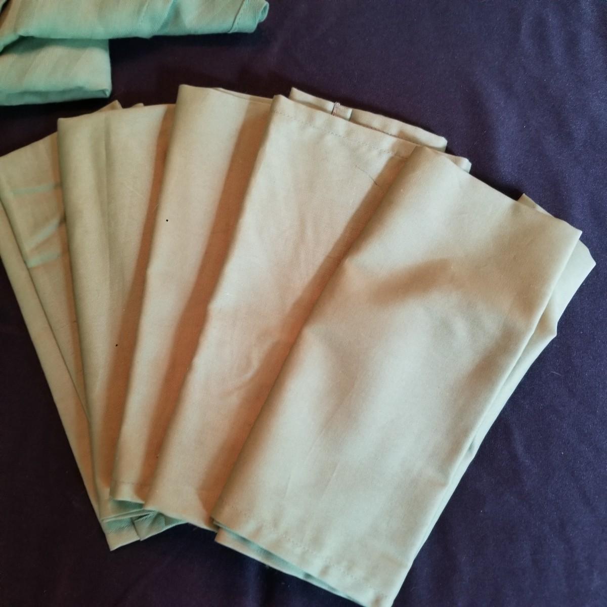 A mix of tablecloths, pad, and protective covers as well as cloth napkins. 70" round dark green tablecloth with eight matching napkins, 18" square. Also five plain green napkins, same size. Seven white polyester napkins, 18" square. Seven items shown in packages are new, see photos for sizes. Other items gently used. Shipping available.