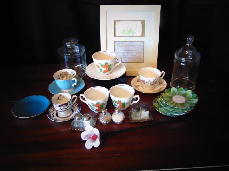 Assorted Teacups, Some teacups don't have saucers. Grandmother Plaque, mini salt n pepper shakers, glass flower, glass containers, green saucers are in rough shape but can be repurposed use for art or craft projects