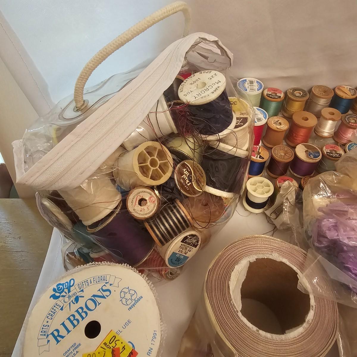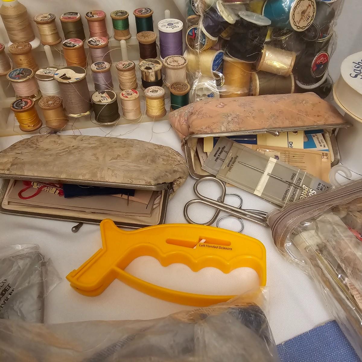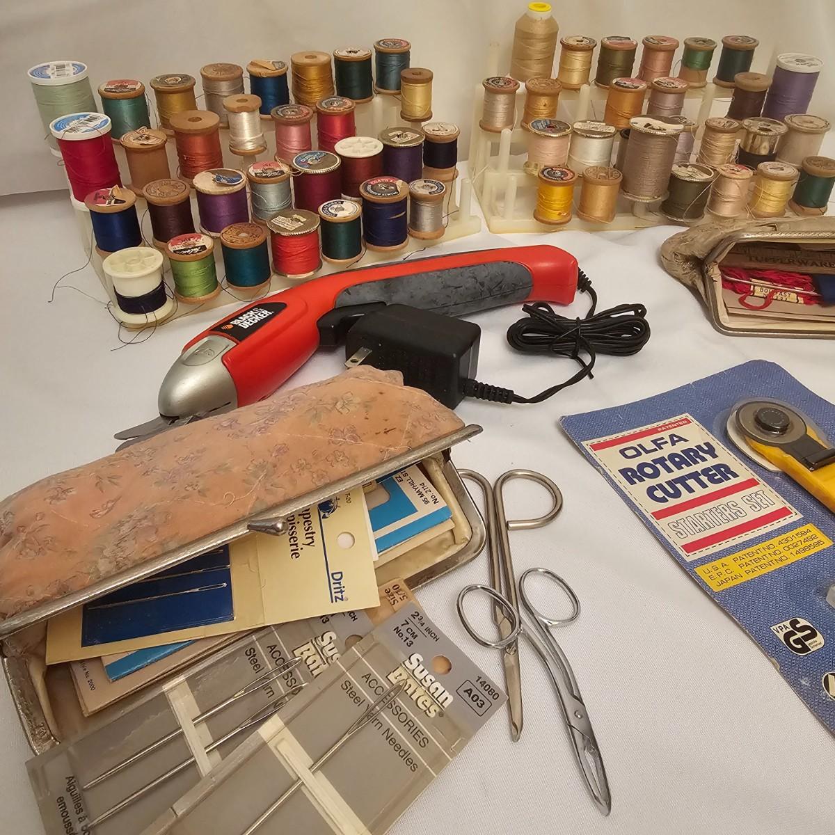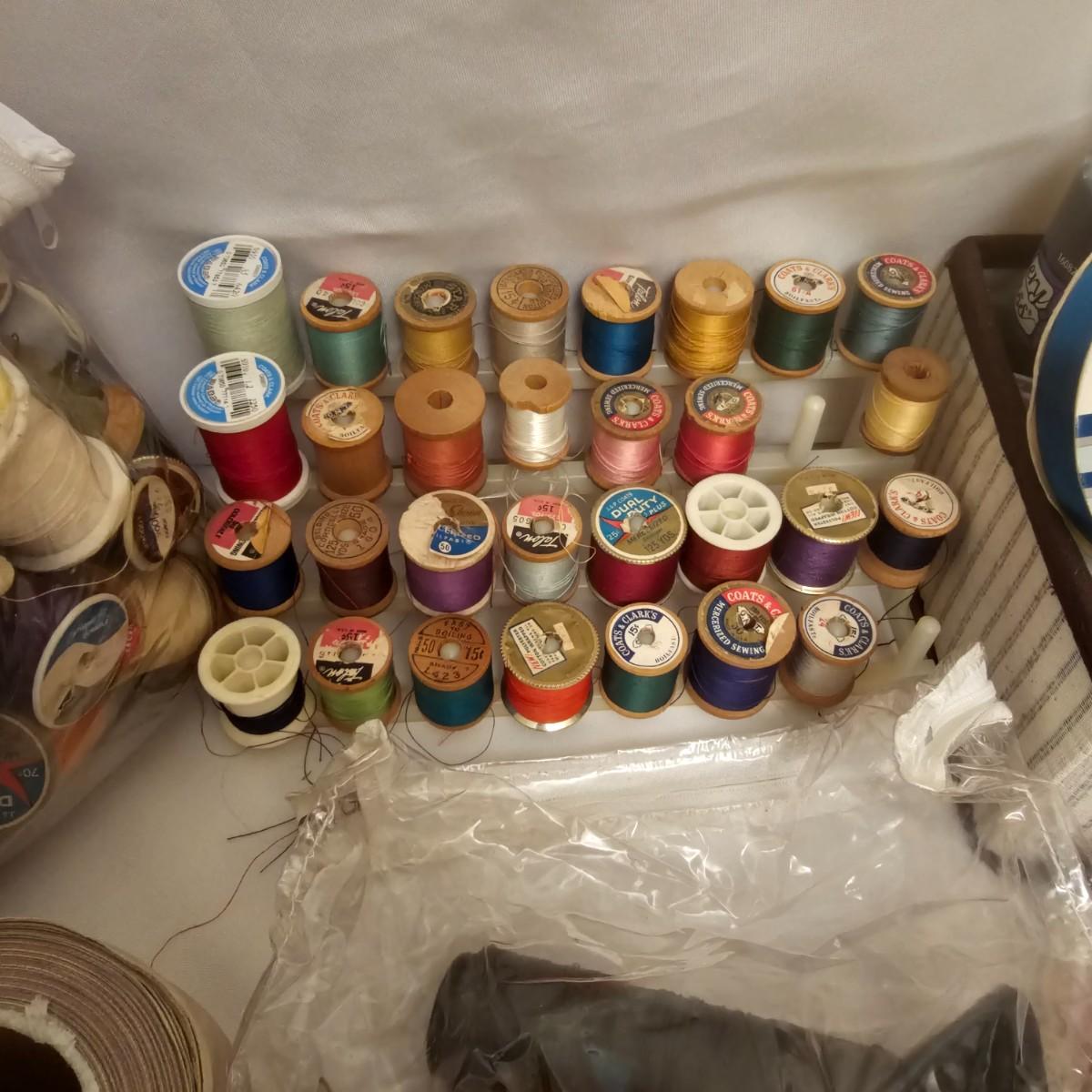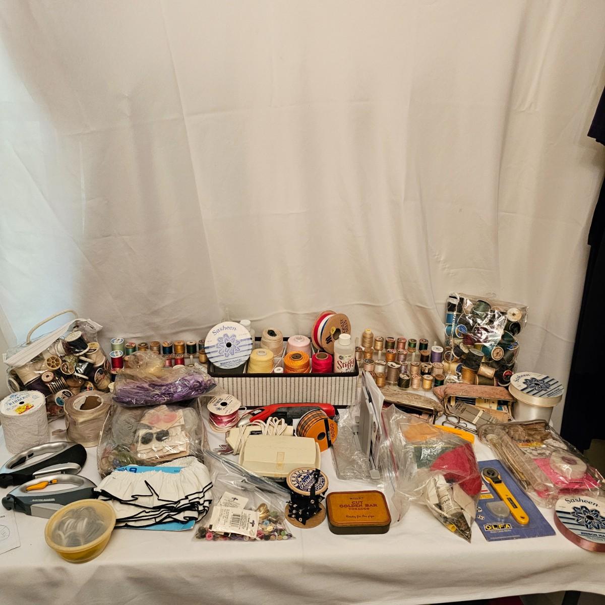 Spools, cones, thread in all colors and types plus scissors, needles, ribbon and more. Older style spool stack racks with lots of different types of thread. Bags with miscellaneous sewing items in them. Four sets of electric scissors, two corded and two battery. All items powered on when tested. Some of the thread is older and might be brittle. See photos for details. Shipping available.