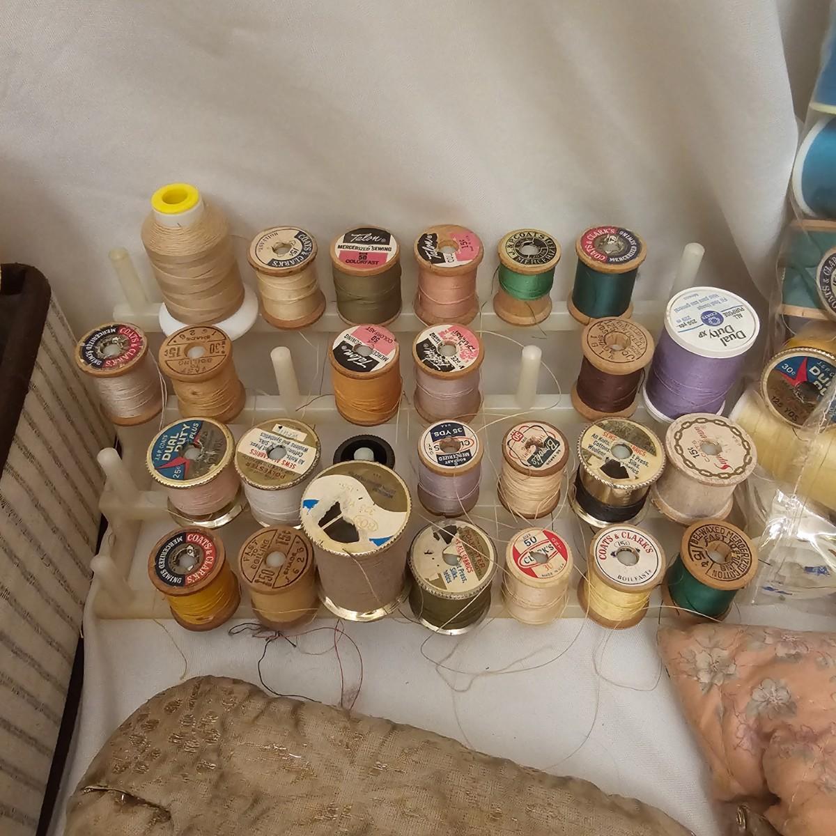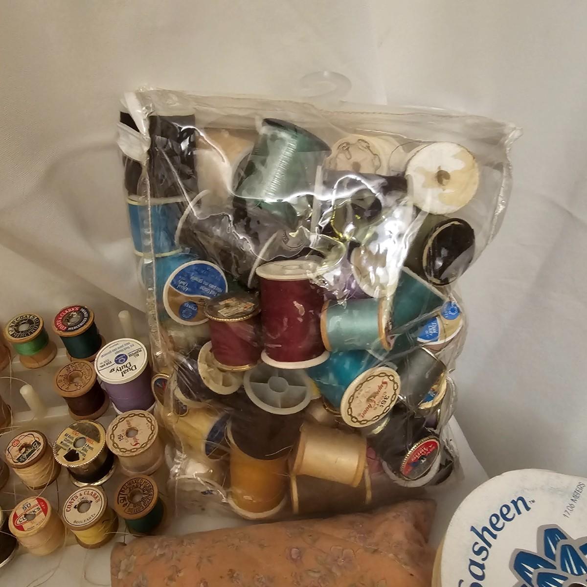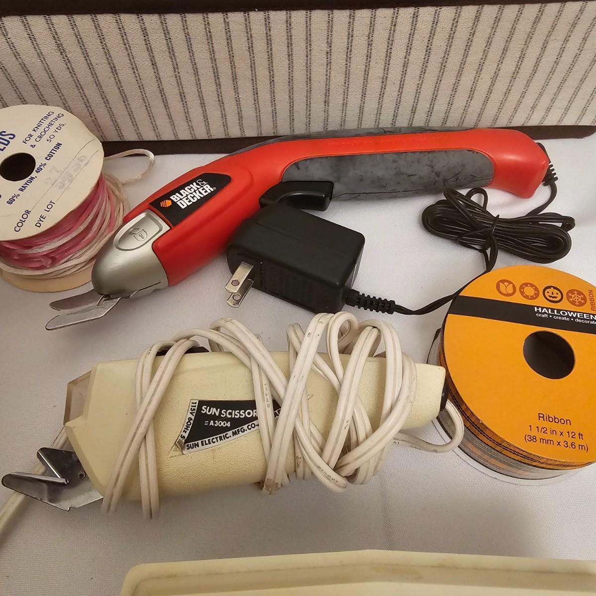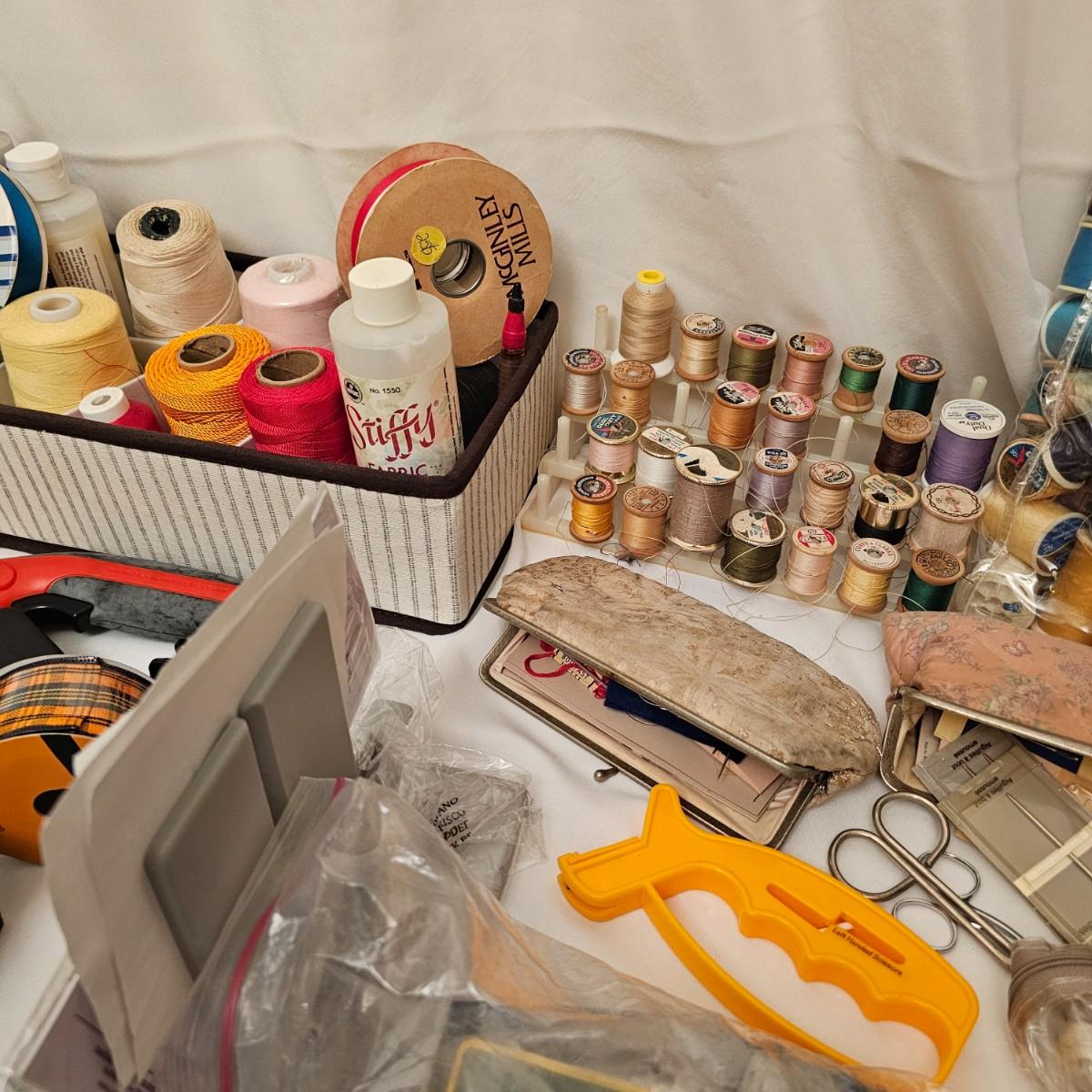 Spools, cones, thread in all colors and types plus scissors, needles, ribbon and more. Older style spool stack racks with lots of different types of thread. Bags with miscellaneous sewing items in them. Four sets of electric scissors, two corded and two battery. All items powered on when tested. Some of the thread is older and might be brittle. See photos for details. Shipping available.