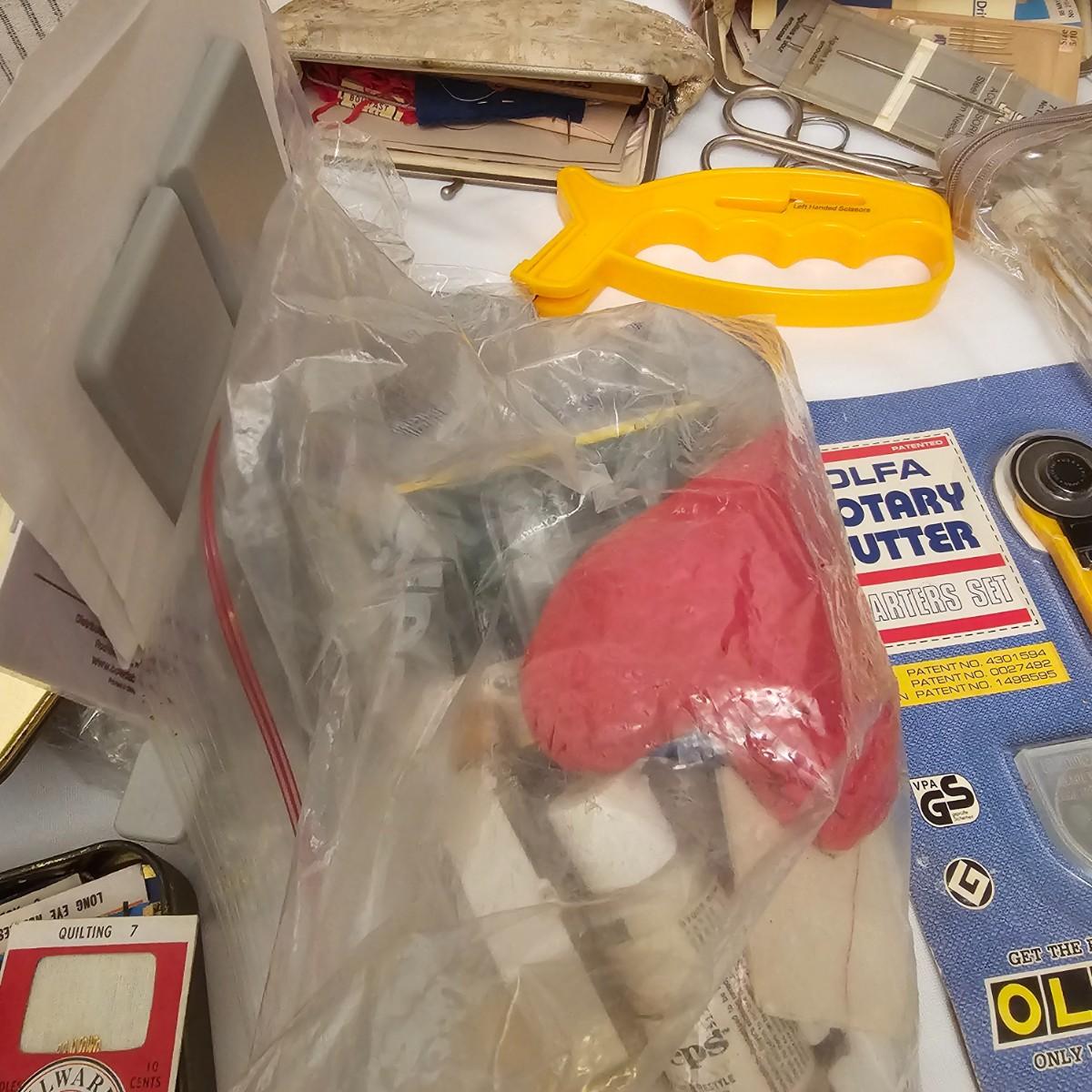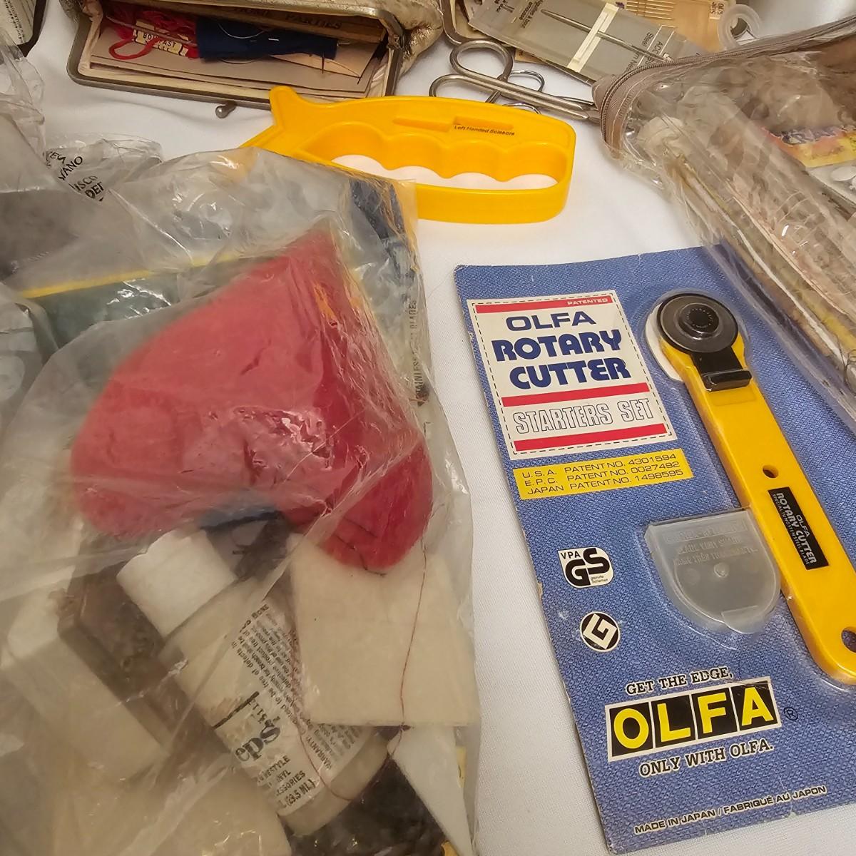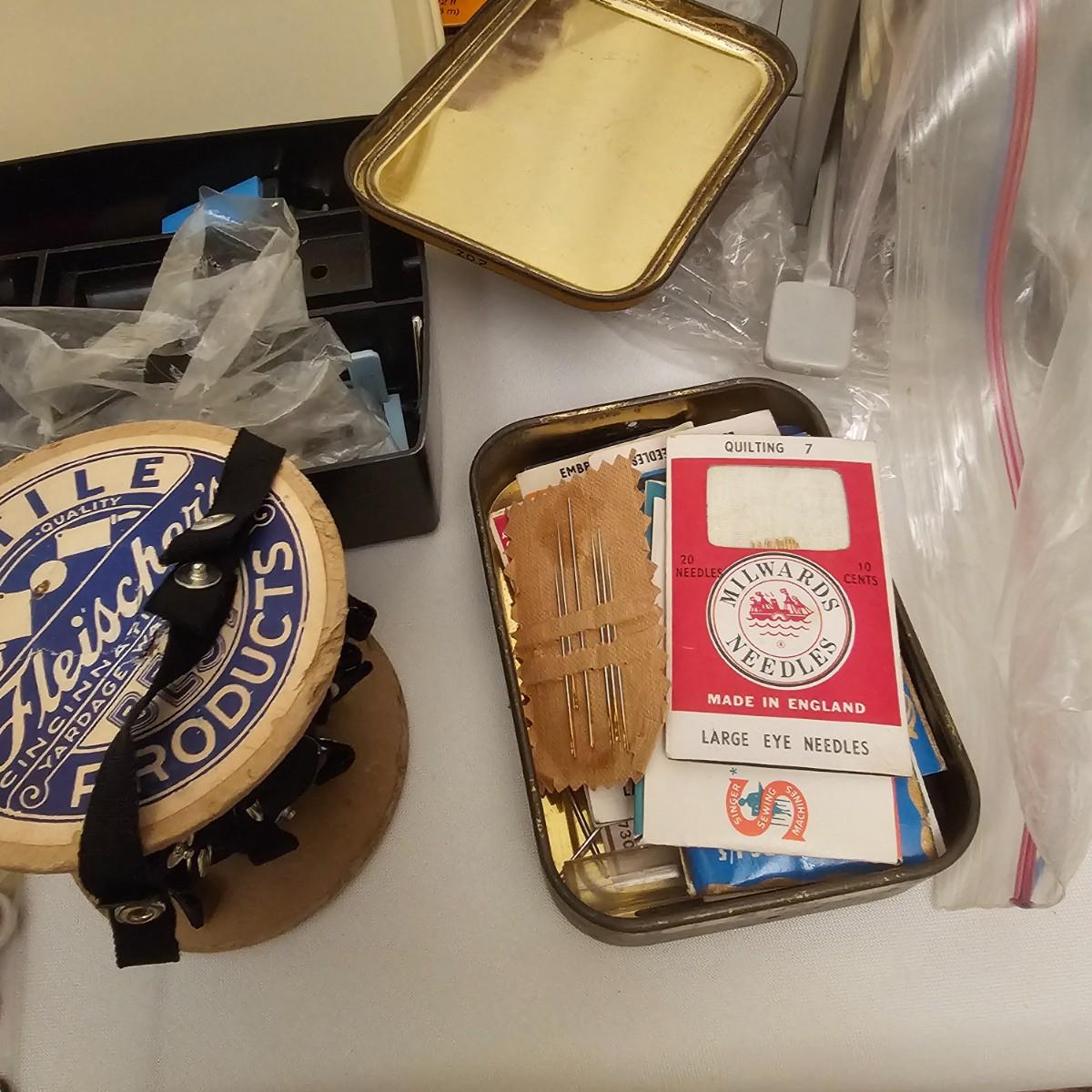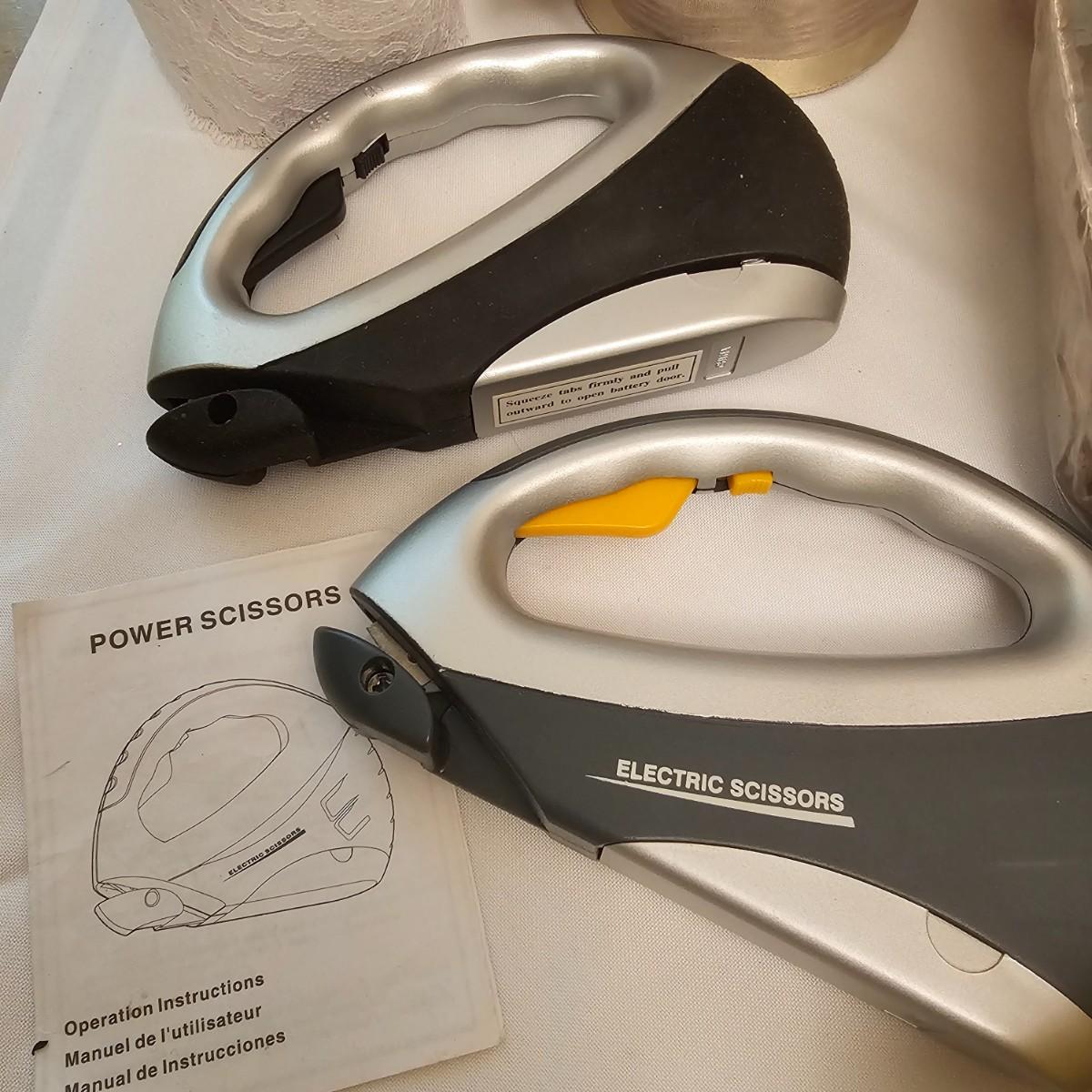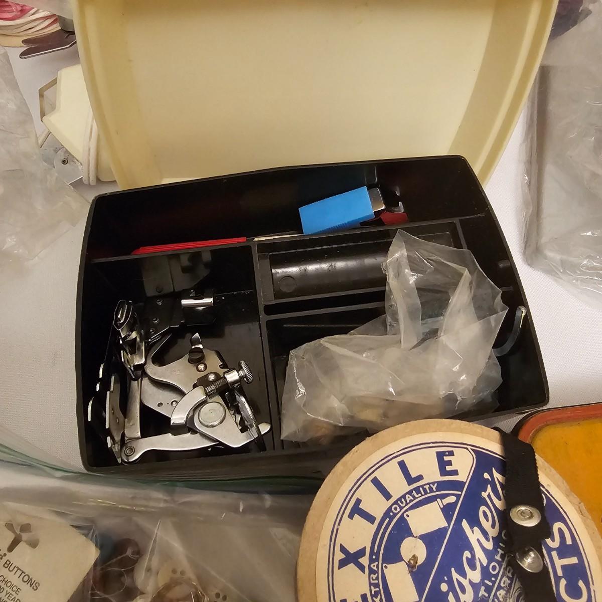Spools, cones, thread in all colors and types plus scissors, needles, ribbon and more. Older style spool stack racks with lots of different types of thread. Bags with miscellaneous sewing items in them. Four sets of electric scissors, two corded and two battery. All items powered on when tested. Some of the thread is older and might be brittle. See photos for details. Shipping available.