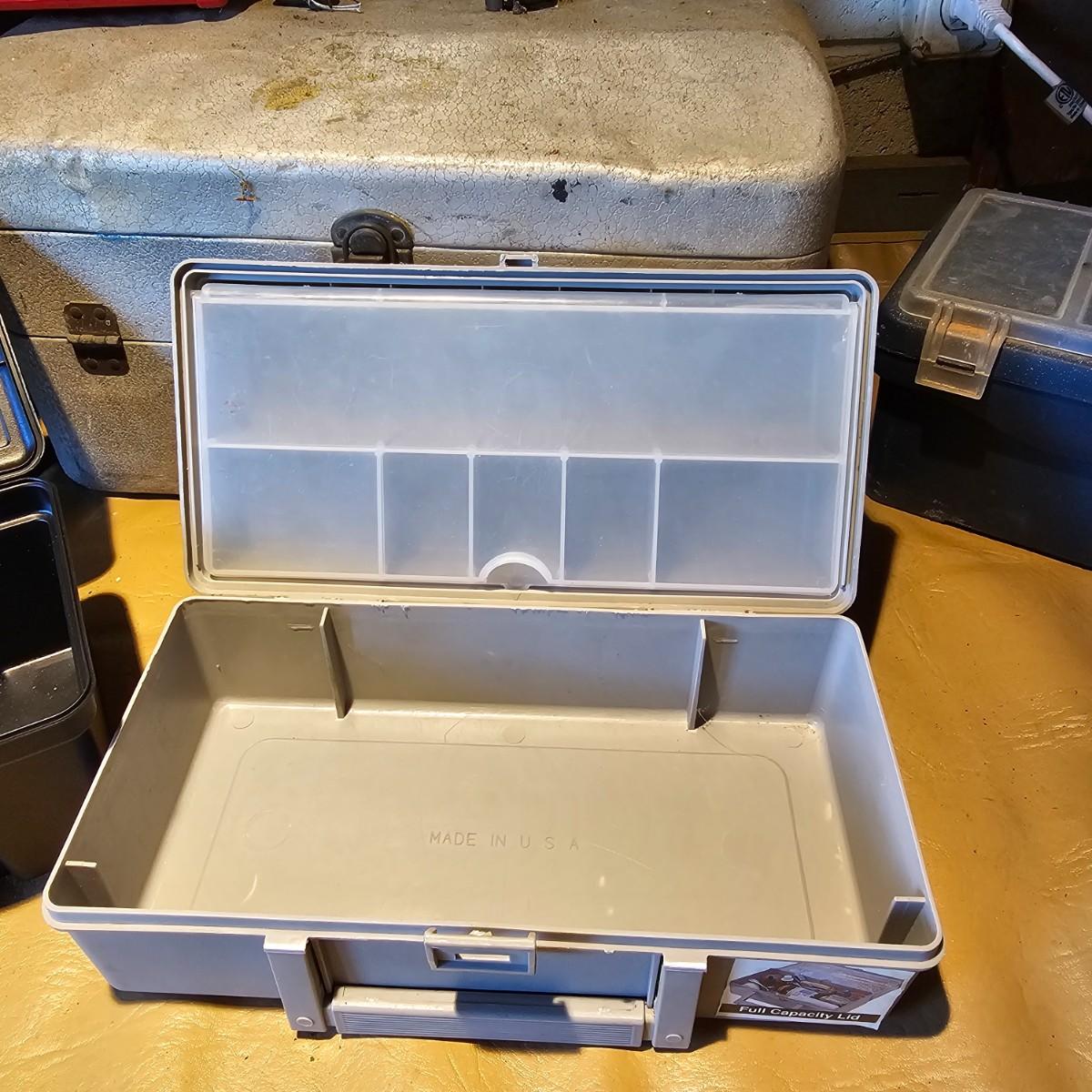 Nice collection of old and new toolboxes. Handmade wood item is 24" x 12" x 12"H. Craftsman box is 18" x 8" x 9"H, has removable deep tool tray. Silver box is probably a tacklebox, but useful for hardware as well. Smaller boxes are all plastic. Extra tool trays do not fit any of these, but are great for extra storage. Twelve pieces in all. See photos for details. Local pickup only.