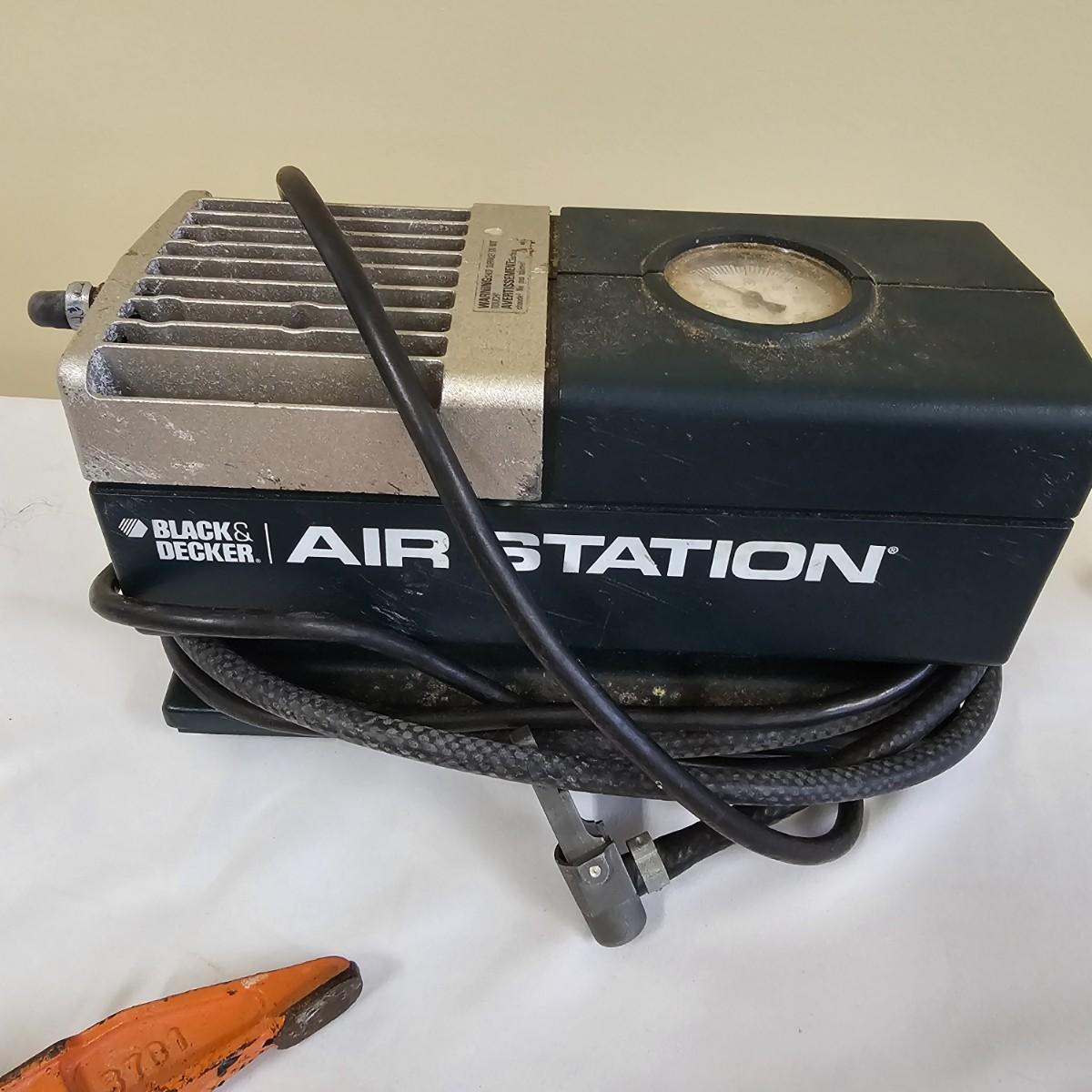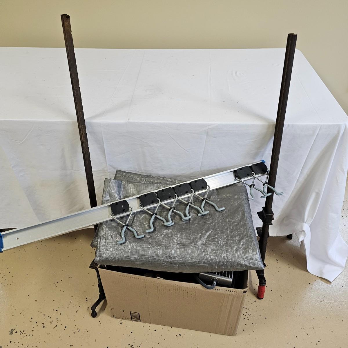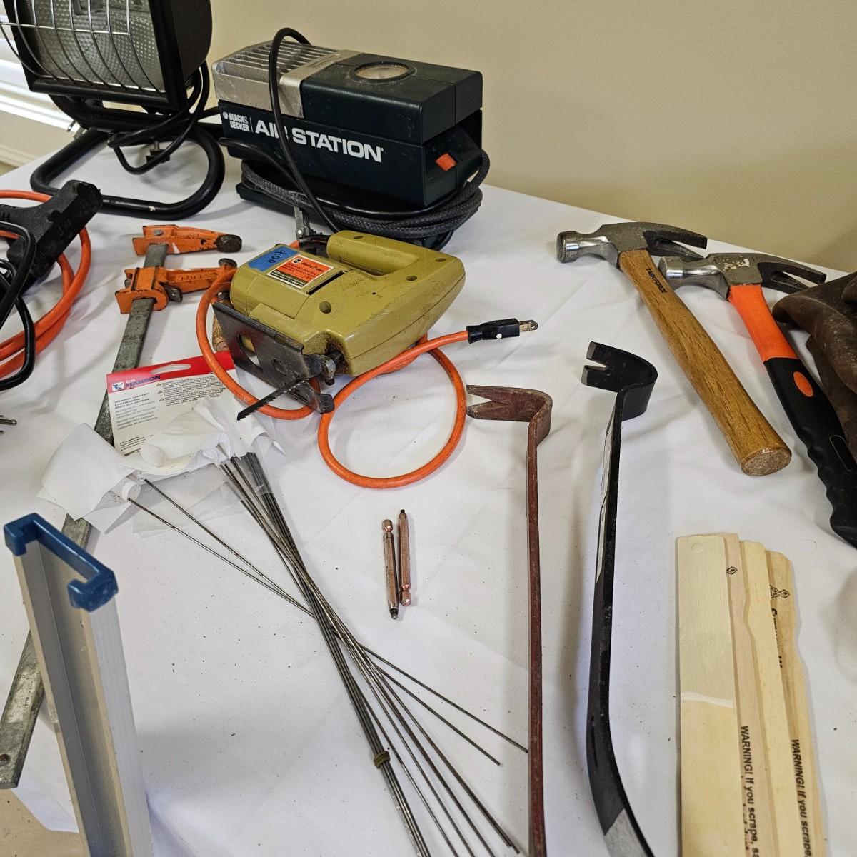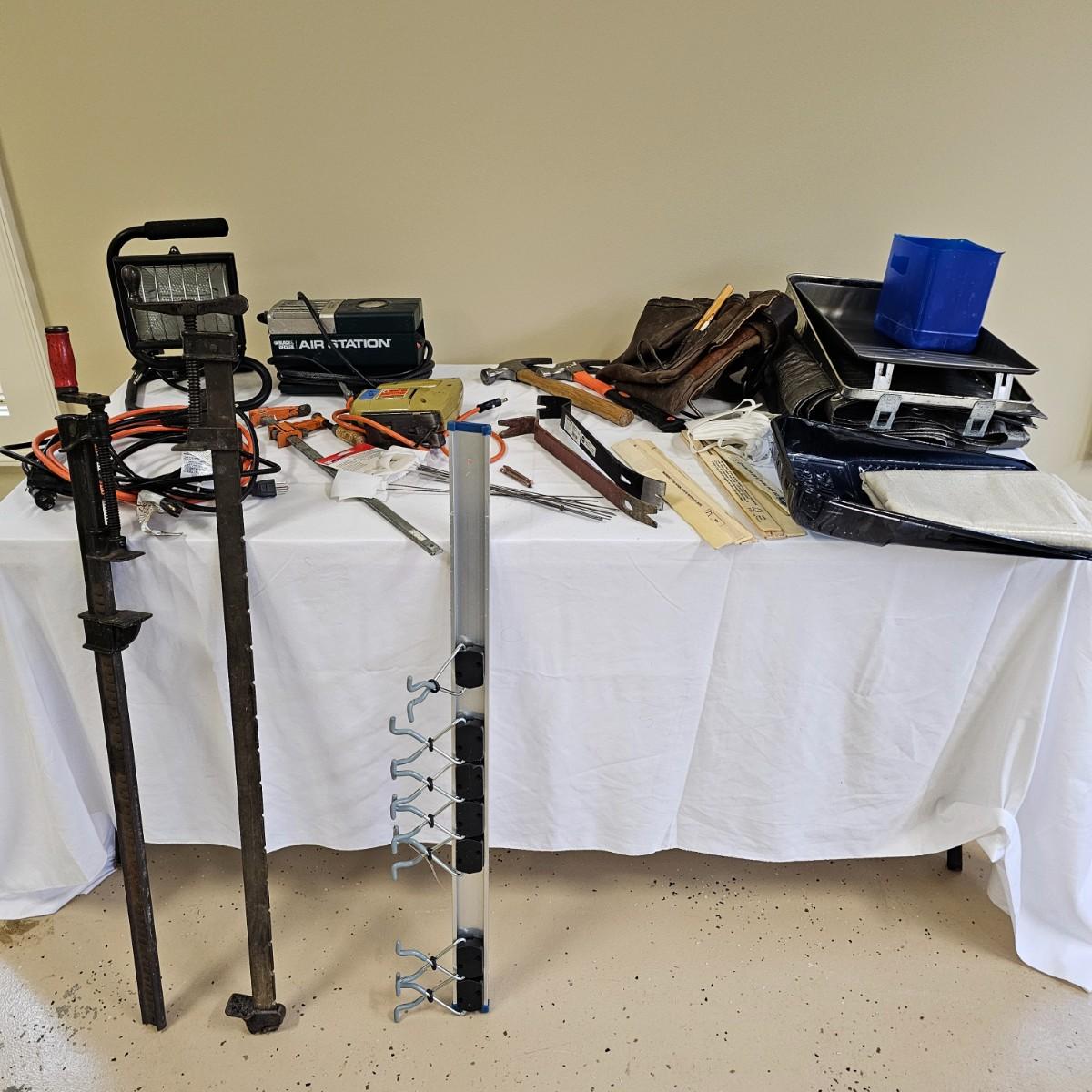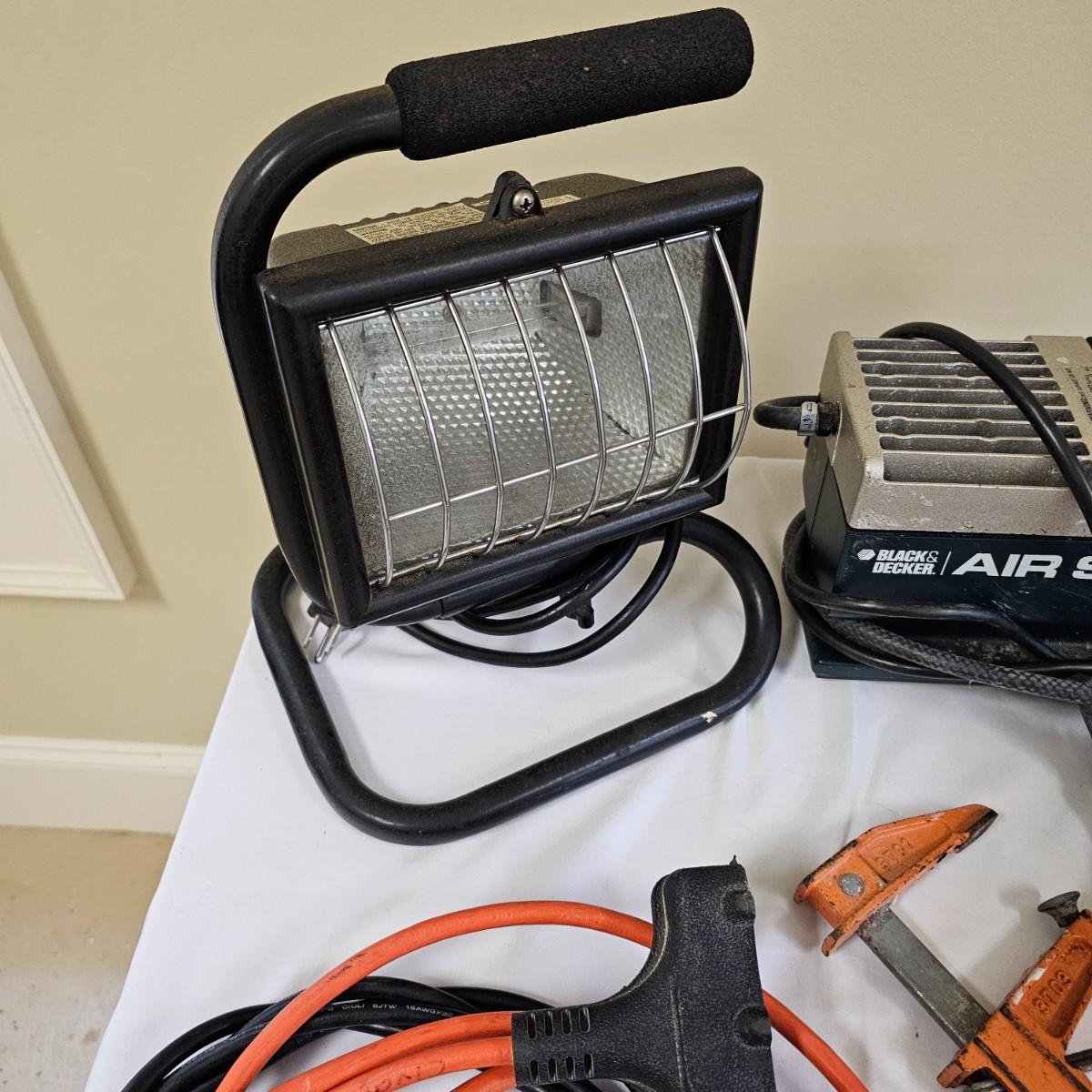 Small hand tools, some paint items, clamps, portable air compressor. One Black & Decker air station portable compressor. One portable halogen work light with stand. A Black & Decker electric jigsaw. Paint trays, stir sticks, three bar clamps, 20", 36", and 40" long. A wall rack to hang tools on. One 92" x 116" tarp, small holes. All electrical items powered on when plugged in. See photos for details. Local pickup only.