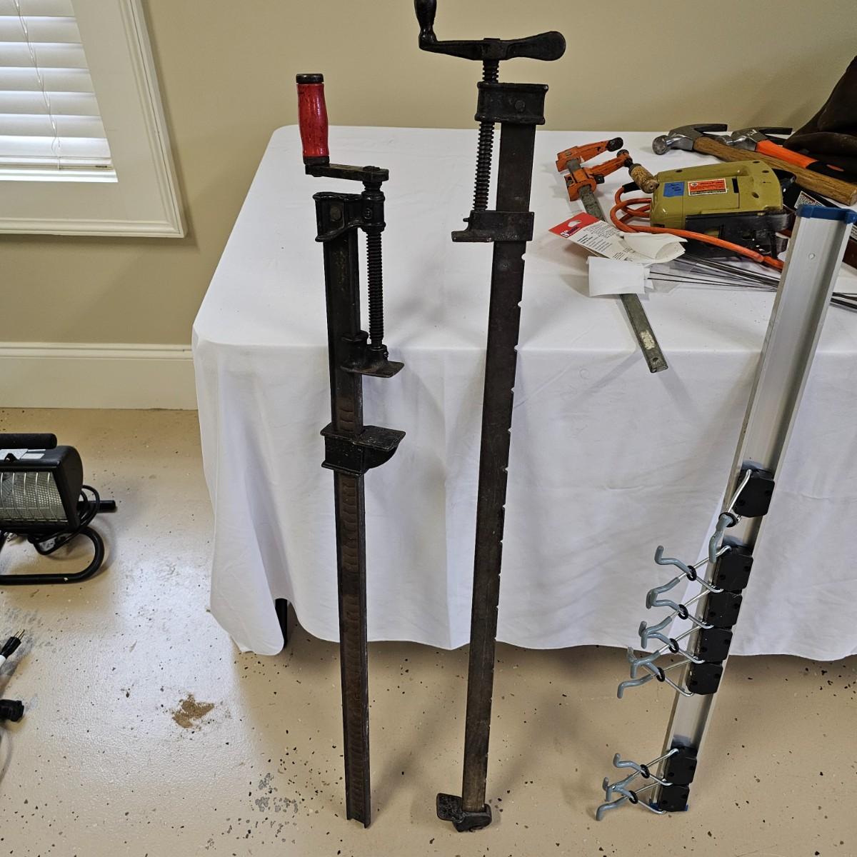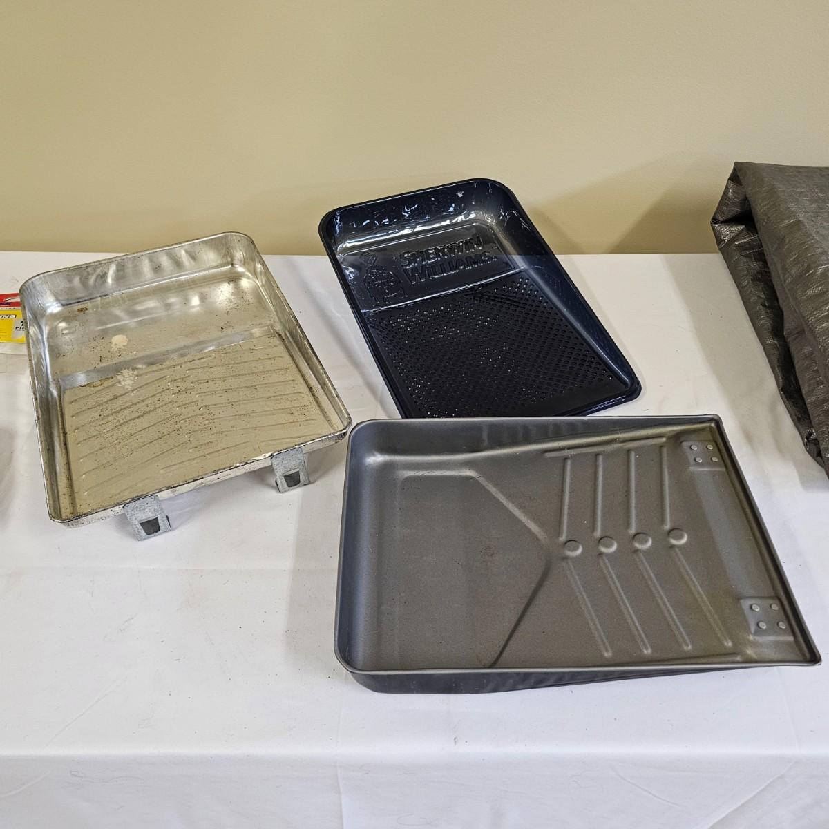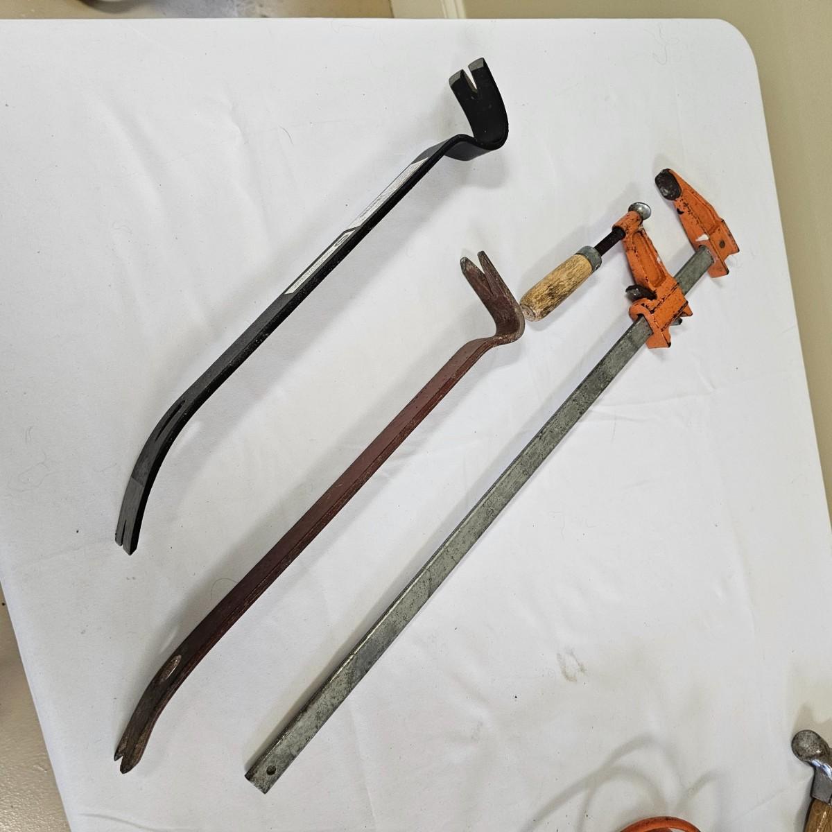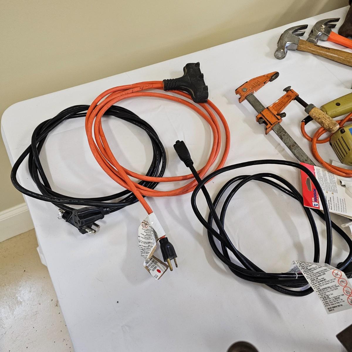 Small hand tools, some paint items, clamps, portable air compressor. One Black & Decker air station portable compressor. One portable halogen work light with stand. A Black & Decker electric jigsaw. Paint trays, stir sticks, three bar clamps, 20", 36", and 40" long. A wall rack to hang tools on. One 92" x 116" tarp, small holes. All electrical items powered on when plugged in. See photos for details. Local pickup only.