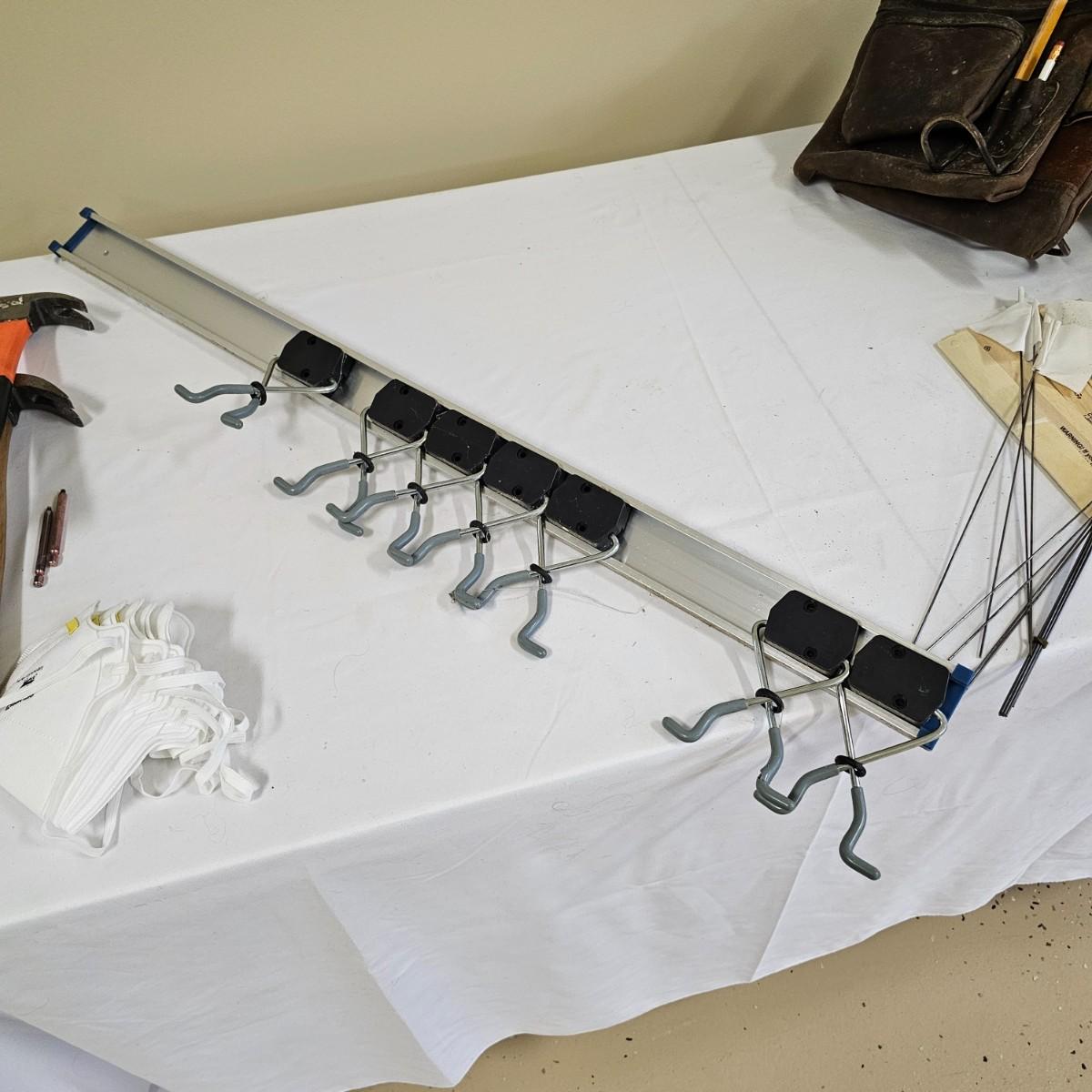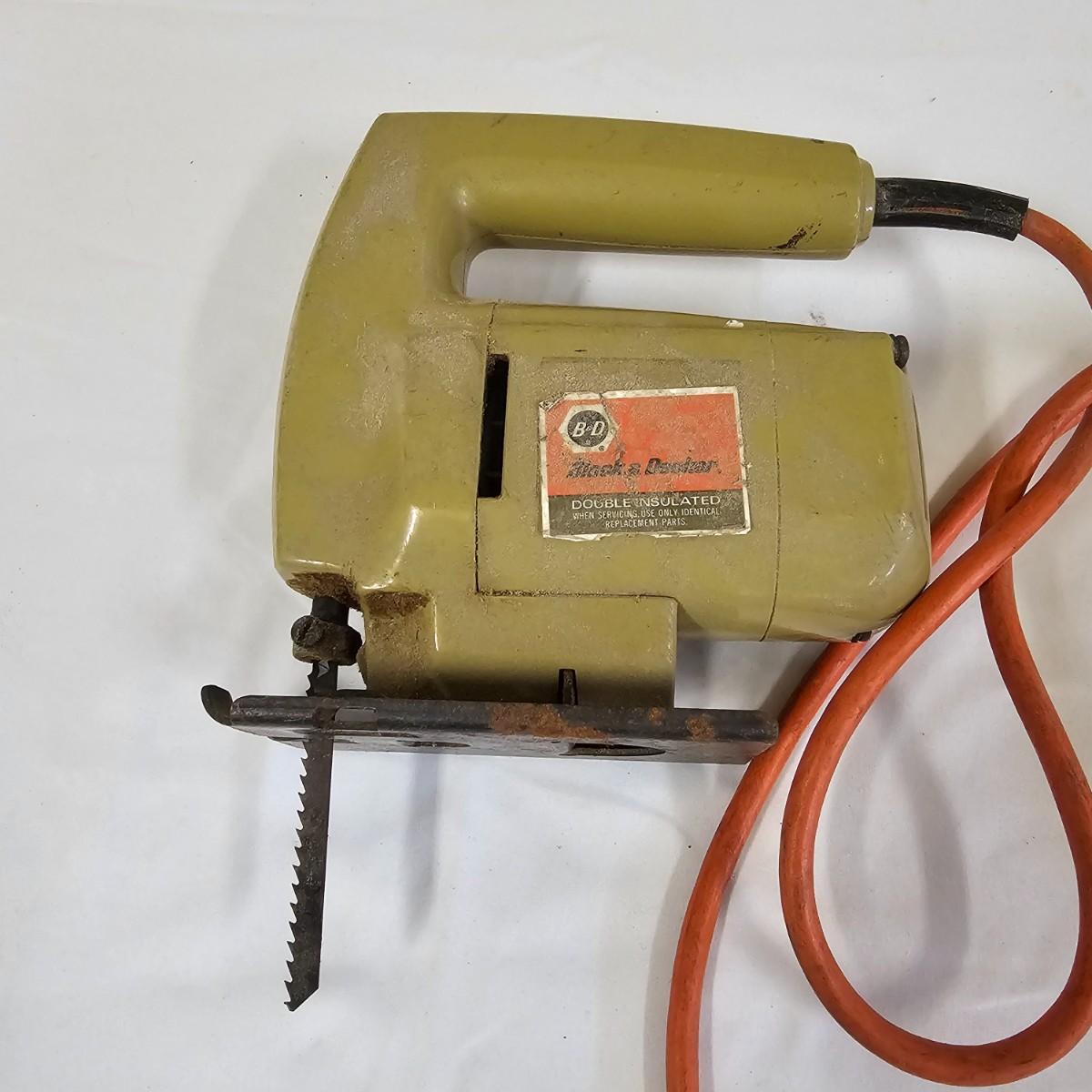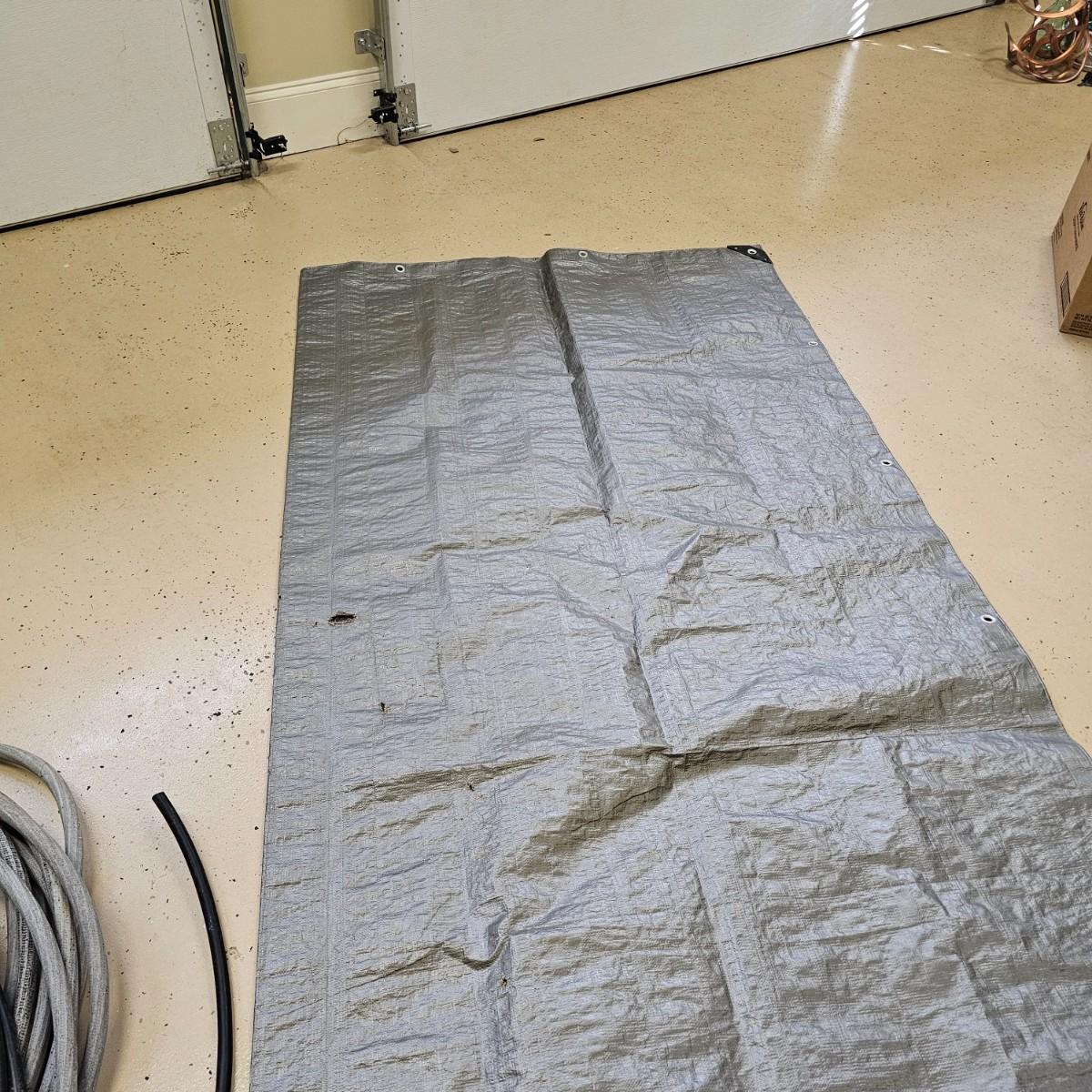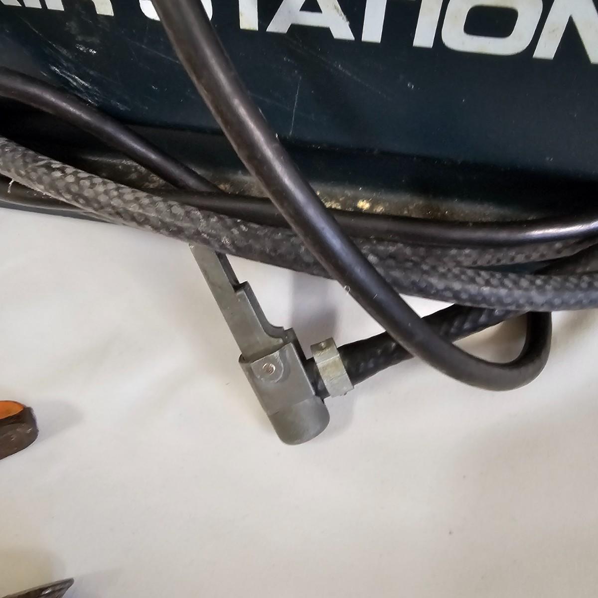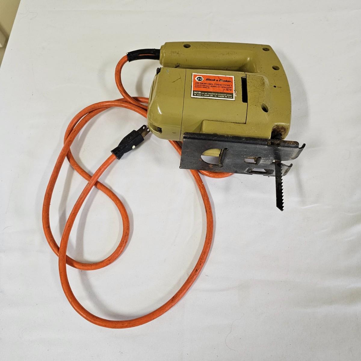 Small hand tools, some paint items, clamps, portable air compressor. One Black & Decker air station portable compressor. One portable halogen work light with stand. A Black & Decker electric jigsaw. Paint trays, stir sticks, three bar clamps, 20", 36", and 40" long. A wall rack to hang tools on. One 92" x 116" tarp, small holes. All electrical items powered on when plugged in. See photos for details. Local pickup only.