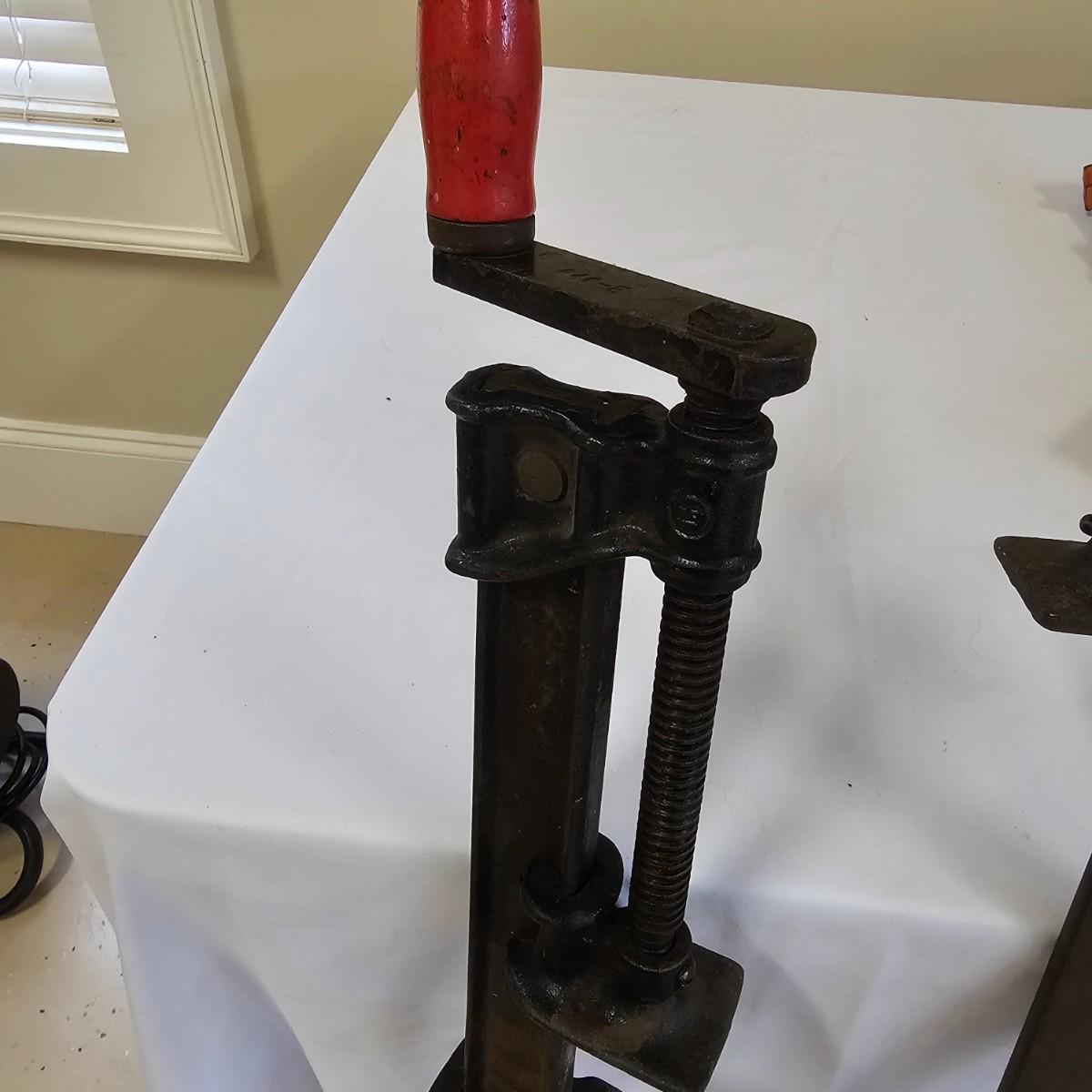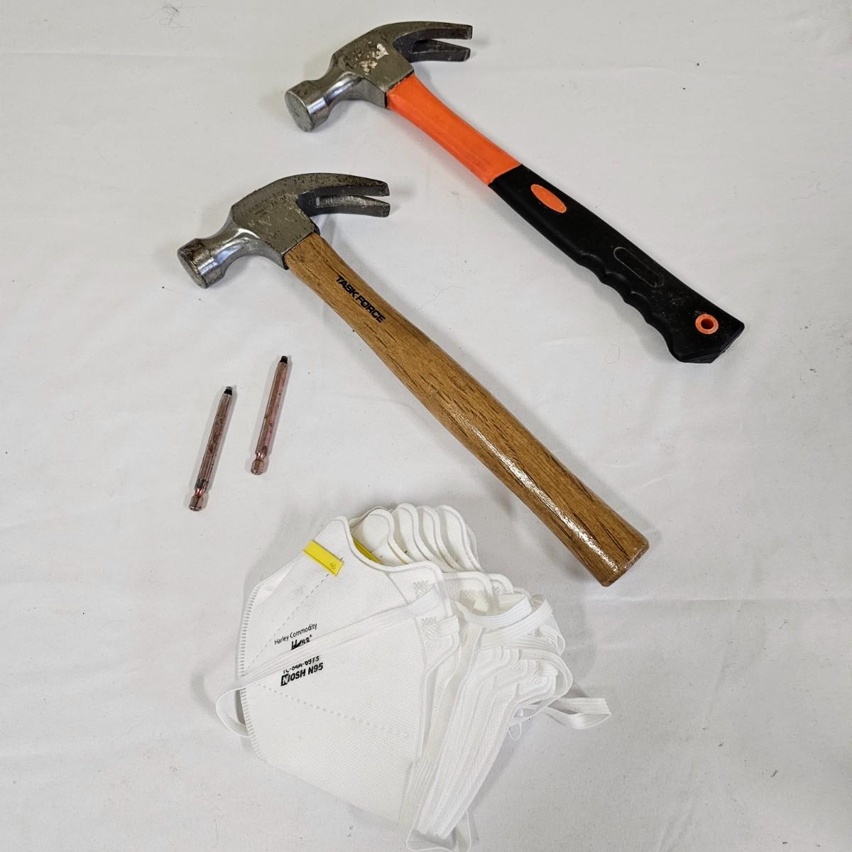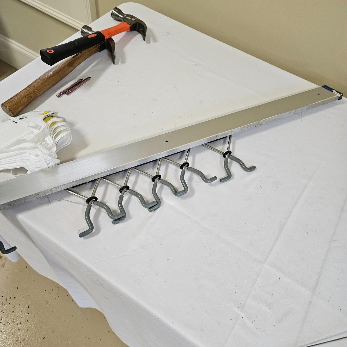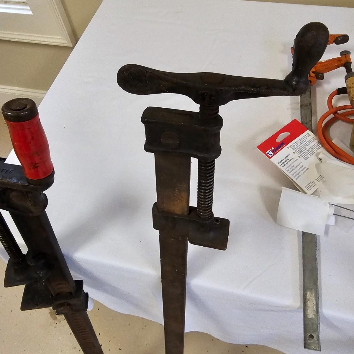 Small hand tools, some paint items, clamps, portable air compressor. One Black & Decker air station portable compressor. One portable halogen work light with stand. A Black & Decker electric jigsaw. Paint trays, stir sticks, three bar clamps, 20", 36", and 40" long. A wall rack to hang tools on. One 92" x 116" tarp, small holes. All electrical items powered on when plugged in. See photos for details. Local pickup only.