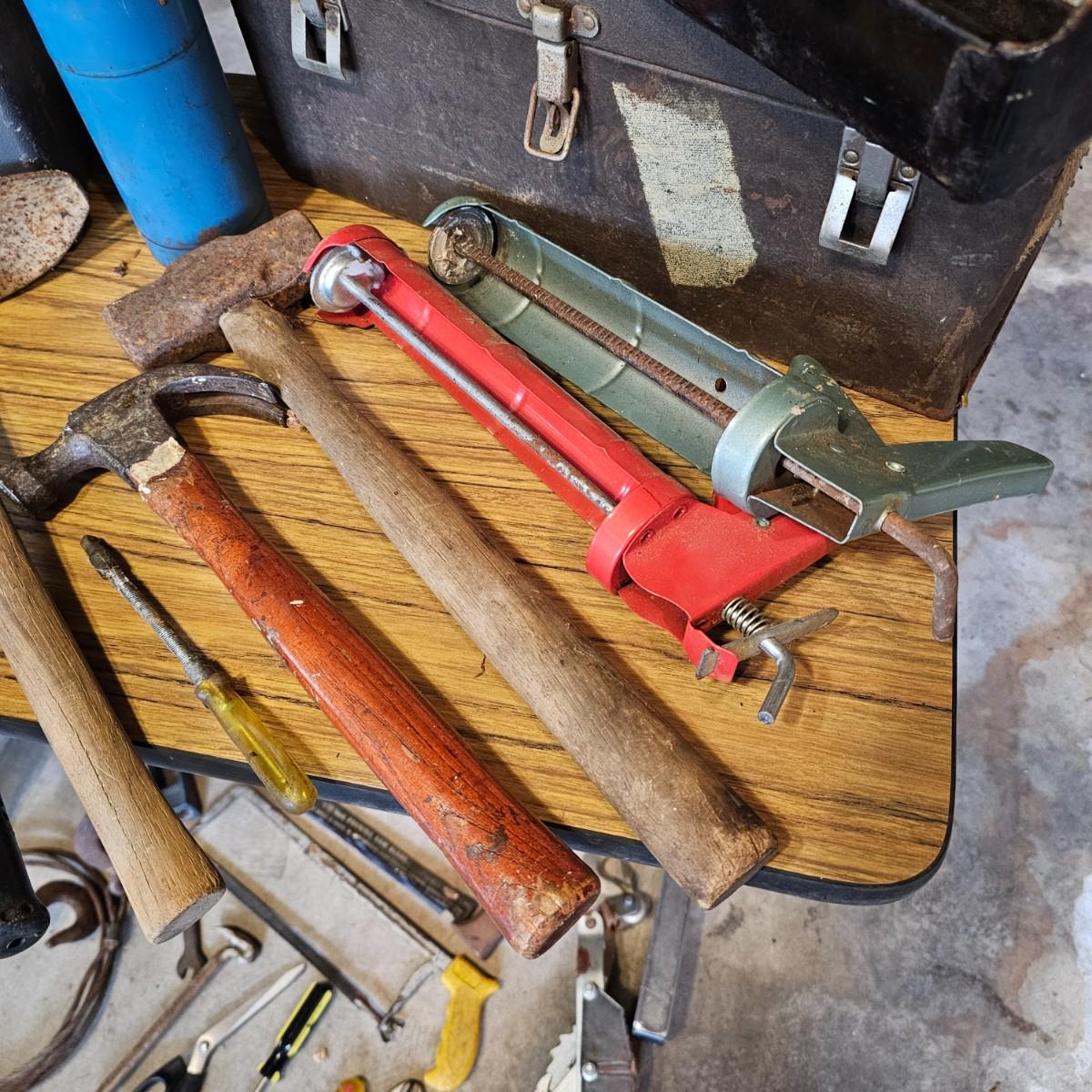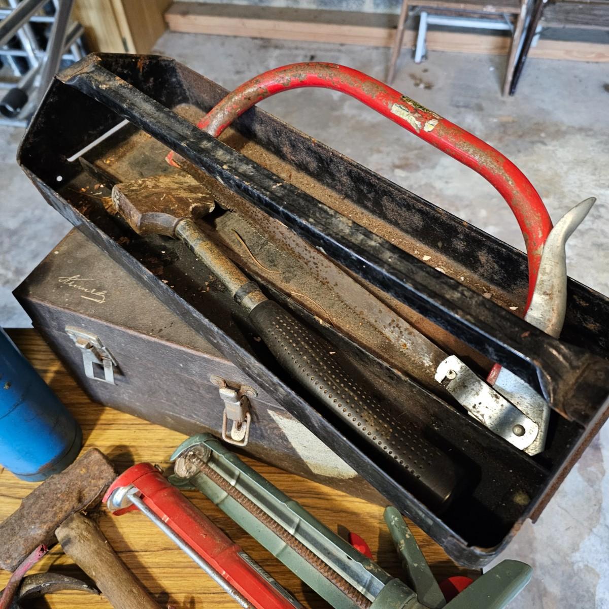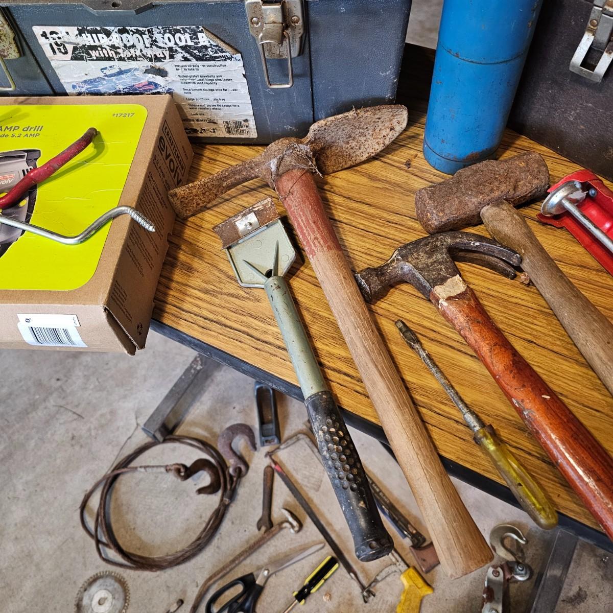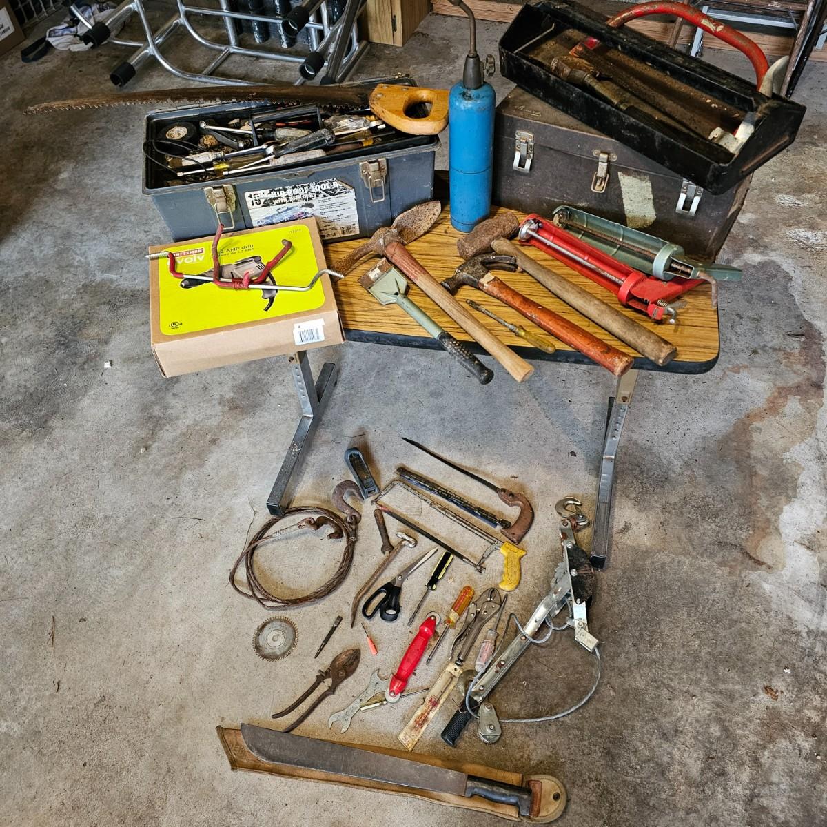 Two toolboxes and assorted hand tools. Stack-On box is 19" x 9" x 9"H, has lift out tray. Machete is 23" long, has military sheath labeled 'spare barrel'. One propane torch, pliers, screwdrivers, wrenches and more. One Sears Evolv electric drill, powered on when plugged in. Scrapers, caulk guns and more. See photos for details. Local pickup only.