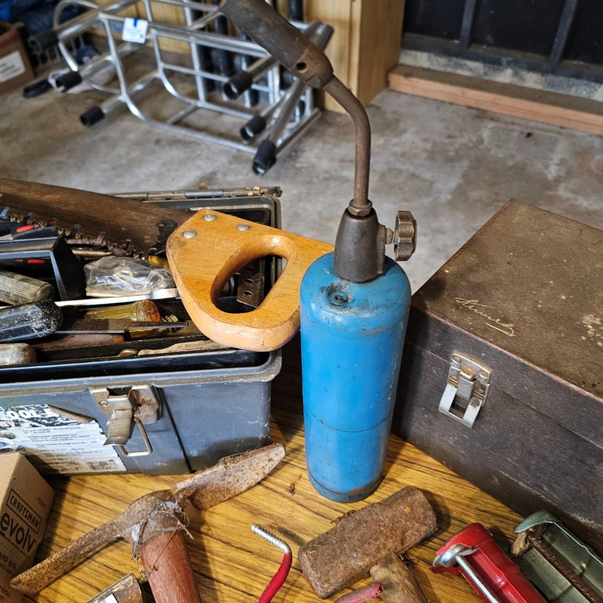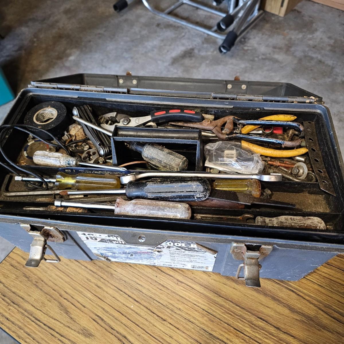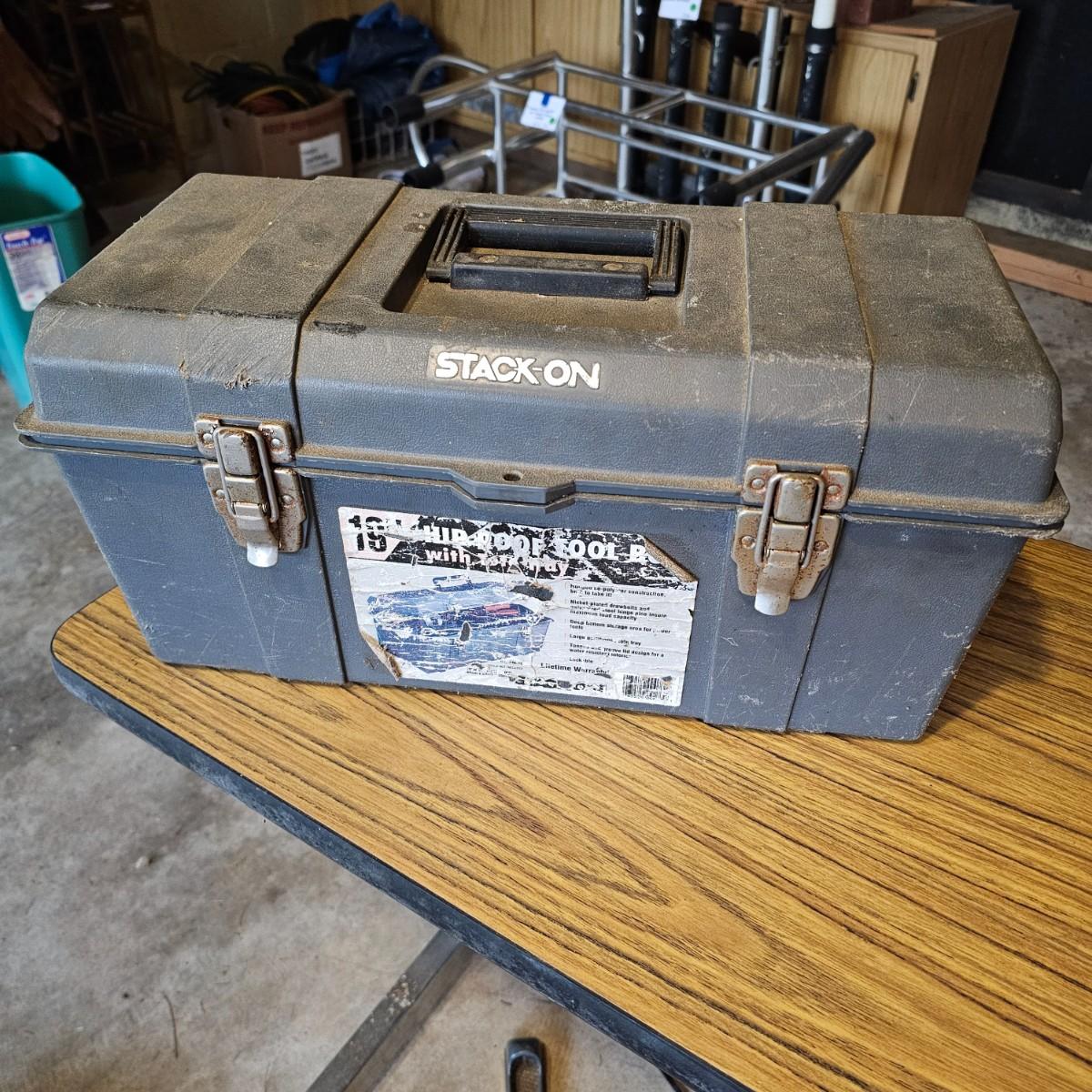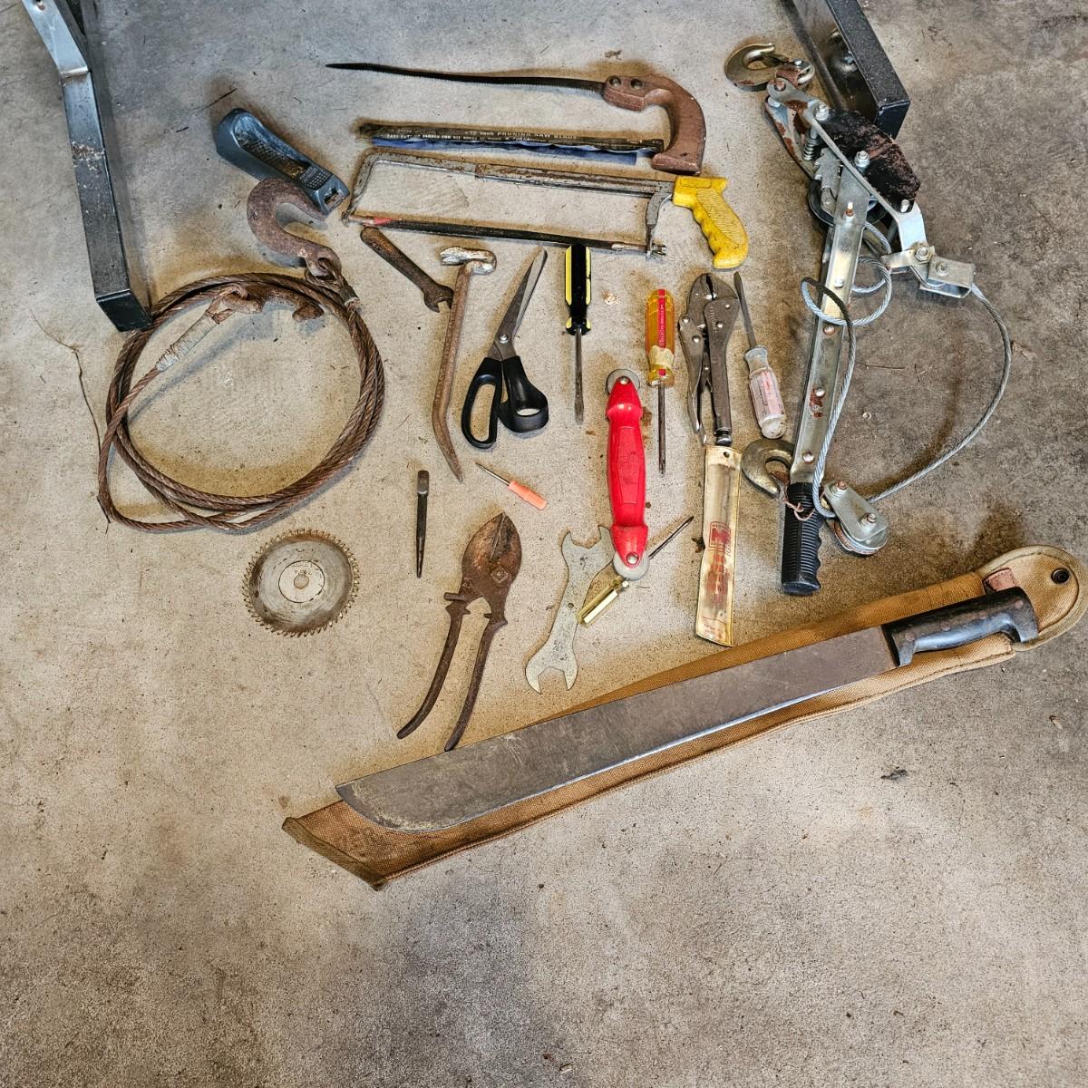 Two toolboxes and assorted hand tools. Stack-On box is 19" x 9" x 9"H, has lift out tray. Machete is 23" long, has military sheath labeled 'spare barrel'. One propane torch, pliers, screwdrivers, wrenches and more. One Sears Evolv electric drill, powered on when plugged in. Scrapers, caulk guns and more. See photos for details. Local pickup only.