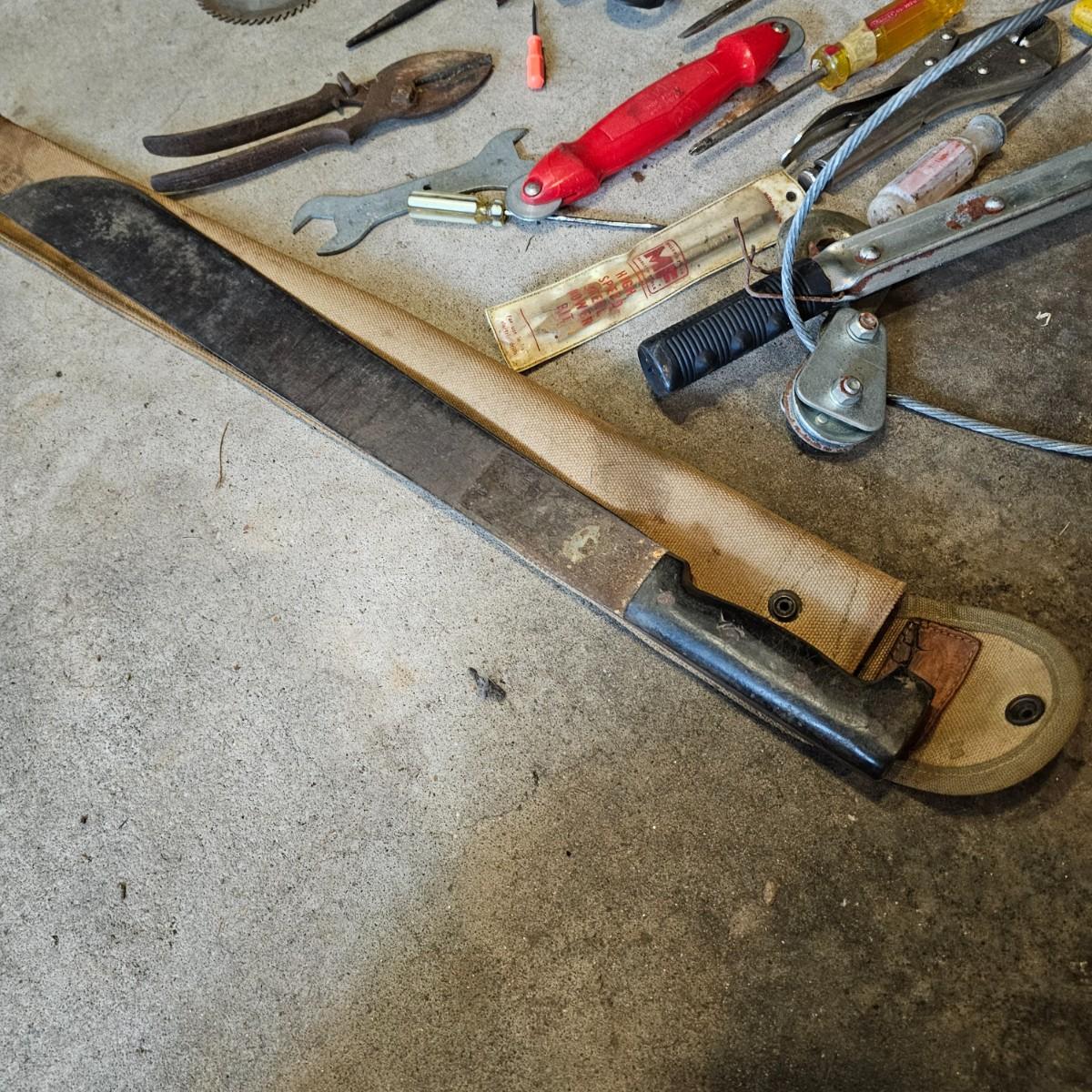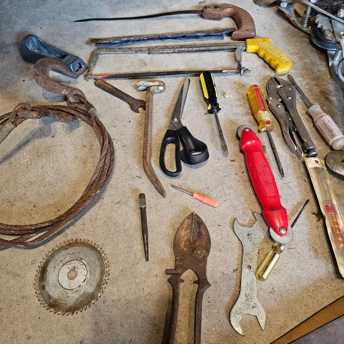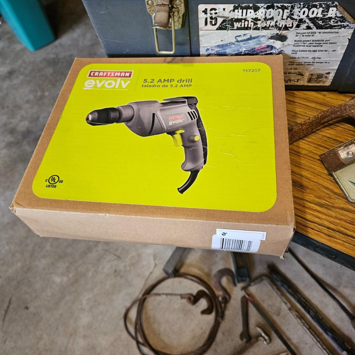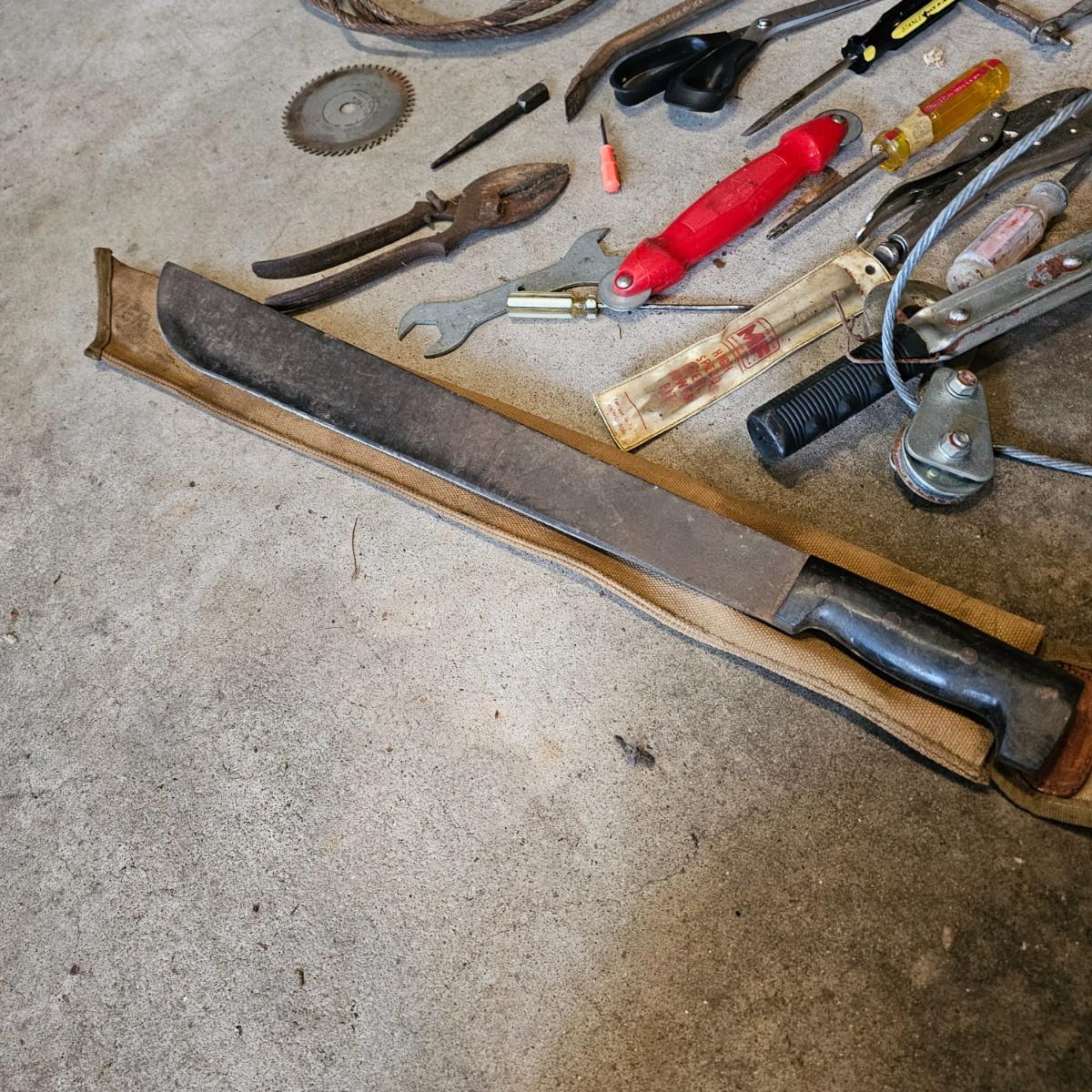 Two toolboxes and assorted hand tools. Stack-On box is 19" x 9" x 9"H, has lift out tray. Machete is 23" long, has military sheath labeled 'spare barrel'. One propane torch, pliers, screwdrivers, wrenches and more. One Sears Evolv electric drill, powered on when plugged in. Scrapers, caulk guns and more. See photos for details. Local pickup only.
