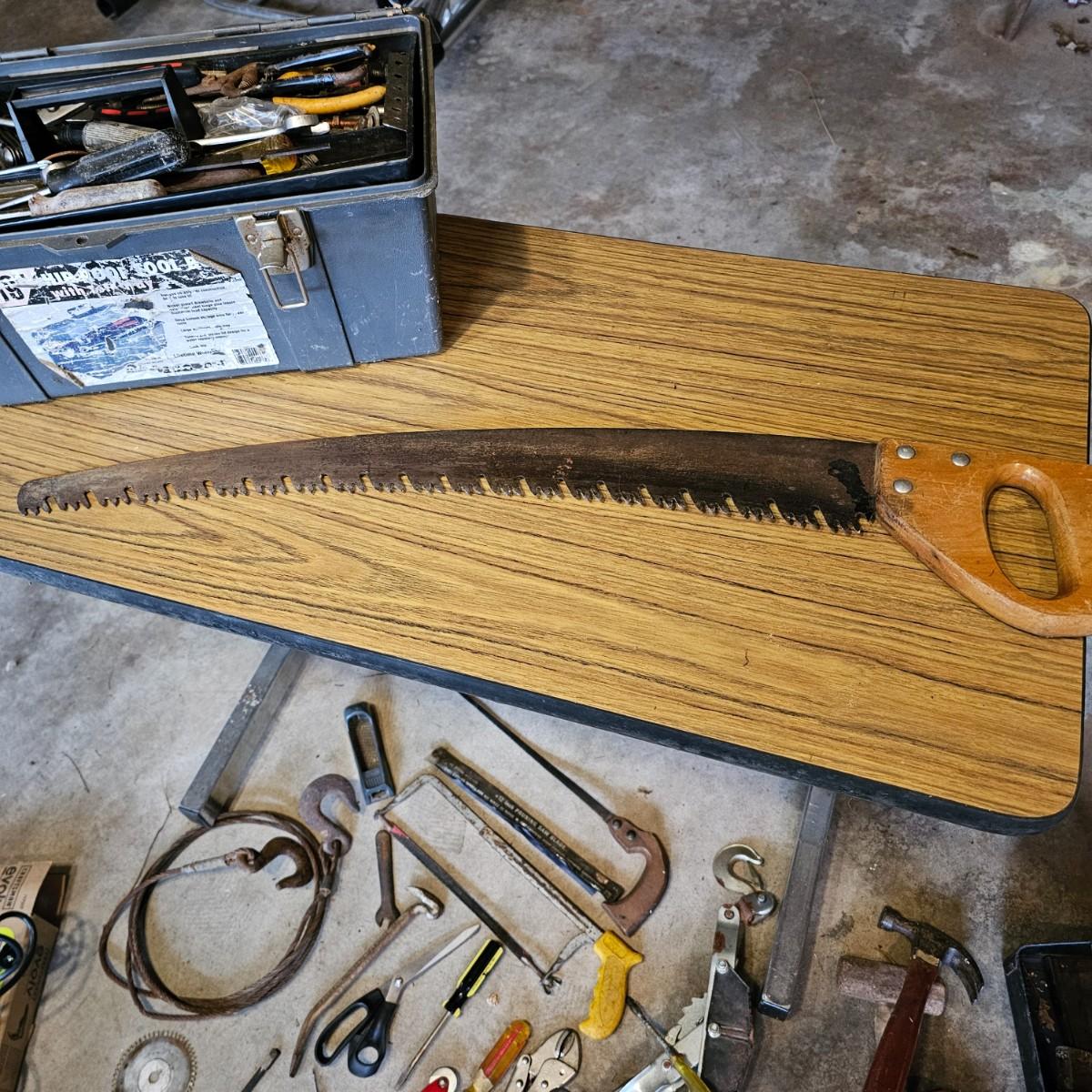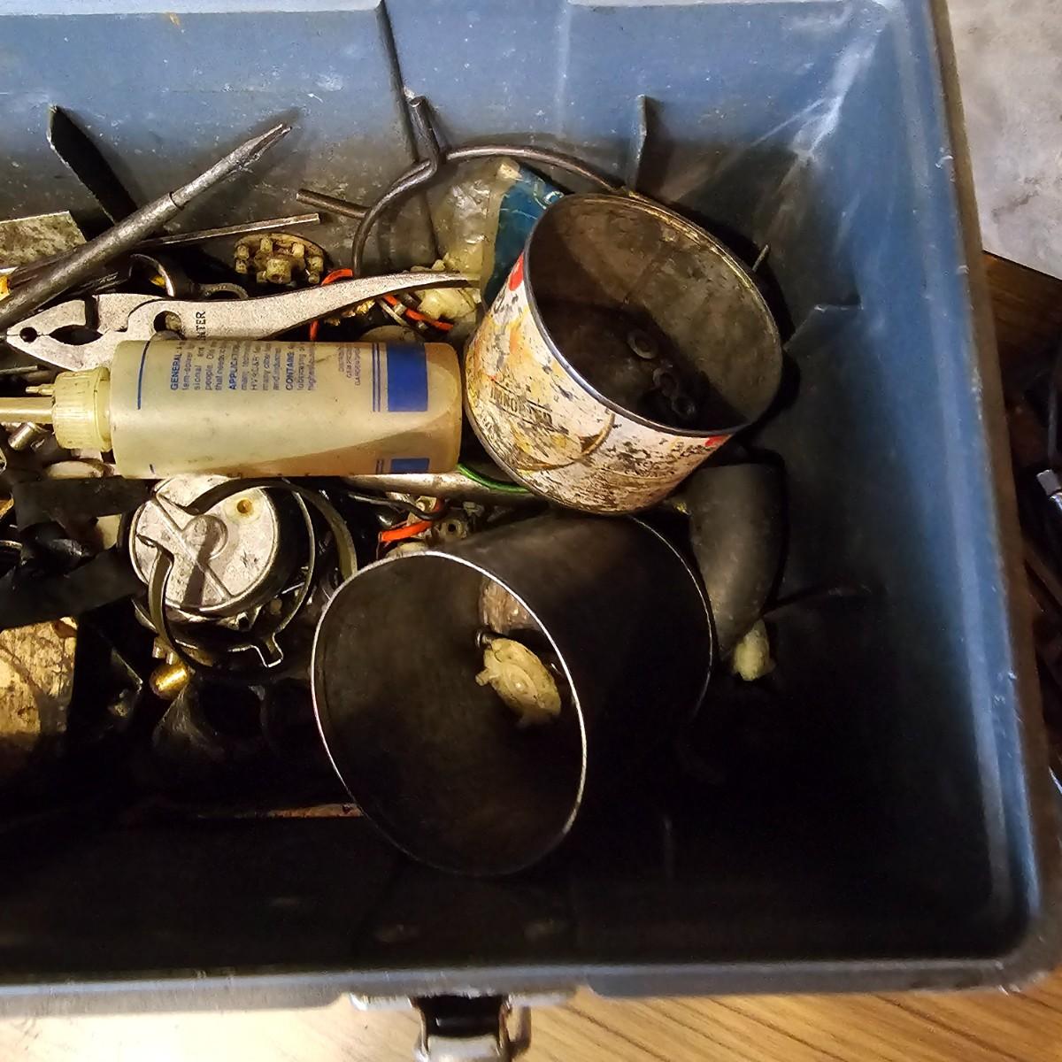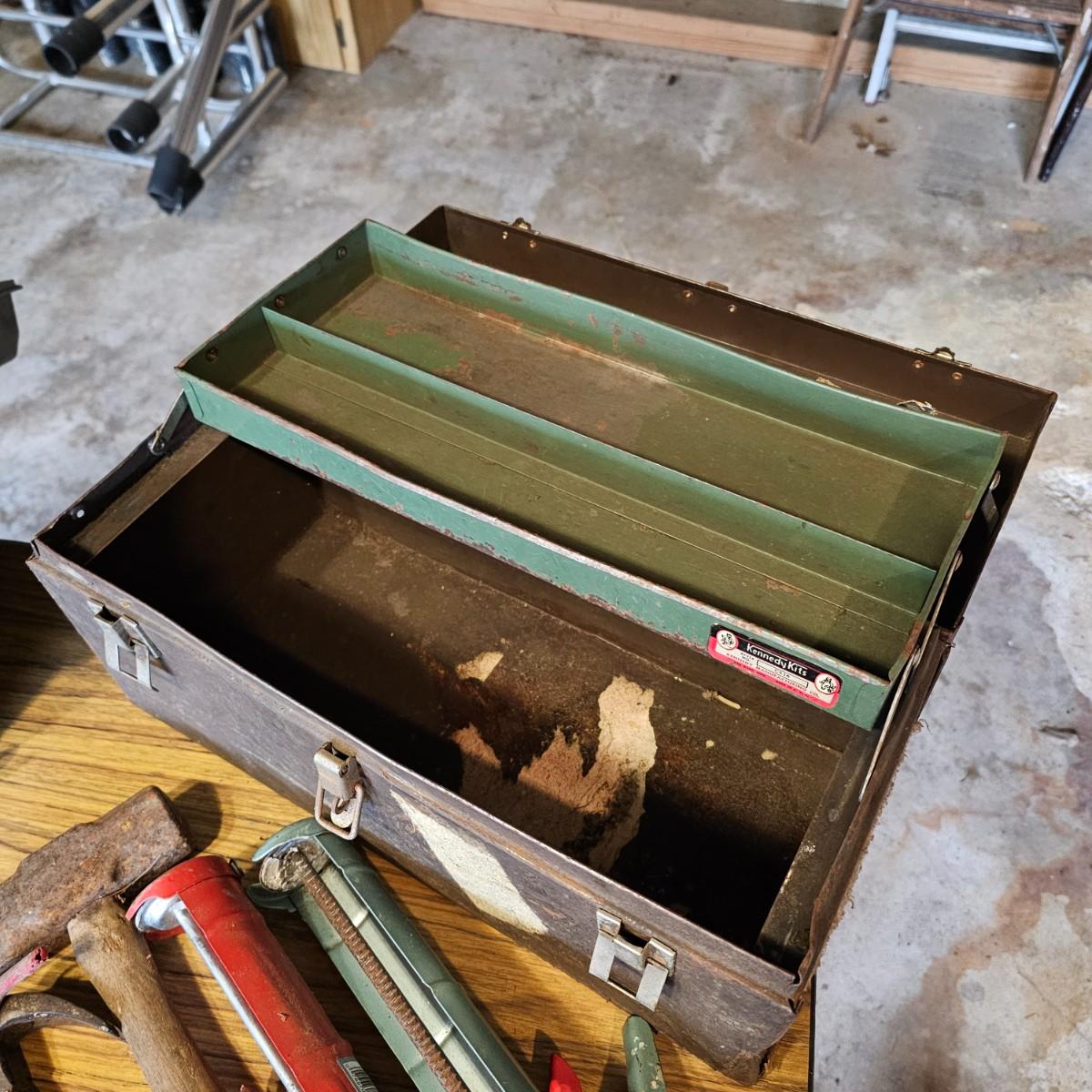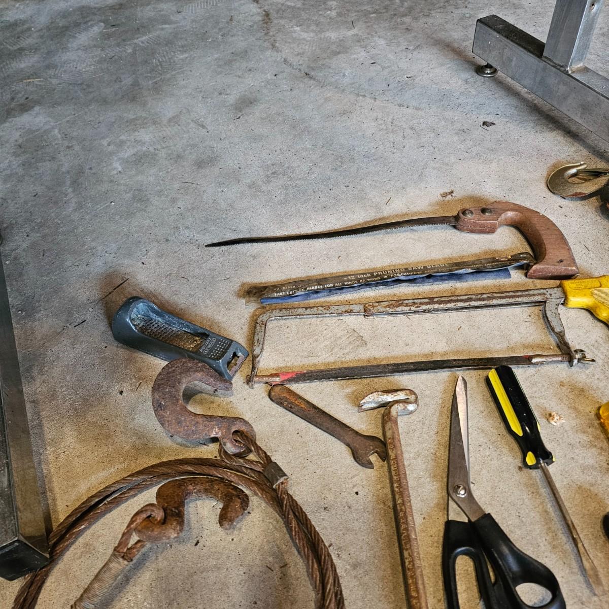Two toolboxes and assorted hand tools. Stack-On box is 19" x 9" x 9"H, has lift out tray. Machete is 23" long, has military sheath labeled 'spare barrel'. One propane torch, pliers, screwdrivers, wrenches and more. One Sears Evolv electric drill, powered on when plugged in. Scrapers, caulk guns and more. See photos for details. Local pickup only.