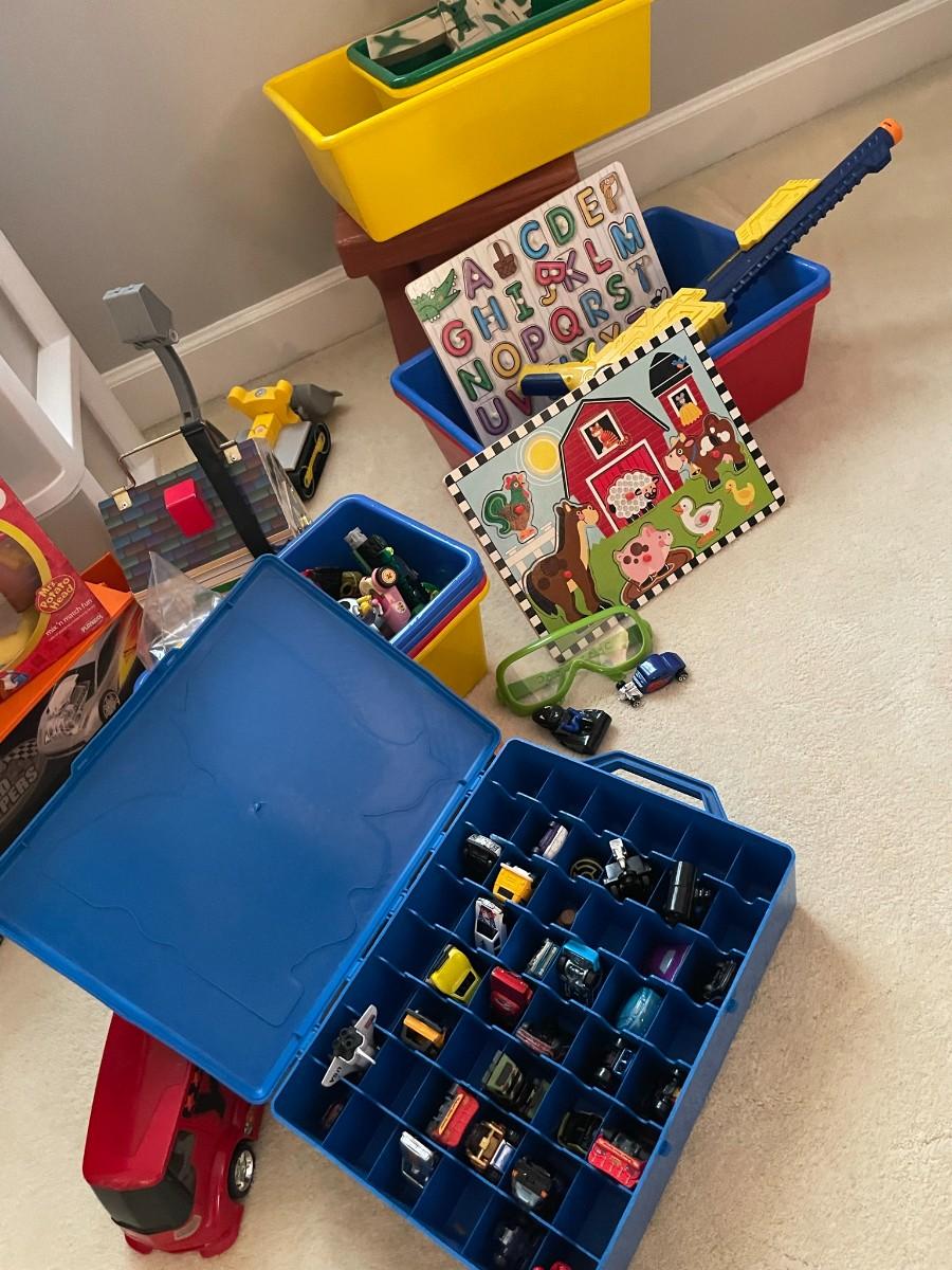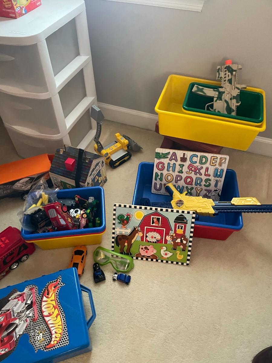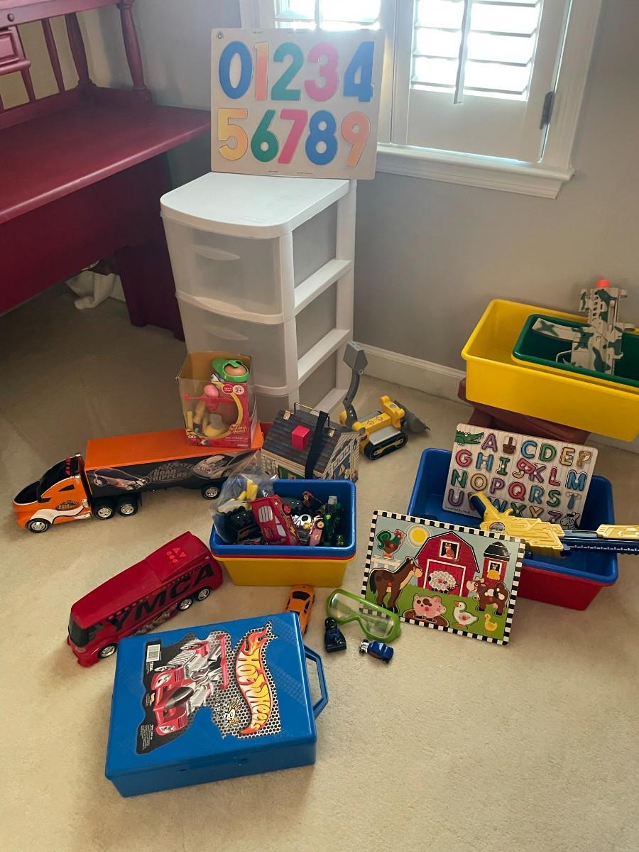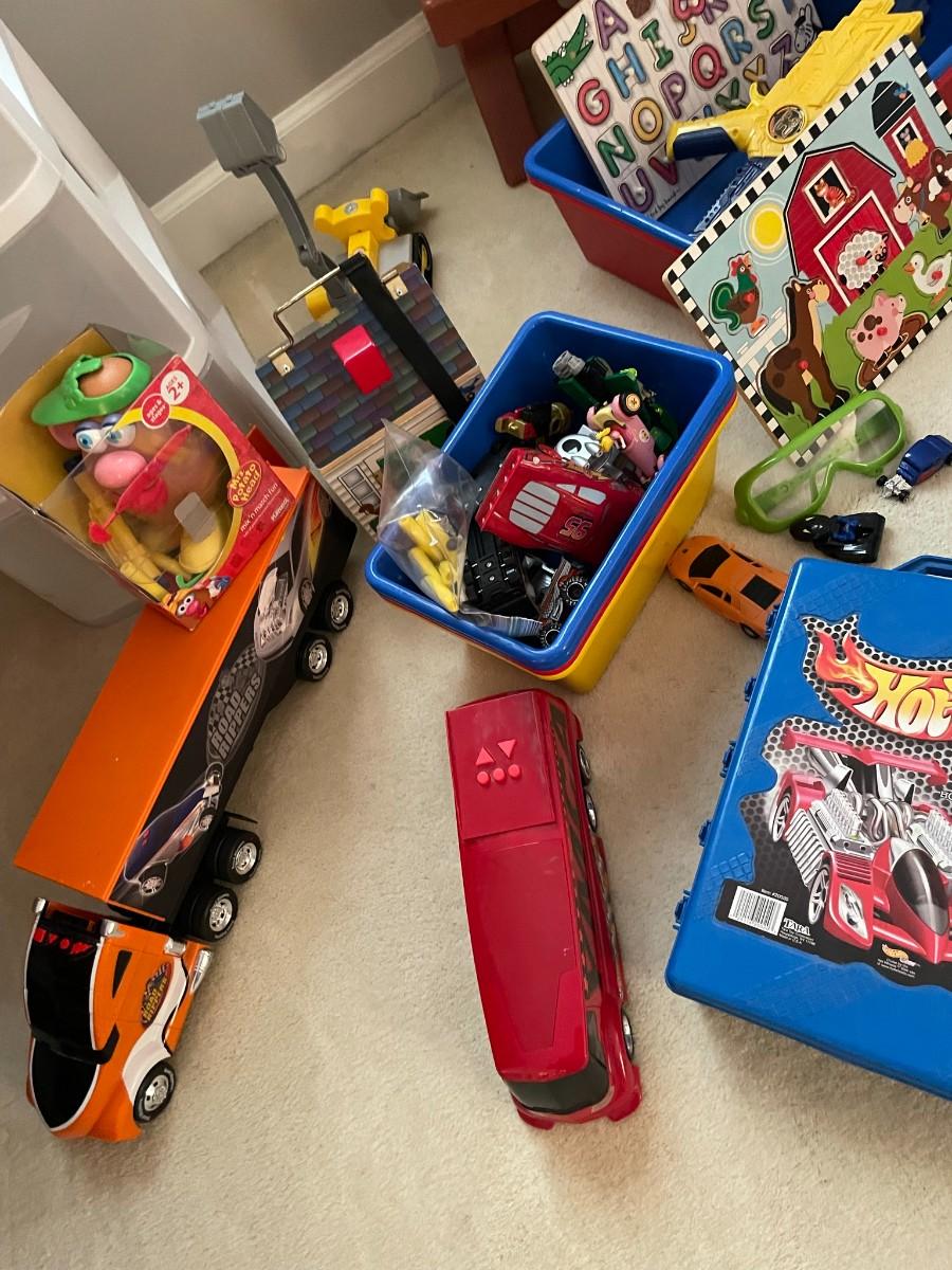 Assorted Toys, Hot Wheels, Puzzles, Potato Head, Trucks, storage Bin, small stool, etc. as shown.