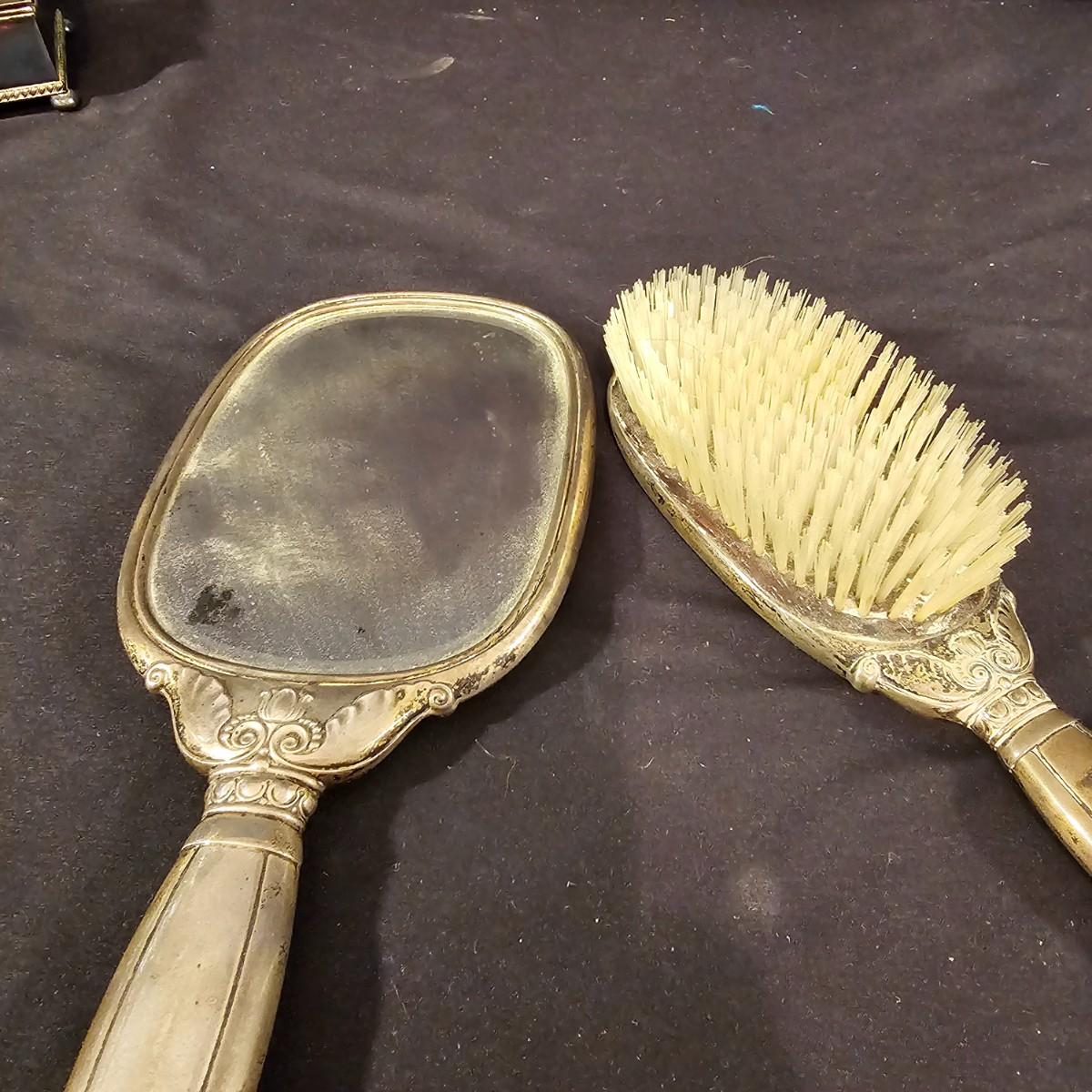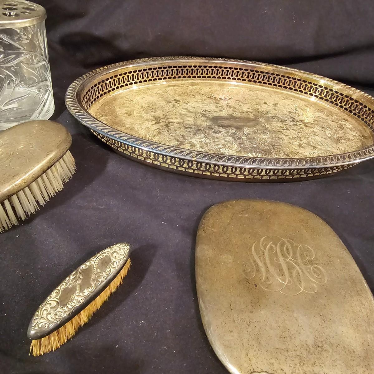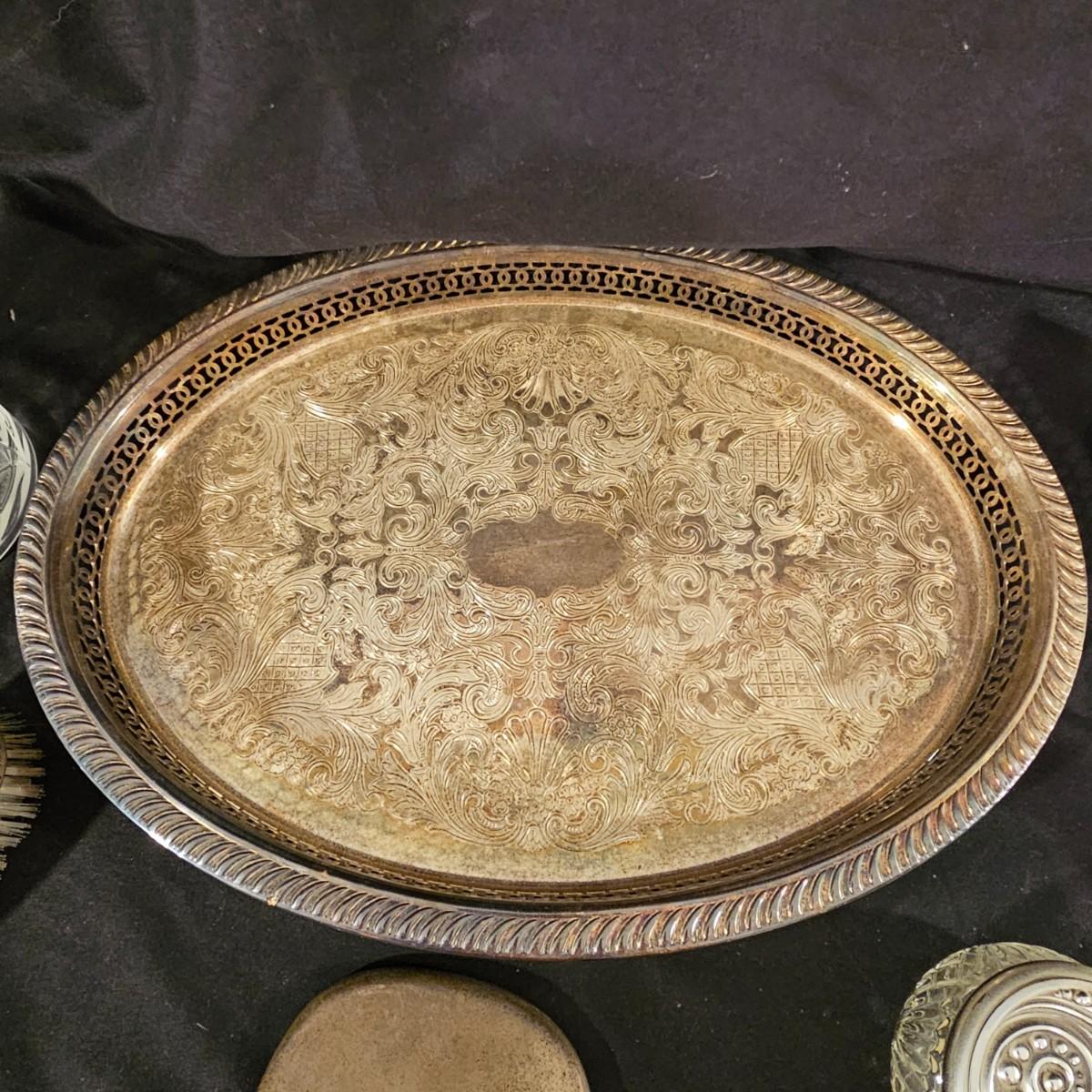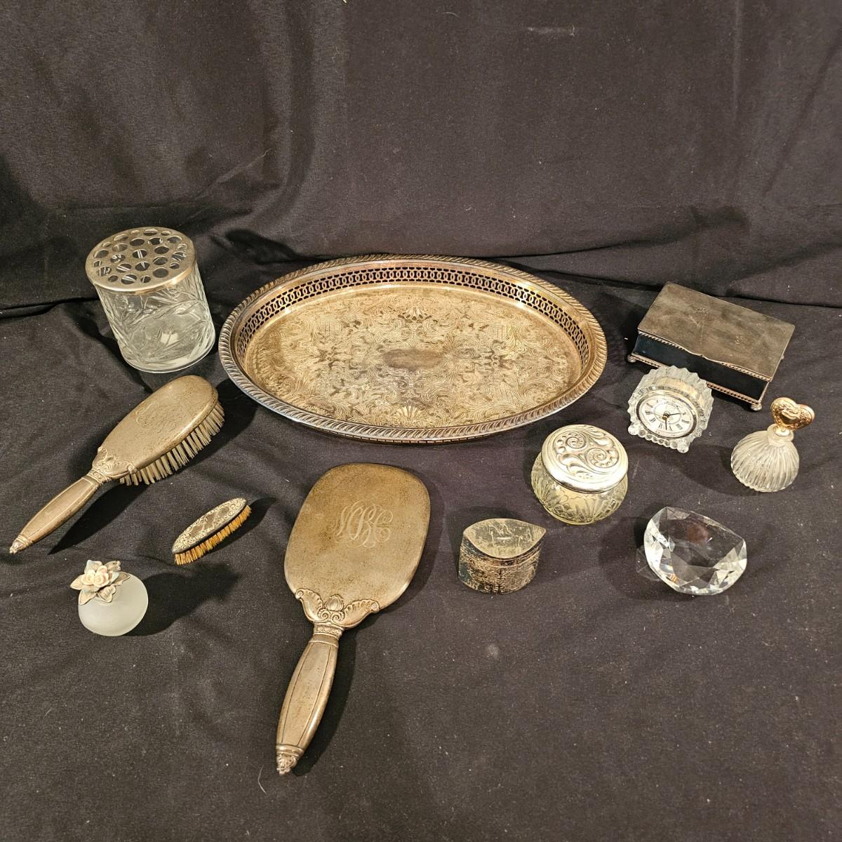 Engraved tray and several items for use on a vanity setup. Mirror, brushes, perfume bottles, small clock, more. Tray measures 16" x 11.5", is marked Towle EP on back. Silver colored box is 5.5" x 4" x 2"H, has multiple makers marks stamped in bottom. Hand mirror is 5" x 11". Smallest brush is marked sterling on top. Other known markings are shown in photos. Shipping available.