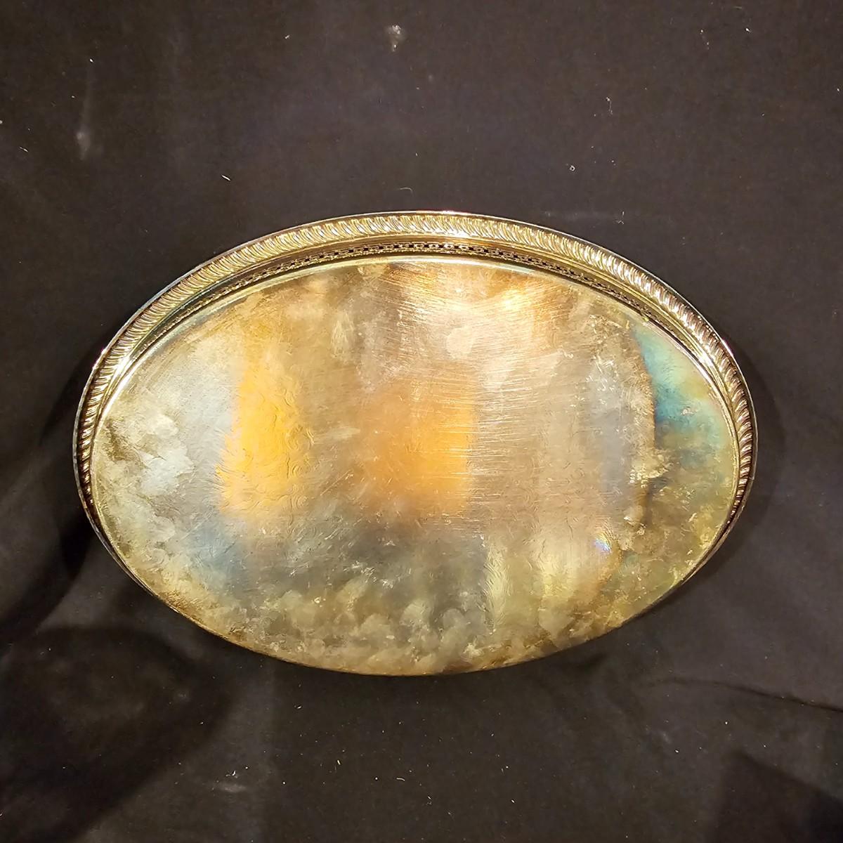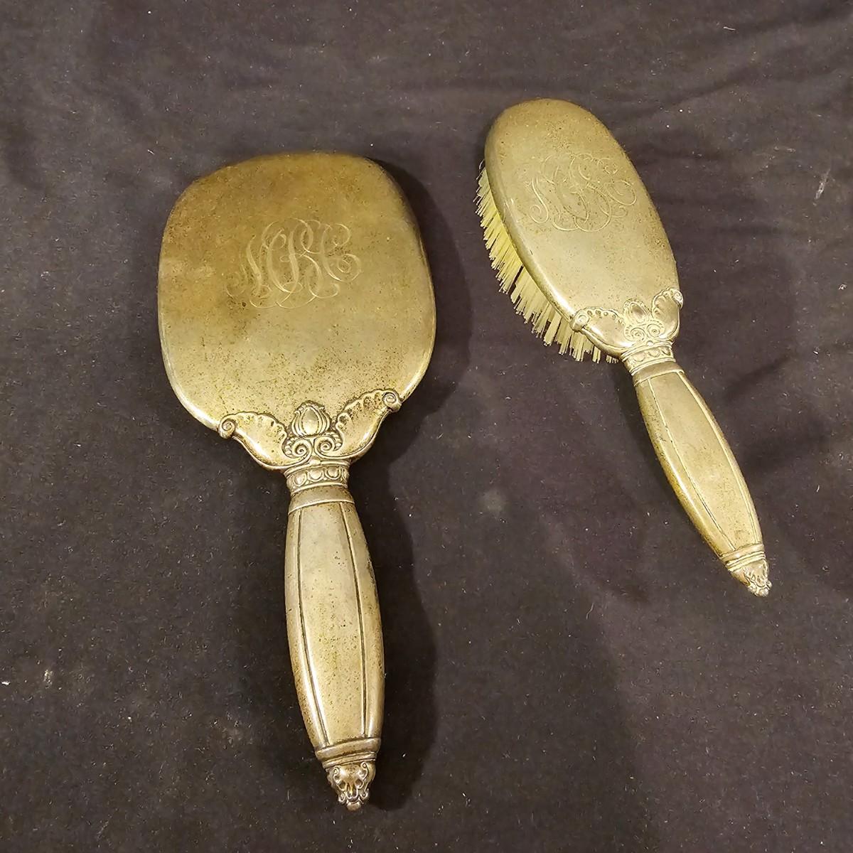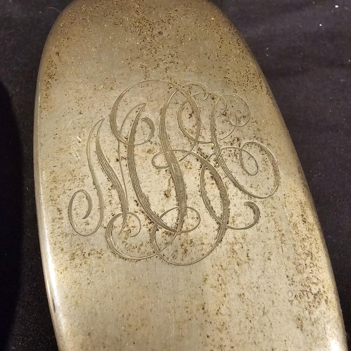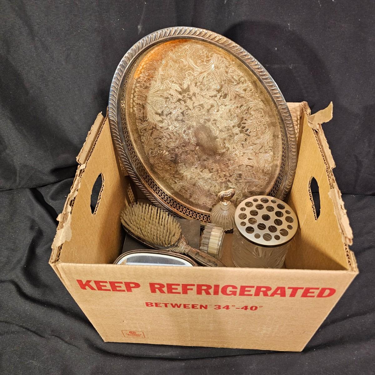 Engraved tray and several items for use on a vanity setup. Mirror, brushes, perfume bottles, small clock, more. Tray measures 16" x 11.5", is marked Towle EP on back. Silver colored box is 5.5" x 4" x 2"H, has multiple makers marks stamped in bottom. Hand mirror is 5" x 11". Smallest brush is marked sterling on top. Other known markings are shown in photos. Shipping available.