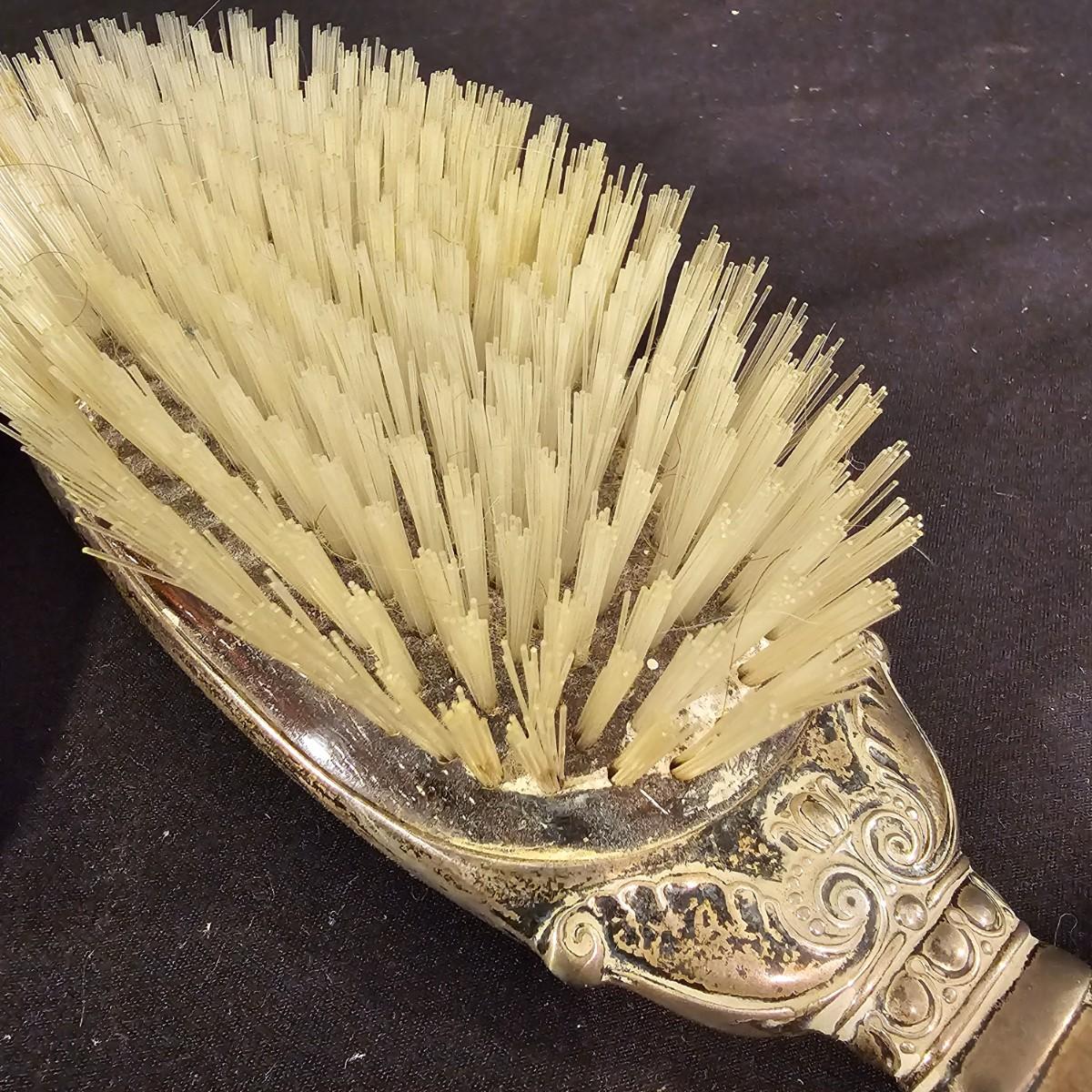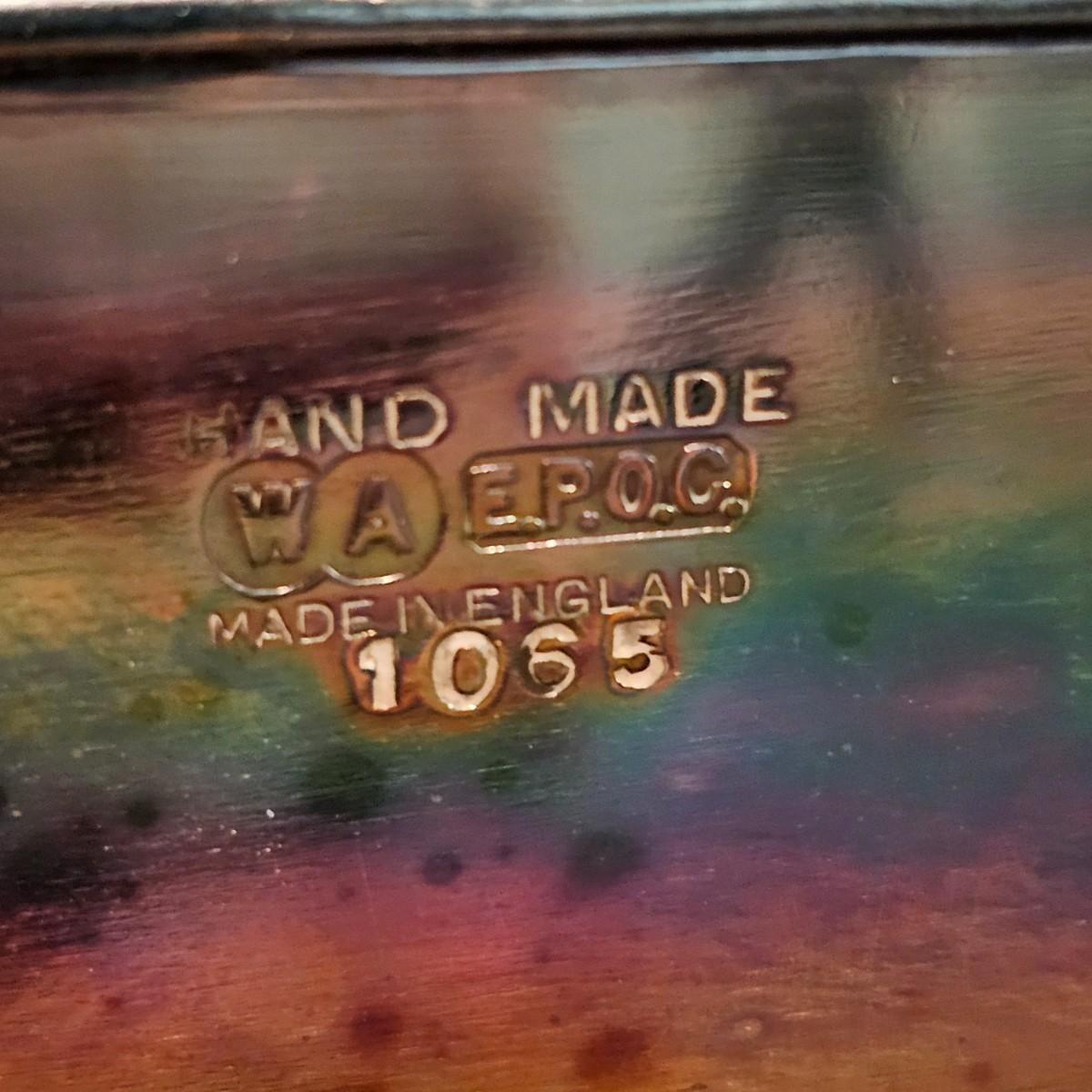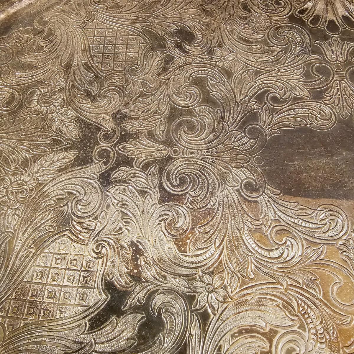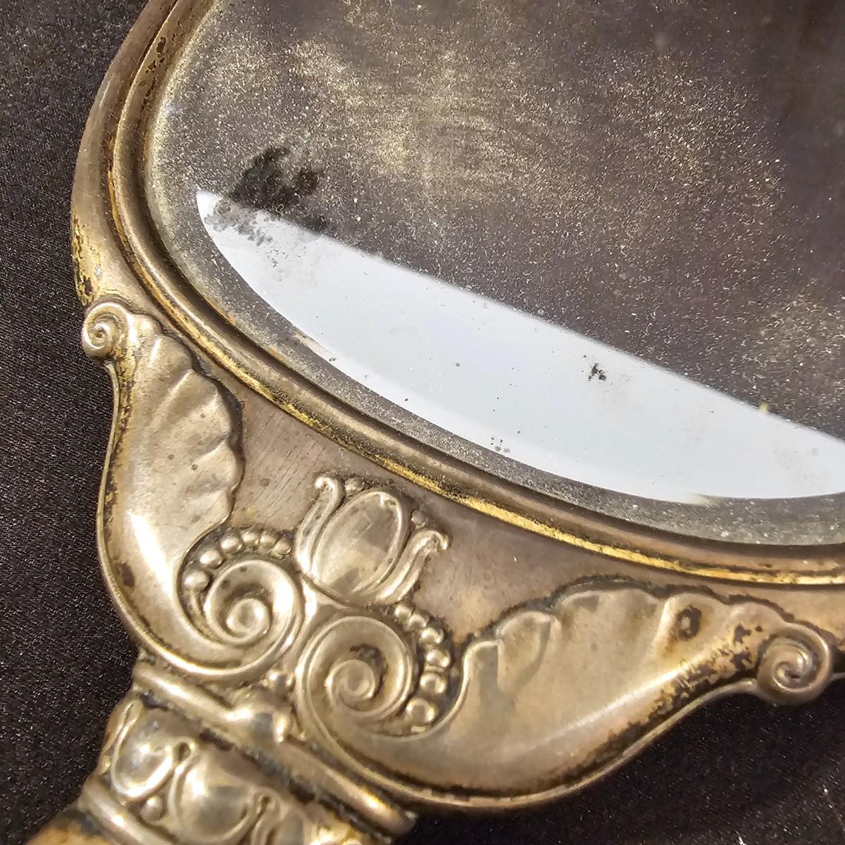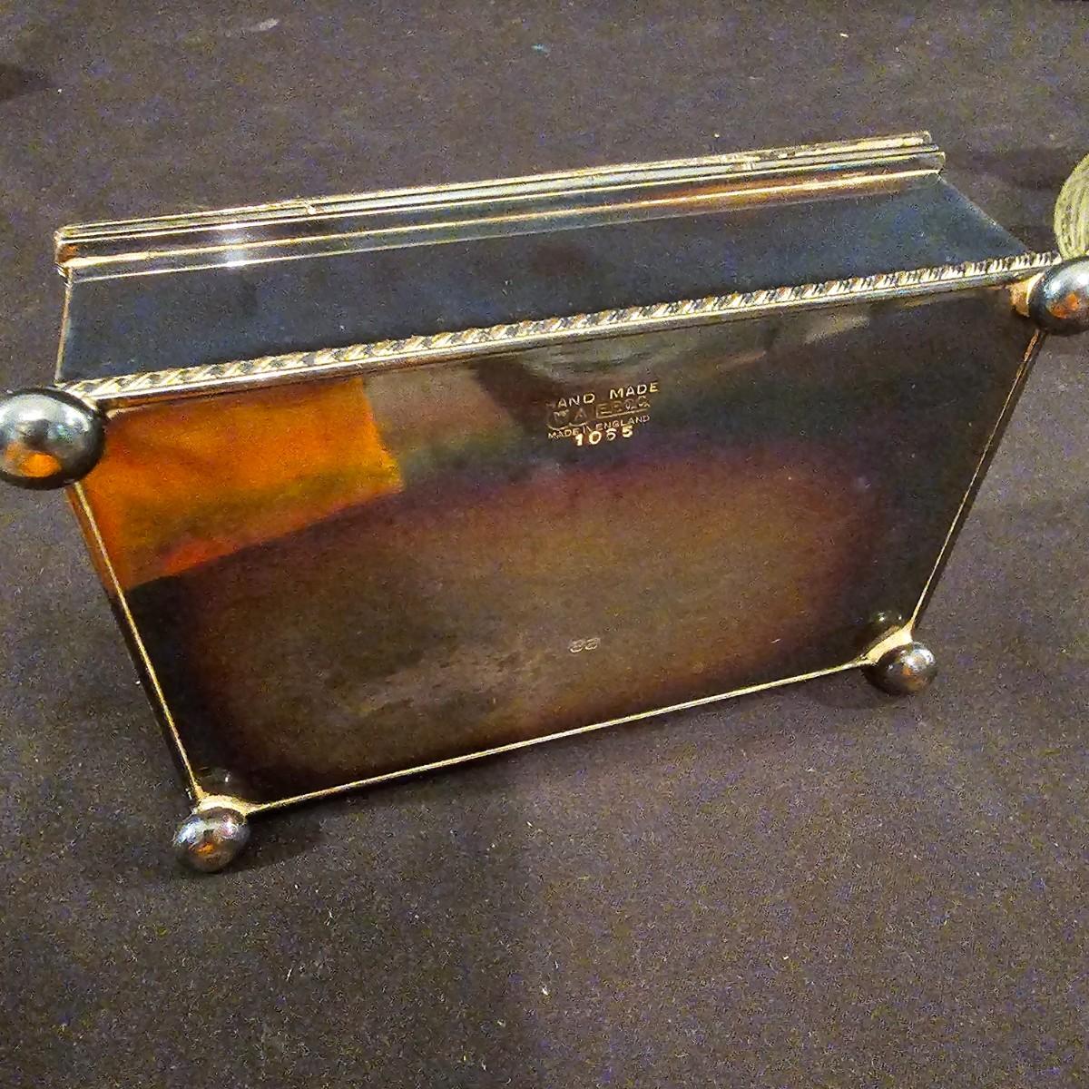 Engraved tray and several items for use on a vanity setup. Mirror, brushes, perfume bottles, small clock, more. Tray measures 16" x 11.5", is marked Towle EP on back. Silver colored box is 5.5" x 4" x 2"H, has multiple makers marks stamped in bottom. Hand mirror is 5" x 11". Smallest brush is marked sterling on top. Other known markings are shown in photos. Shipping available.