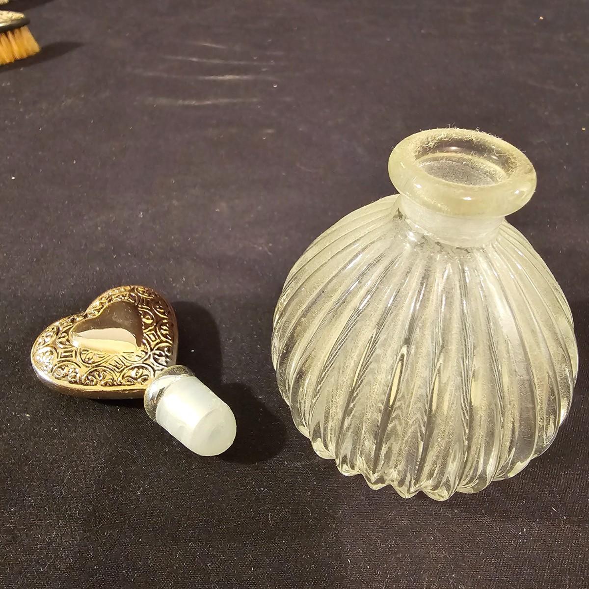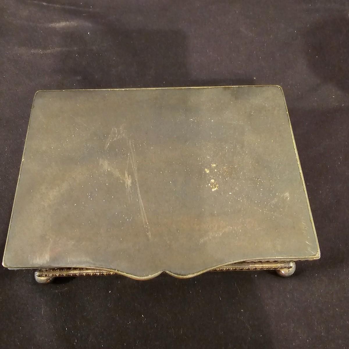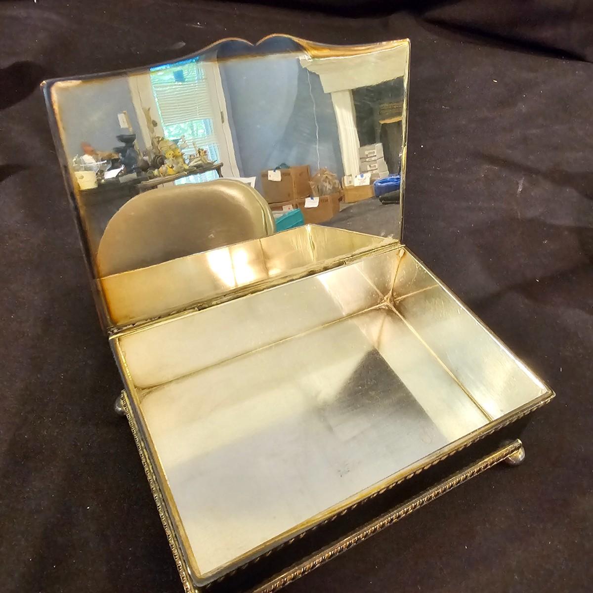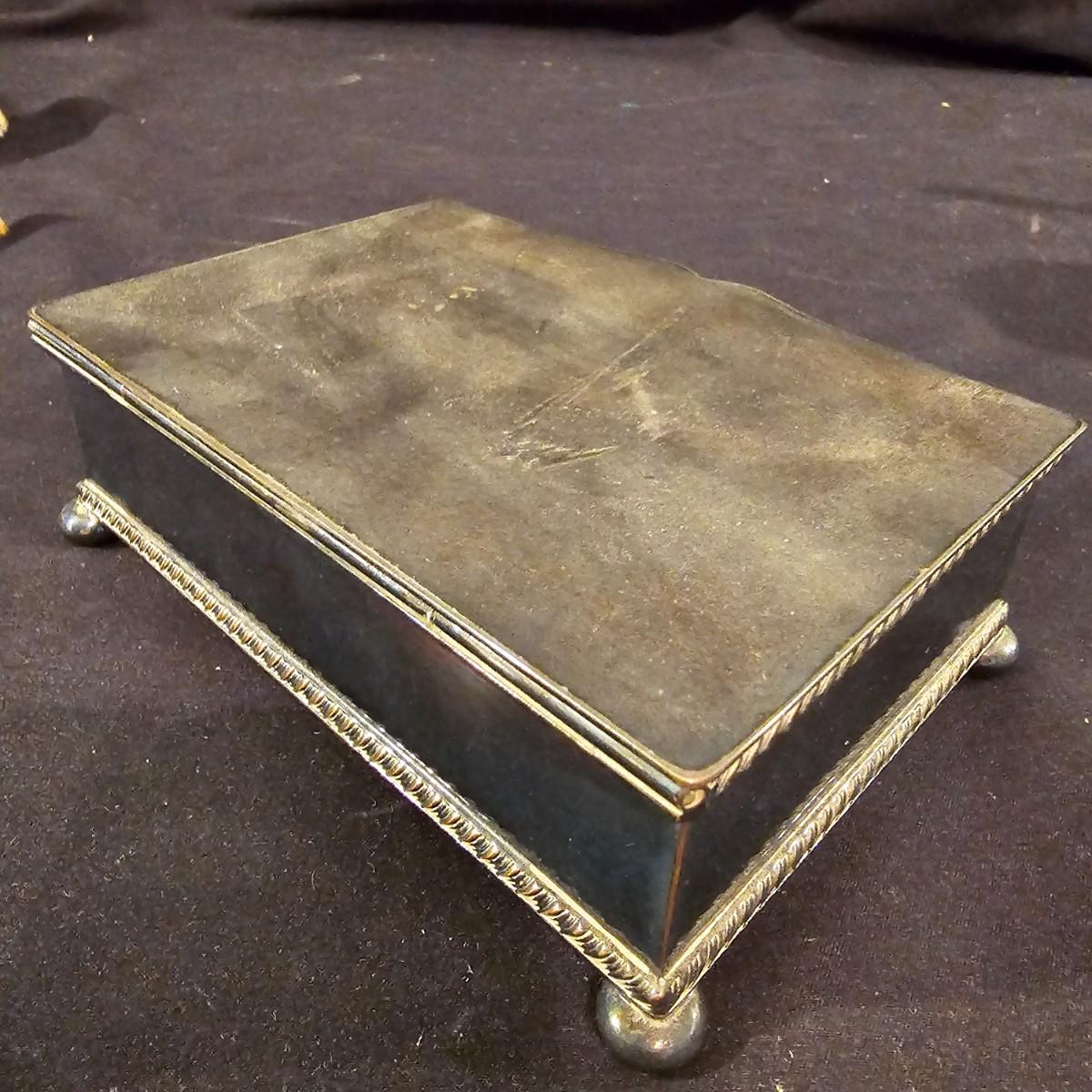 Engraved tray and several items for use on a vanity setup. Mirror, brushes, perfume bottles, small clock, more. Tray measures 16" x 11.5", is marked Towle EP on back. Silver colored box is 5.5" x 4" x 2"H, has multiple makers marks stamped in bottom. Hand mirror is 5" x 11". Smallest brush is marked sterling on top. Other known markings are shown in photos. Shipping available.