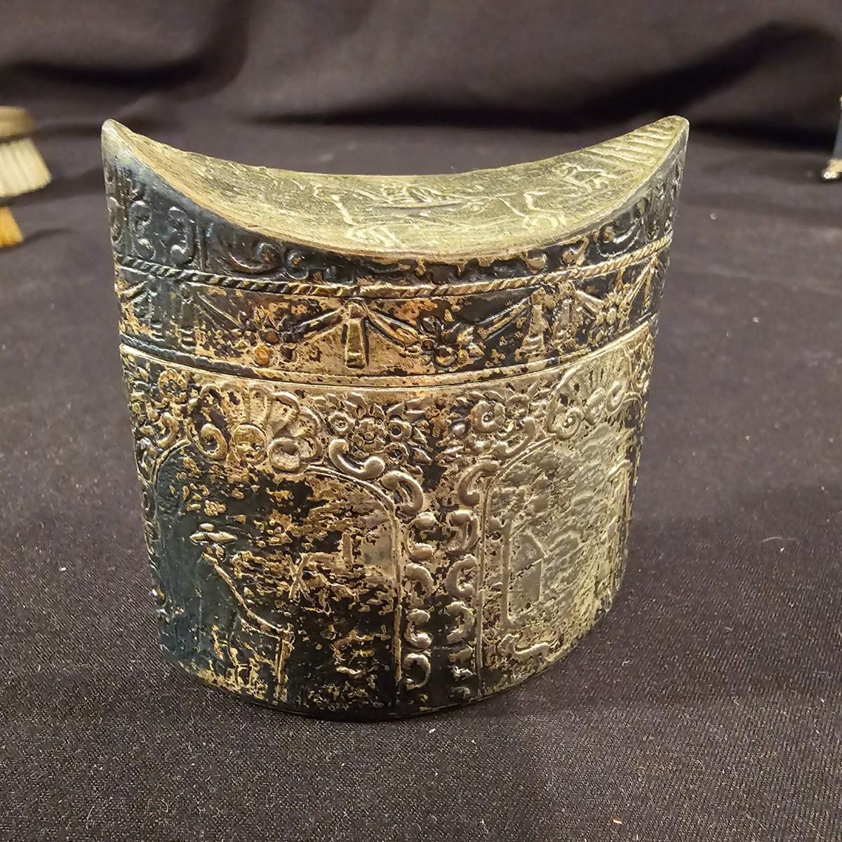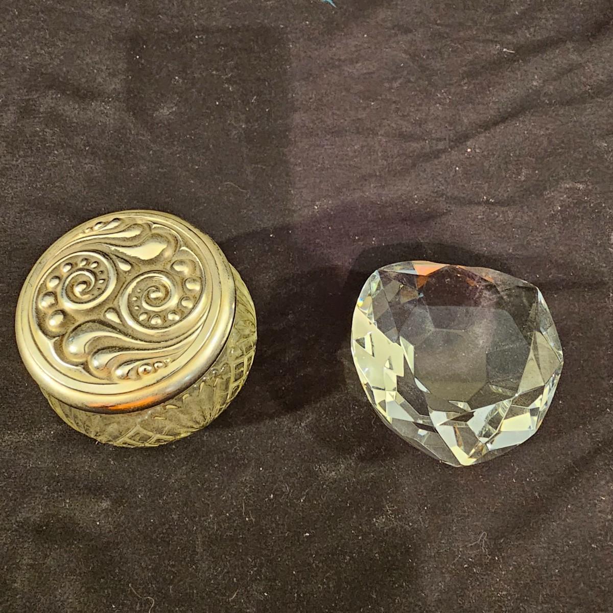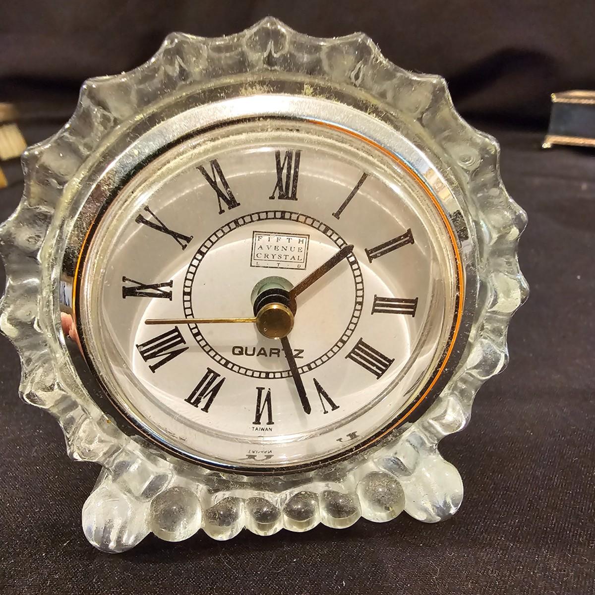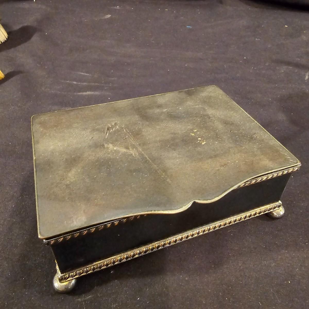 Engraved tray and several items for use on a vanity setup. Mirror, brushes, perfume bottles, small clock, more. Tray measures 16" x 11.5", is marked Towle EP on back. Silver colored box is 5.5" x 4" x 2"H, has multiple makers marks stamped in bottom. Hand mirror is 5" x 11". Smallest brush is marked sterling on top. Other known markings are shown in photos. Shipping available.