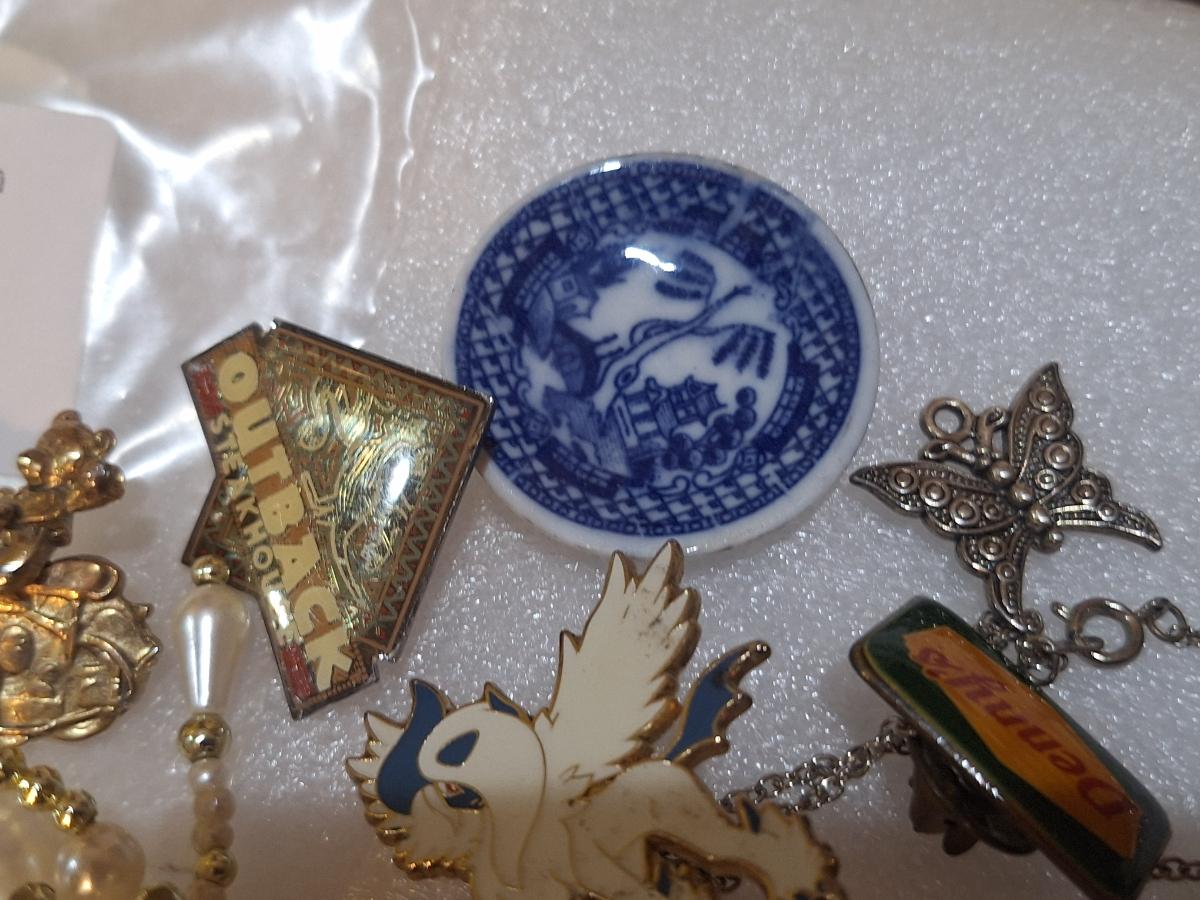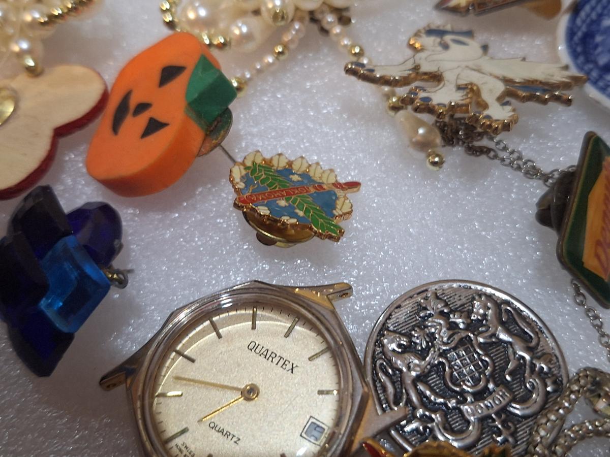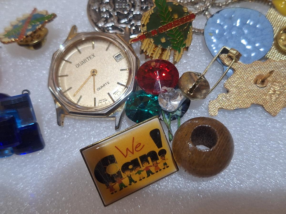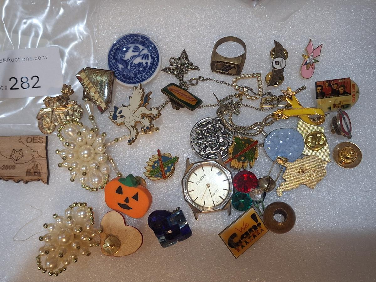 assorted vintage and estate brooches, mis matched earrings and other jewelry pieces. The watch has no back. Please see all photos.