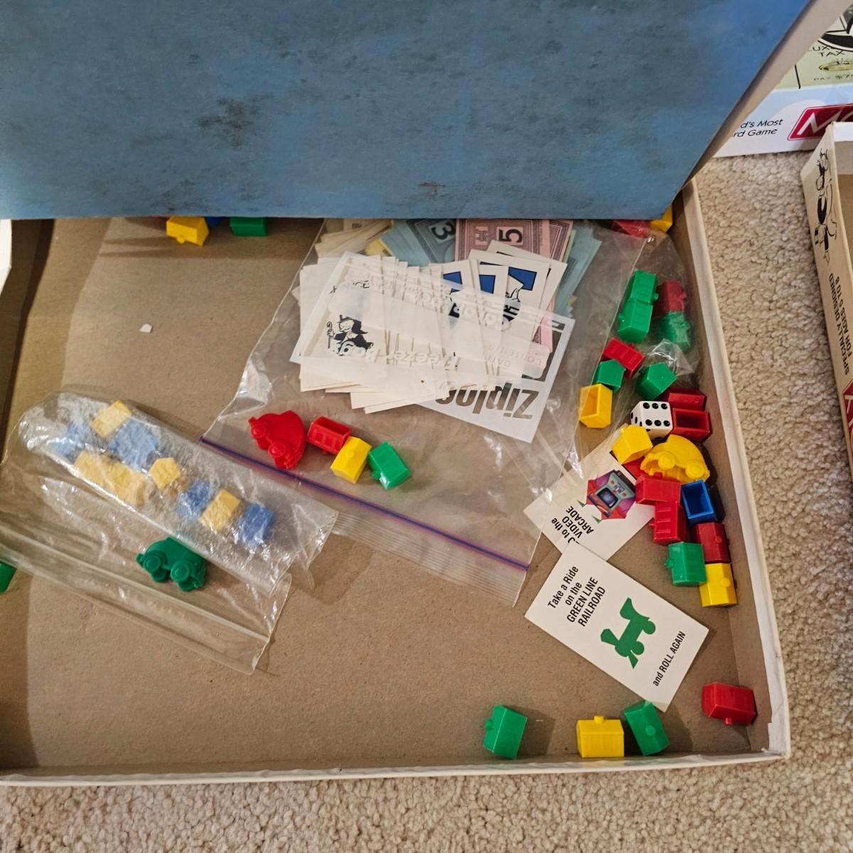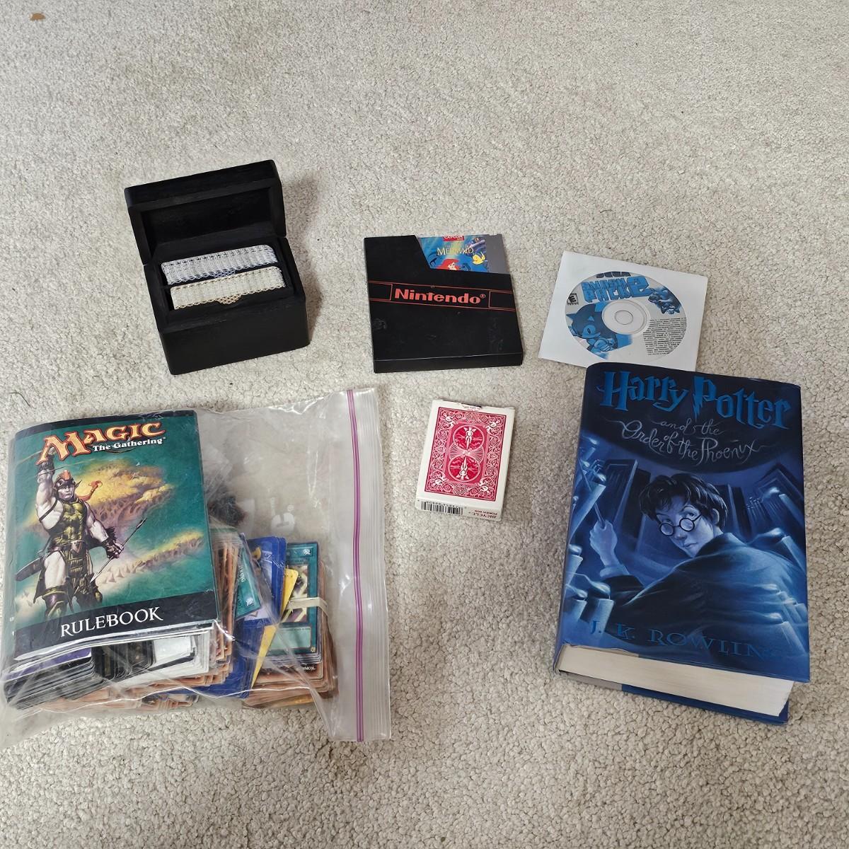 Monopoly, Clue, Stratego, chess and other fun tabletop games from the past. Four different versions of Monopoly and two of Clue. One portable chess set with storage base and rotating board. A set of cards for Magic: The Gathering and also some Pokémon cards. Regular playing cards and more. No guarantee that all pieces are included in each game, but many boxes are taped shut and one Rummikub set is still sealed. A hard copy of Harry Potter and the Order of the Phoenix. See photos for details. Local pickup only.