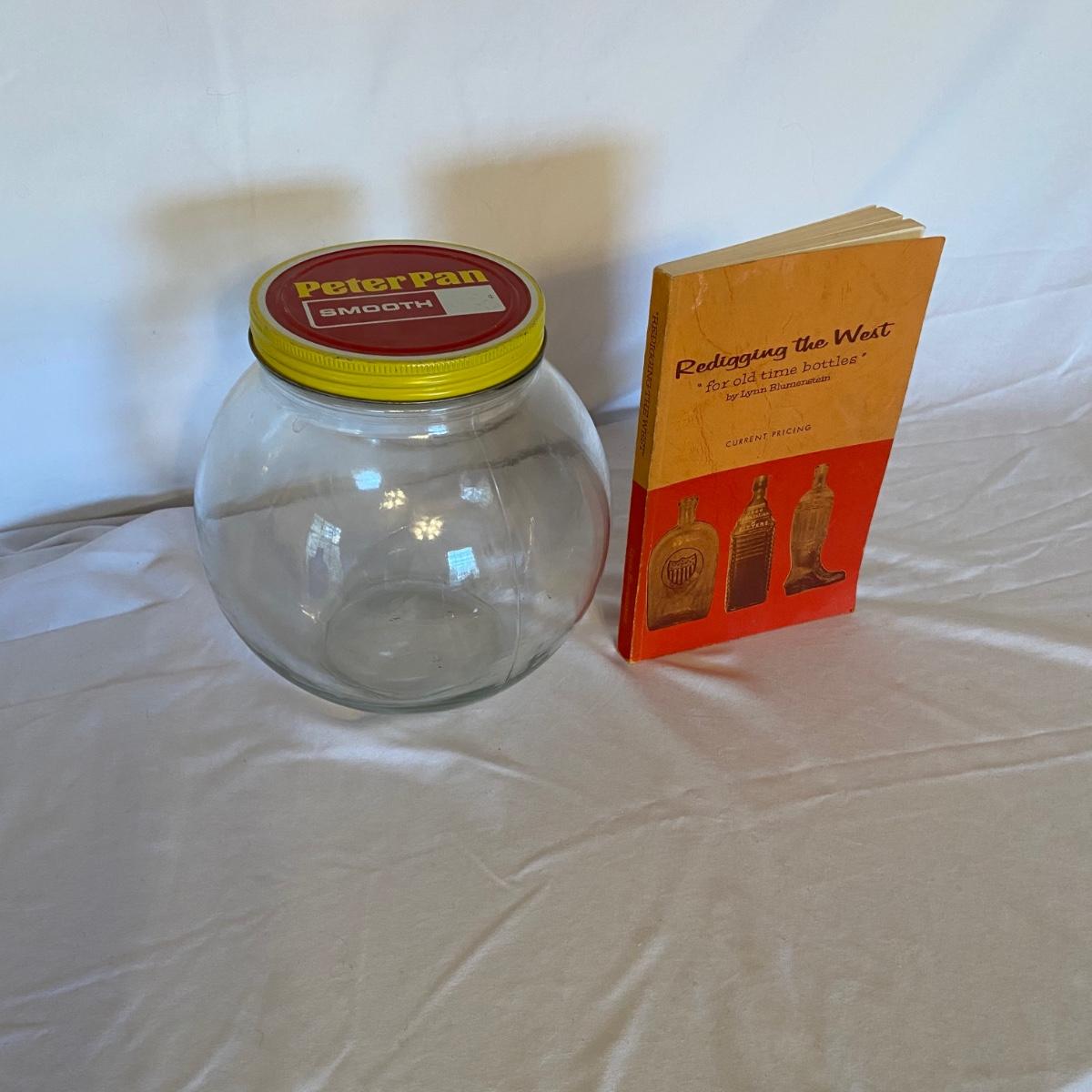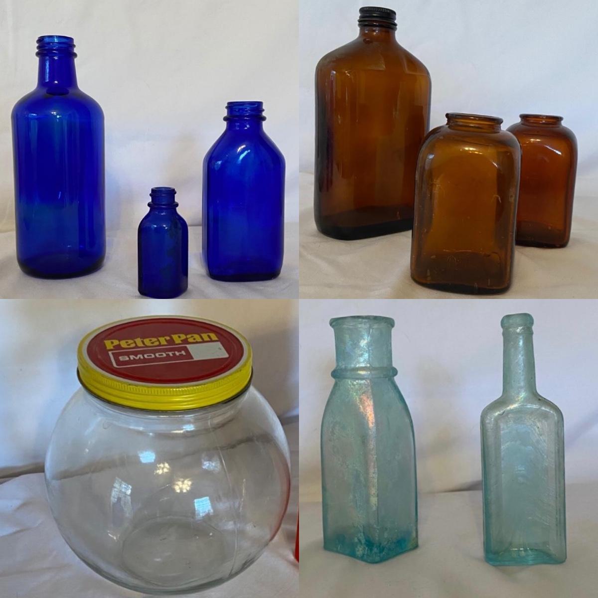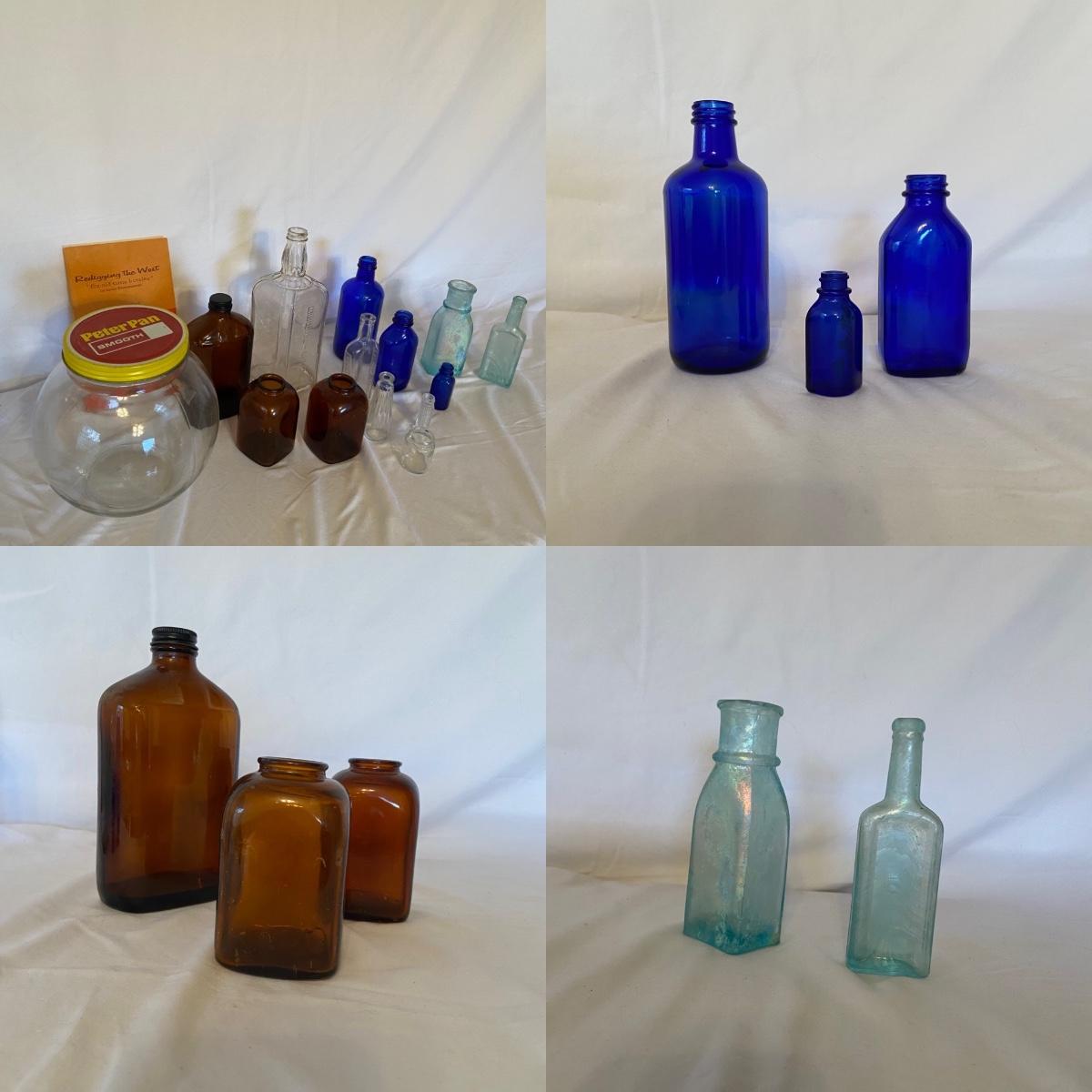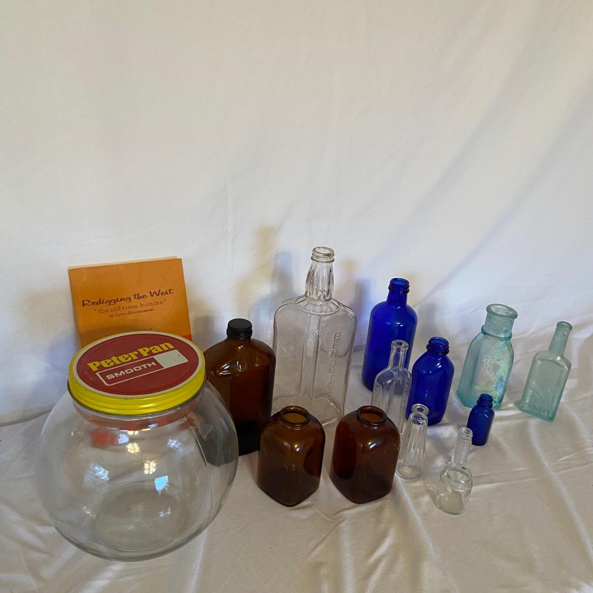 This lot contains a variety of vintage glass bottles and a book about “old time bottles”. With a total of 14 containers, lot contains three brown bottles, three blue bottles, two iridescent bottles, five clear bottles and a large jar that is the shape and size of a fishbowl with a twist on vintage Peter Pan lid. Shipping available.