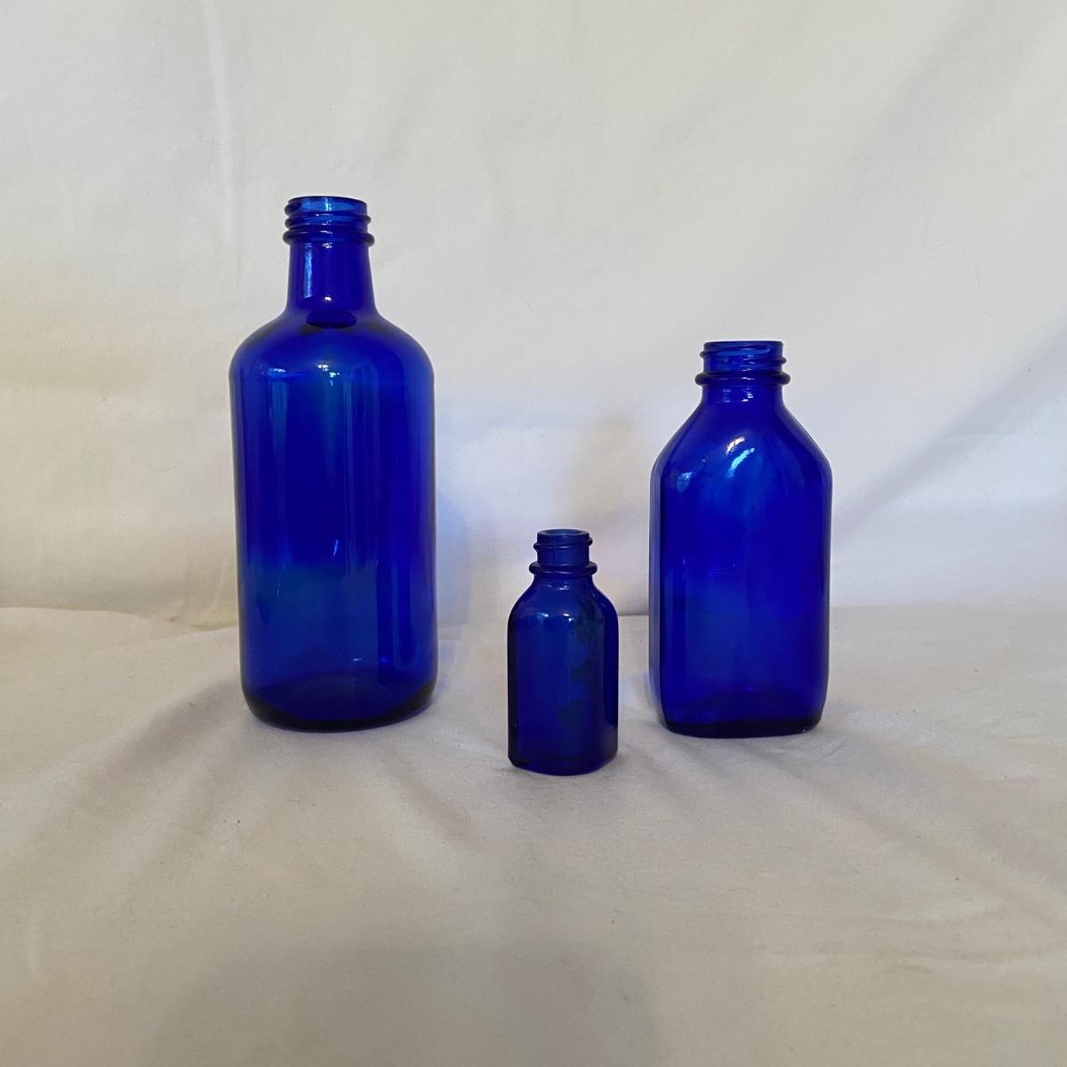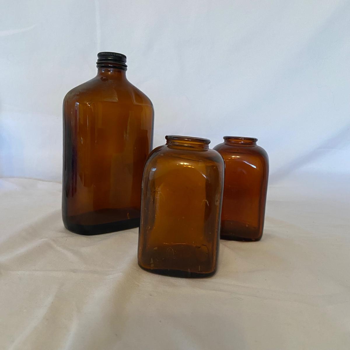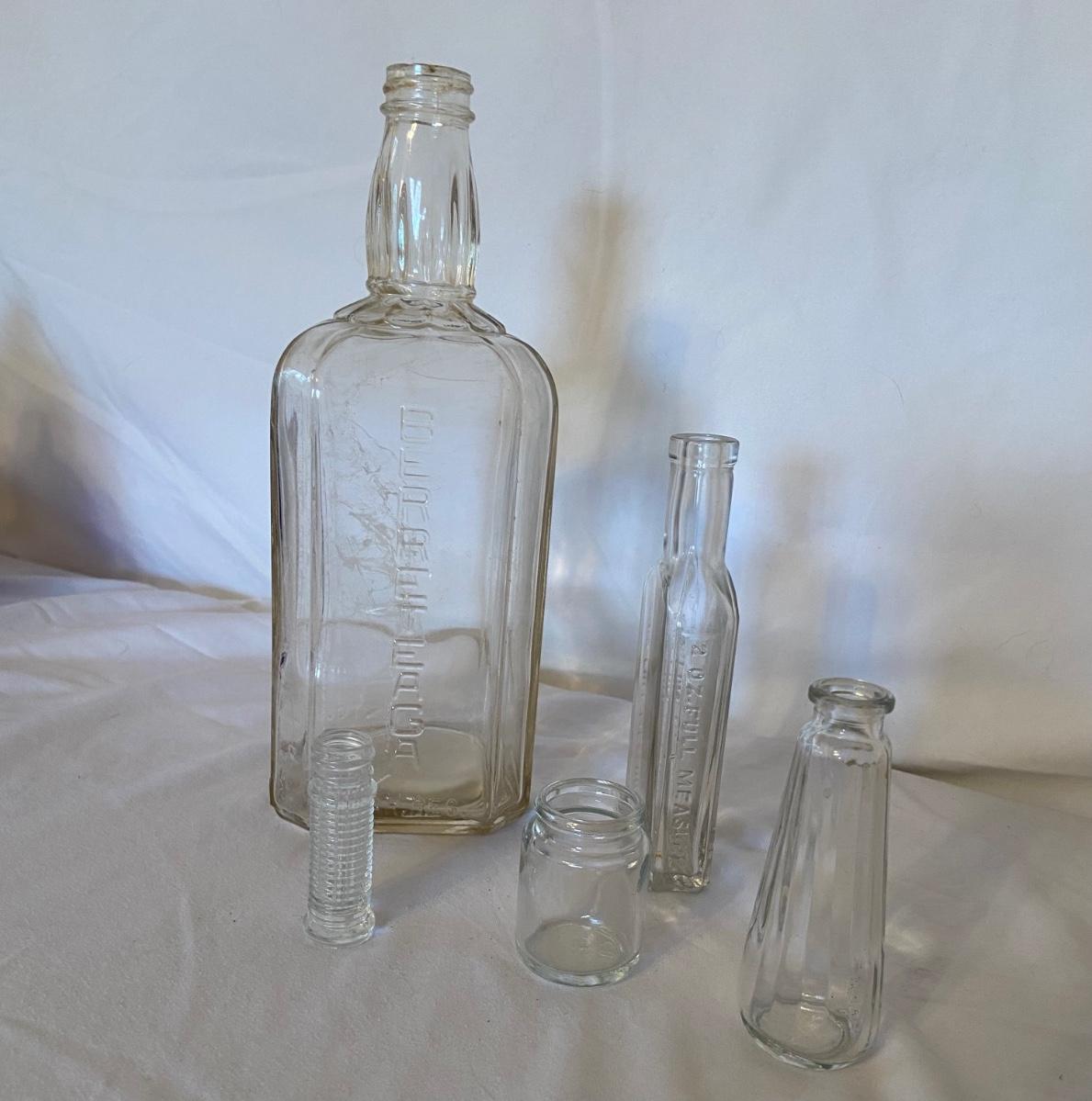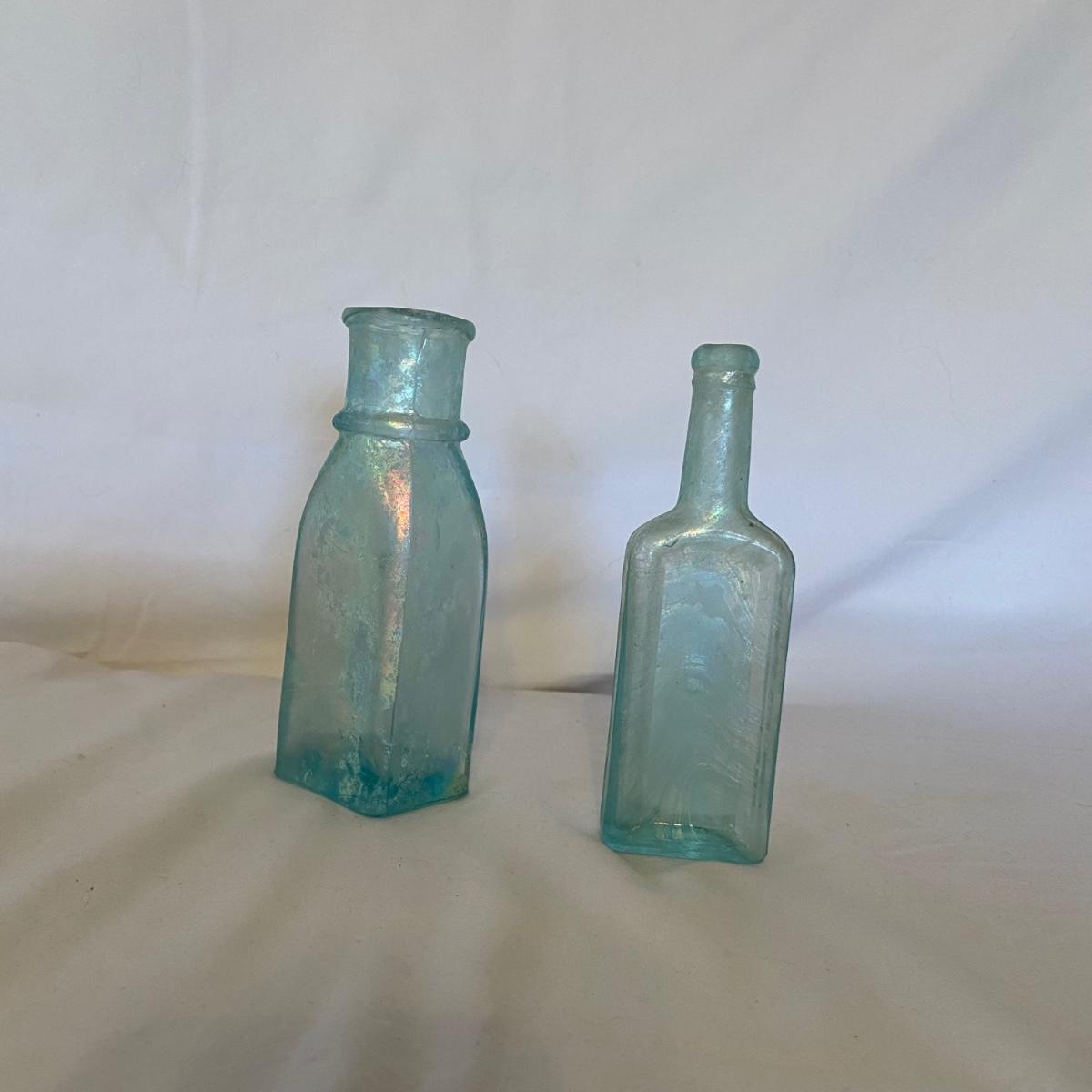 This lot contains a variety of vintage glass bottles and a book about “old time bottles”. With a total of 14 containers, lot contains three brown bottles, three blue bottles, two iridescent bottles, five clear bottles and a large jar that is the shape and size of a fishbowl with a twist on vintage Peter Pan lid. Shipping available.