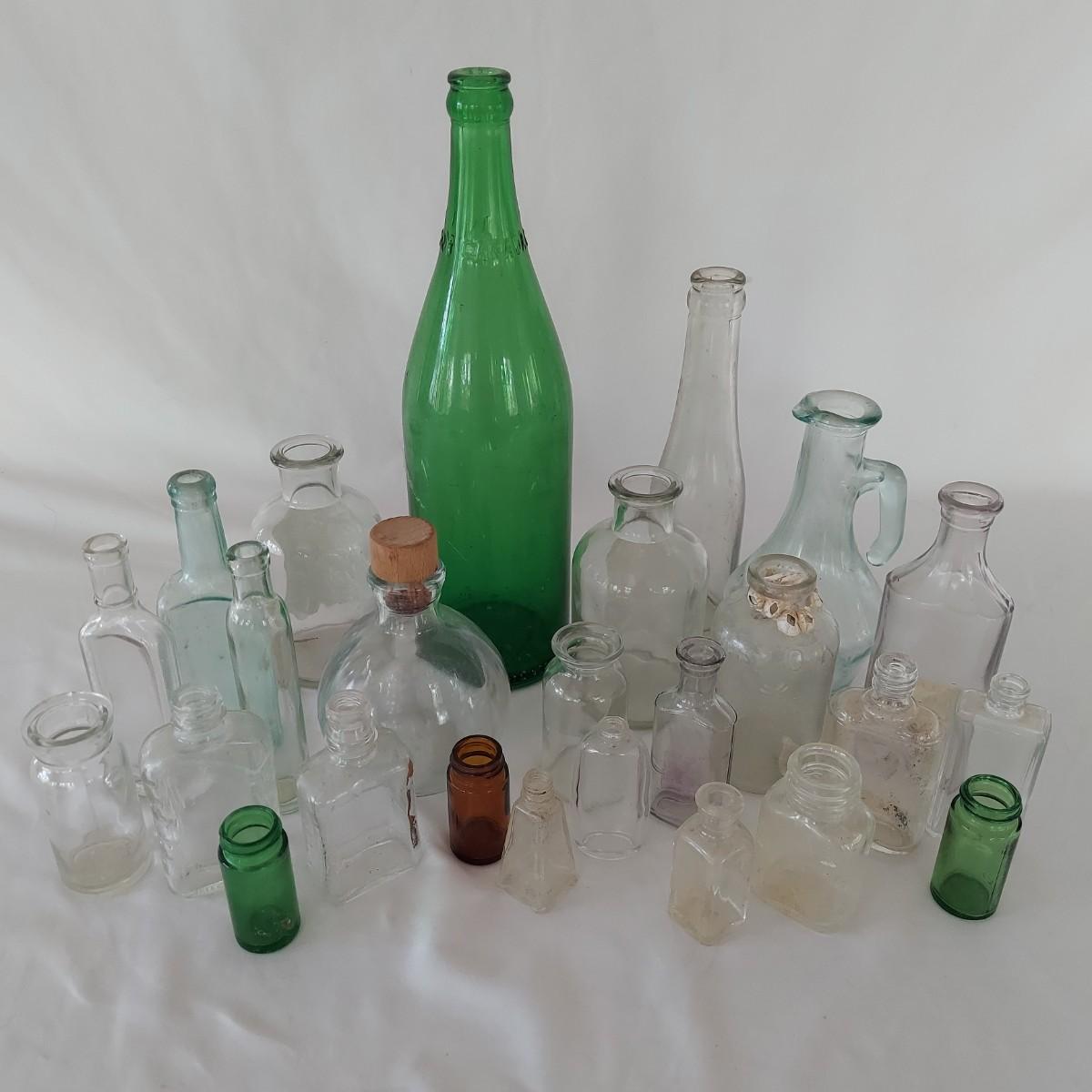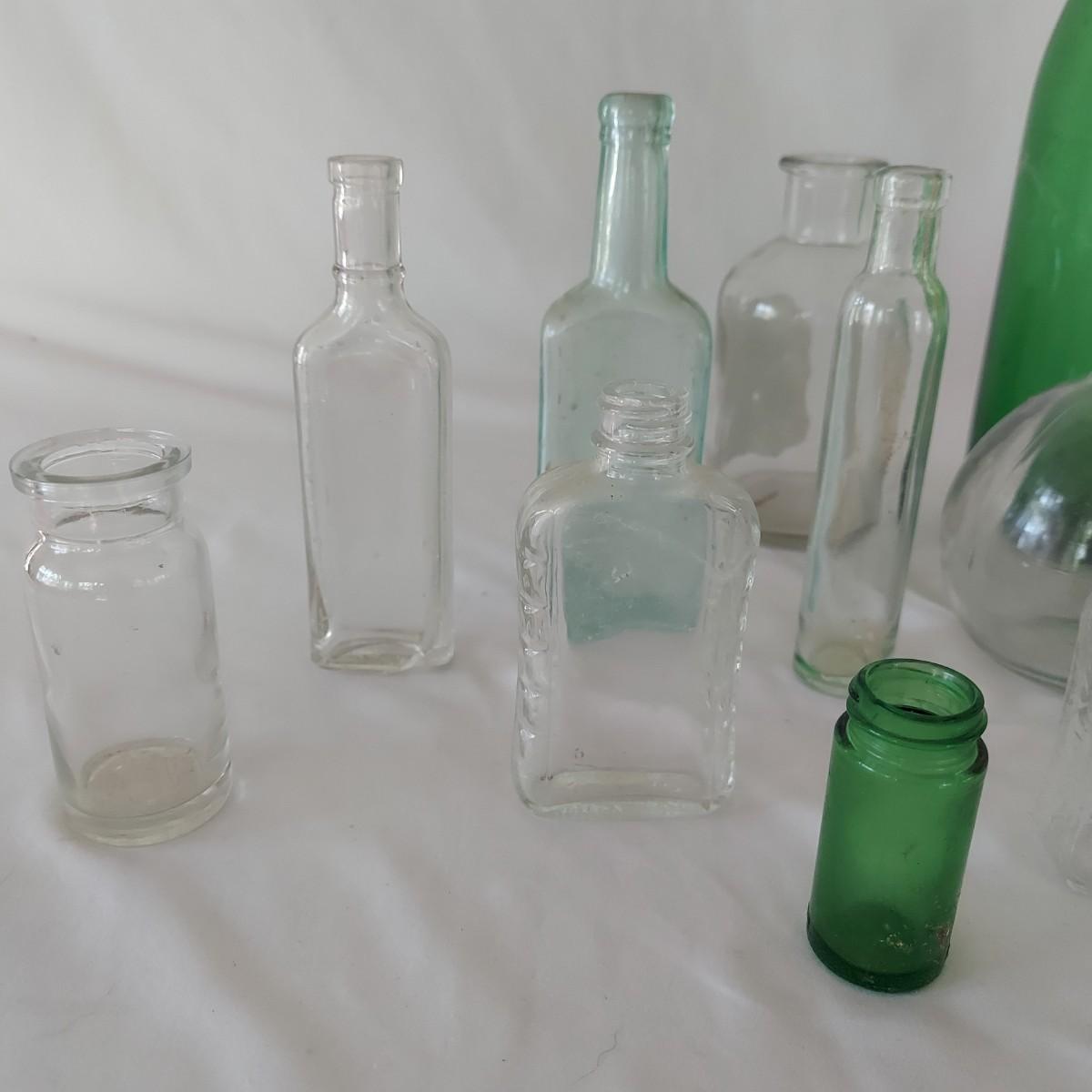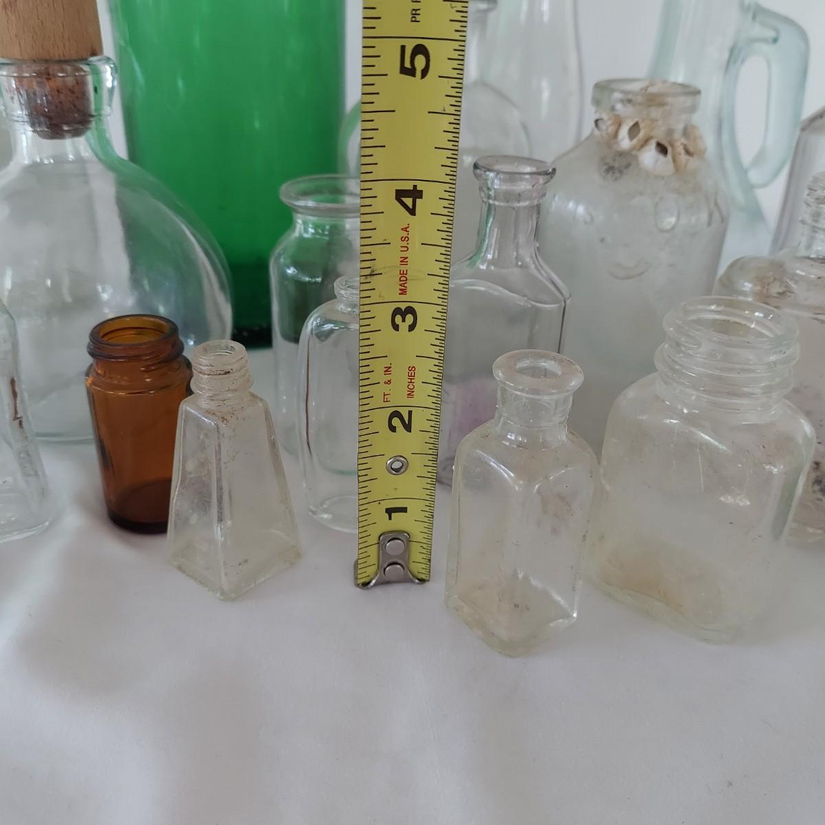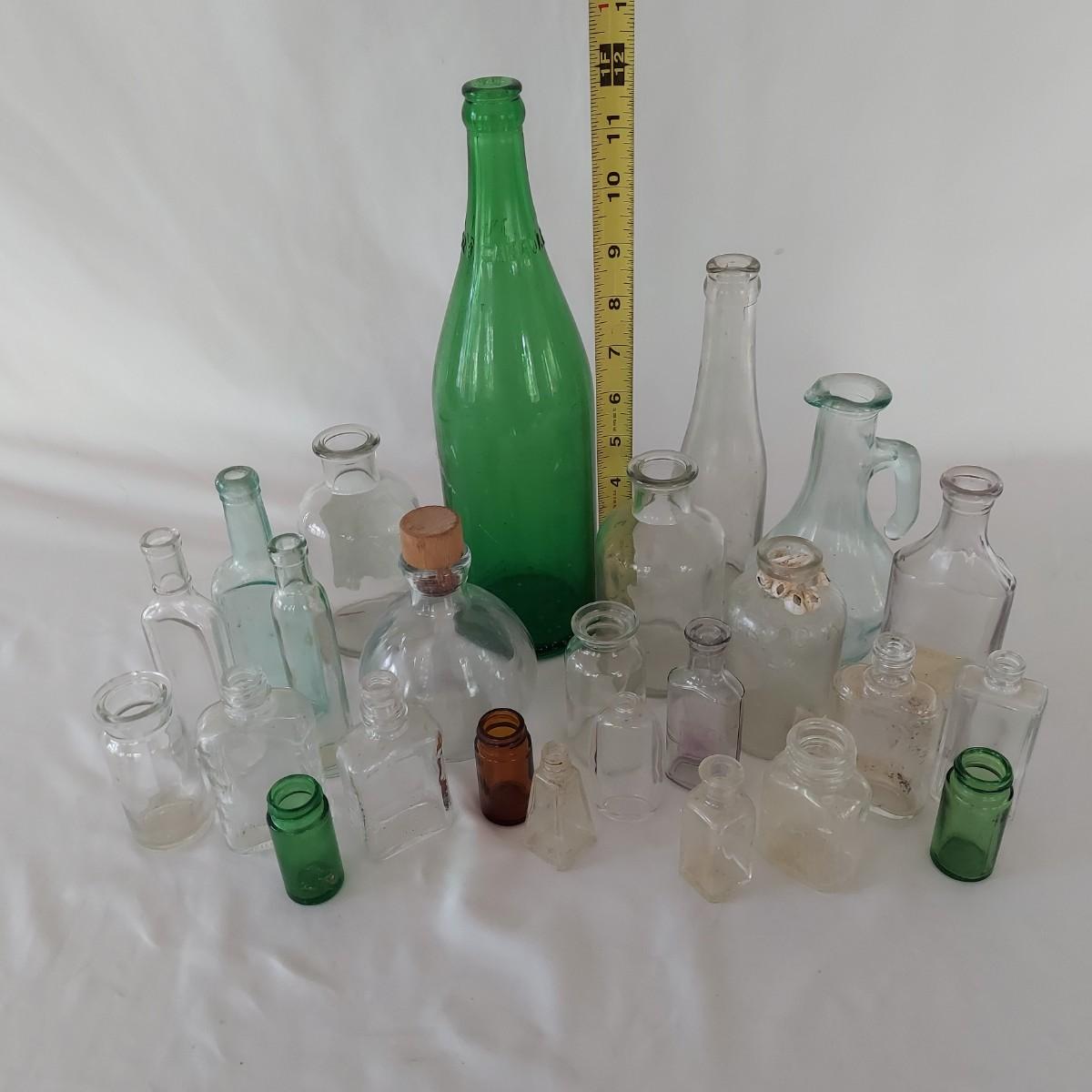 Many vintage glass bottles in various sizes and colors. The smallest bottles are 3" tall. The largest green bottle is 12" tall. There are 25+ pieces included. Some bottles are dirty. Shipping available.
