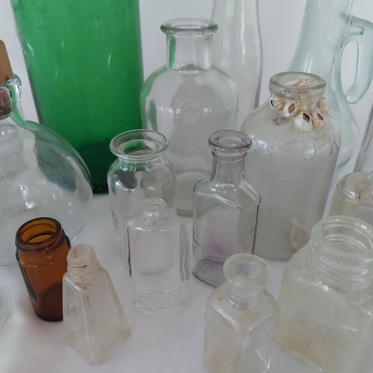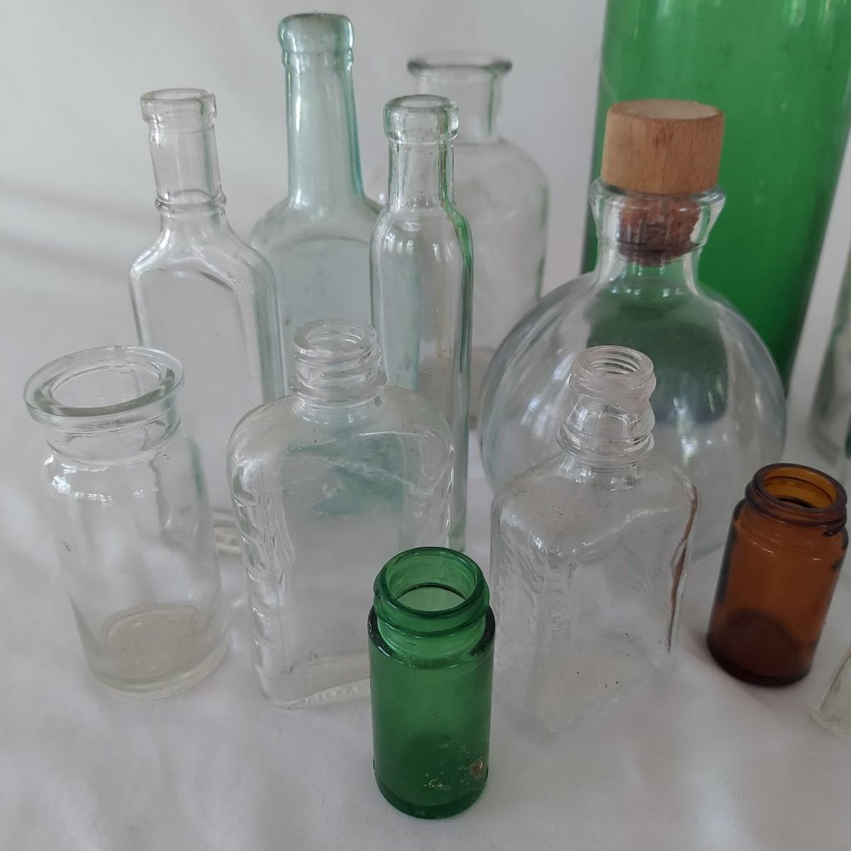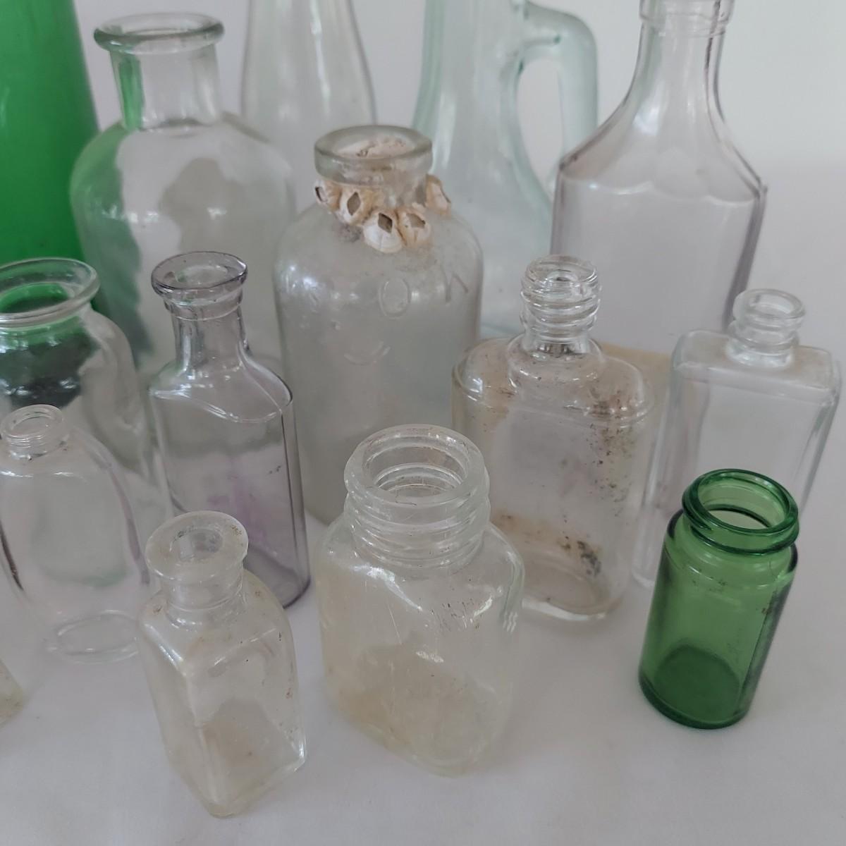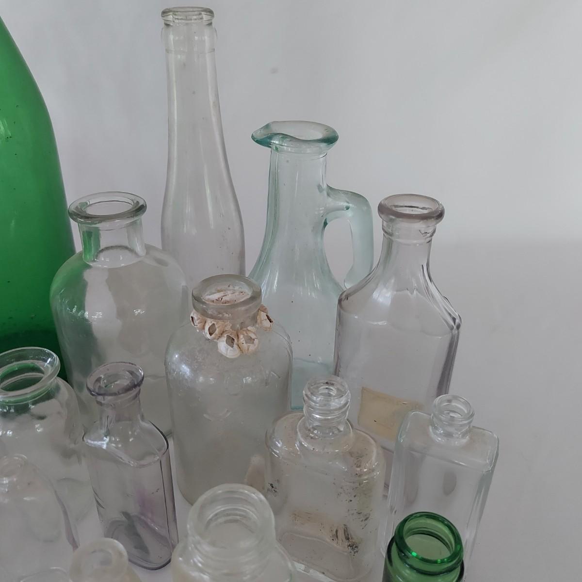 Many vintage glass bottles in various sizes and colors. The smallest bottles are 3" tall. The largest green bottle is 12" tall. There are 25+ pieces included. Some bottles are dirty. Shipping available.