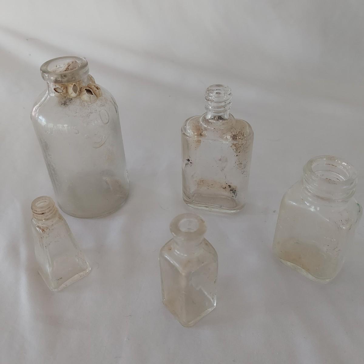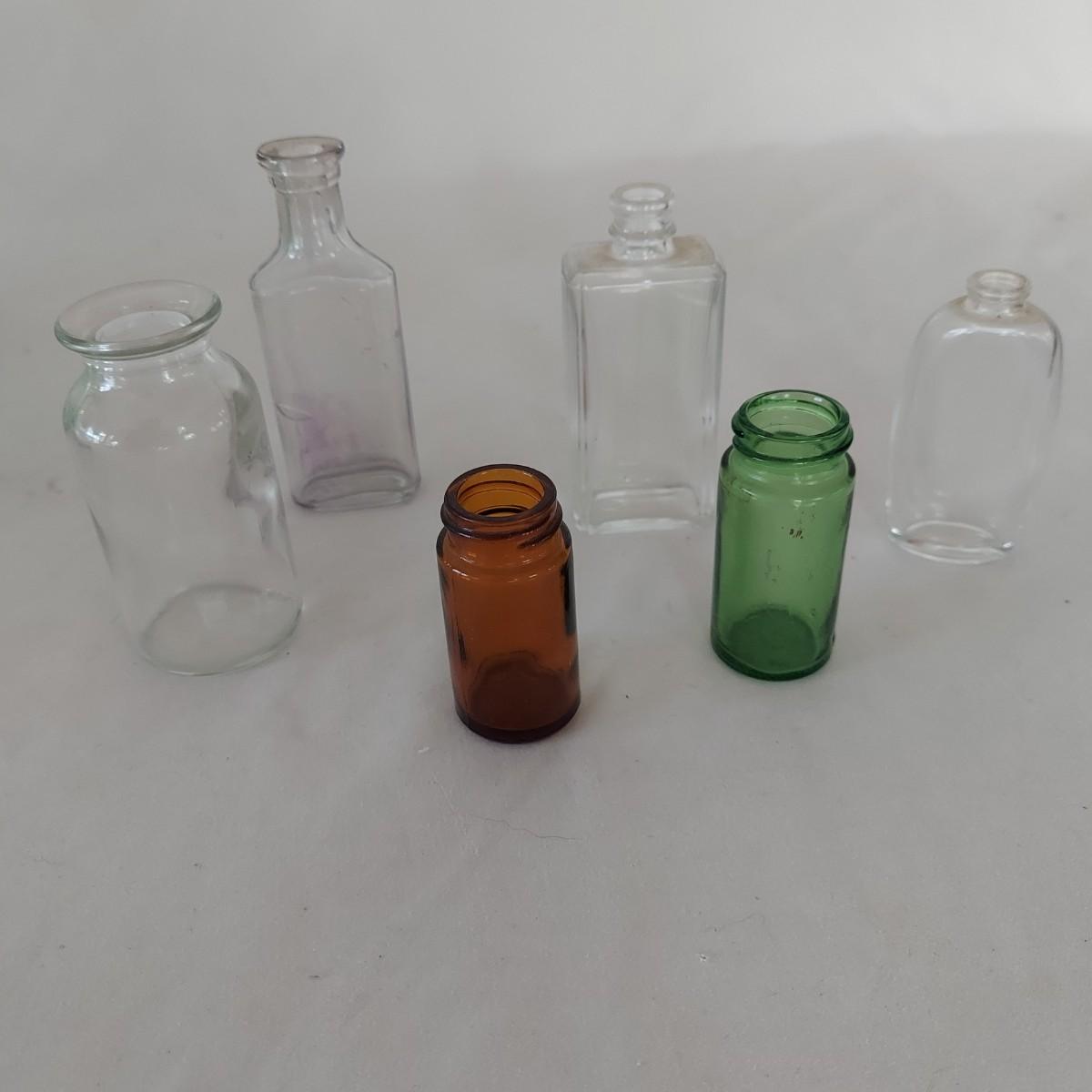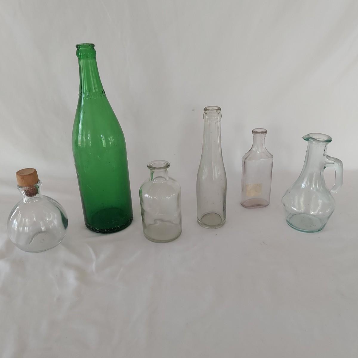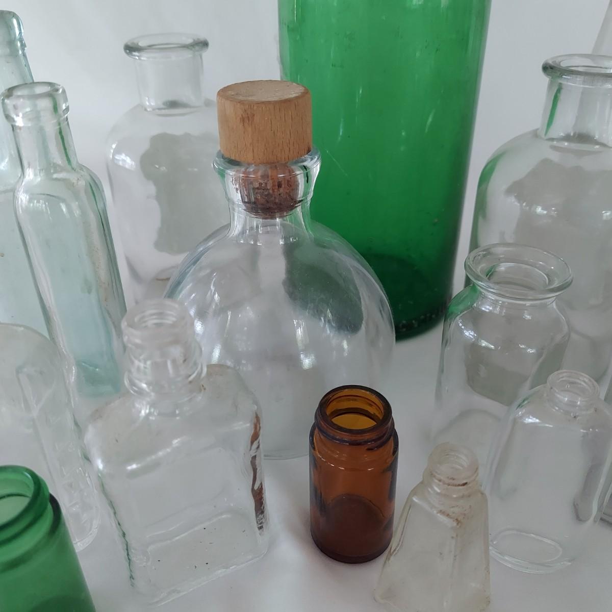 Many vintage glass bottles in various sizes and colors. The smallest bottles are 3" tall. The largest green bottle is 12" tall. There are 25+ pieces included. Some bottles are dirty. Shipping available.
