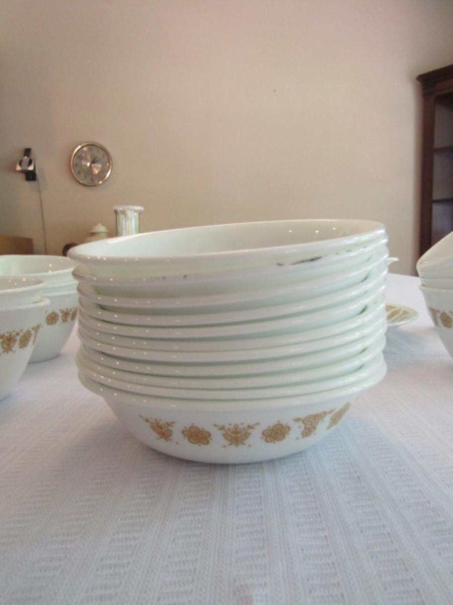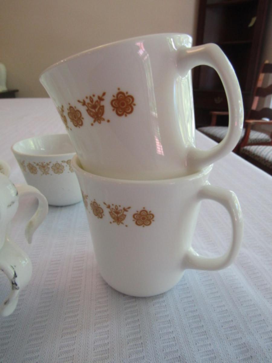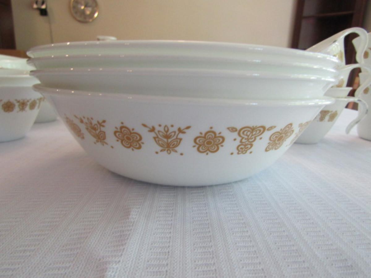 Assorted Vintage Corelle Dinnerware- Butterfly Gold Pattern. Berry bowls- 11, veggie bowl (8 1/2 ")- 4, large veggie bowls (10 1/4")- 1, platter (12 1/4")- 1, cups- 9, mugs- 3.
