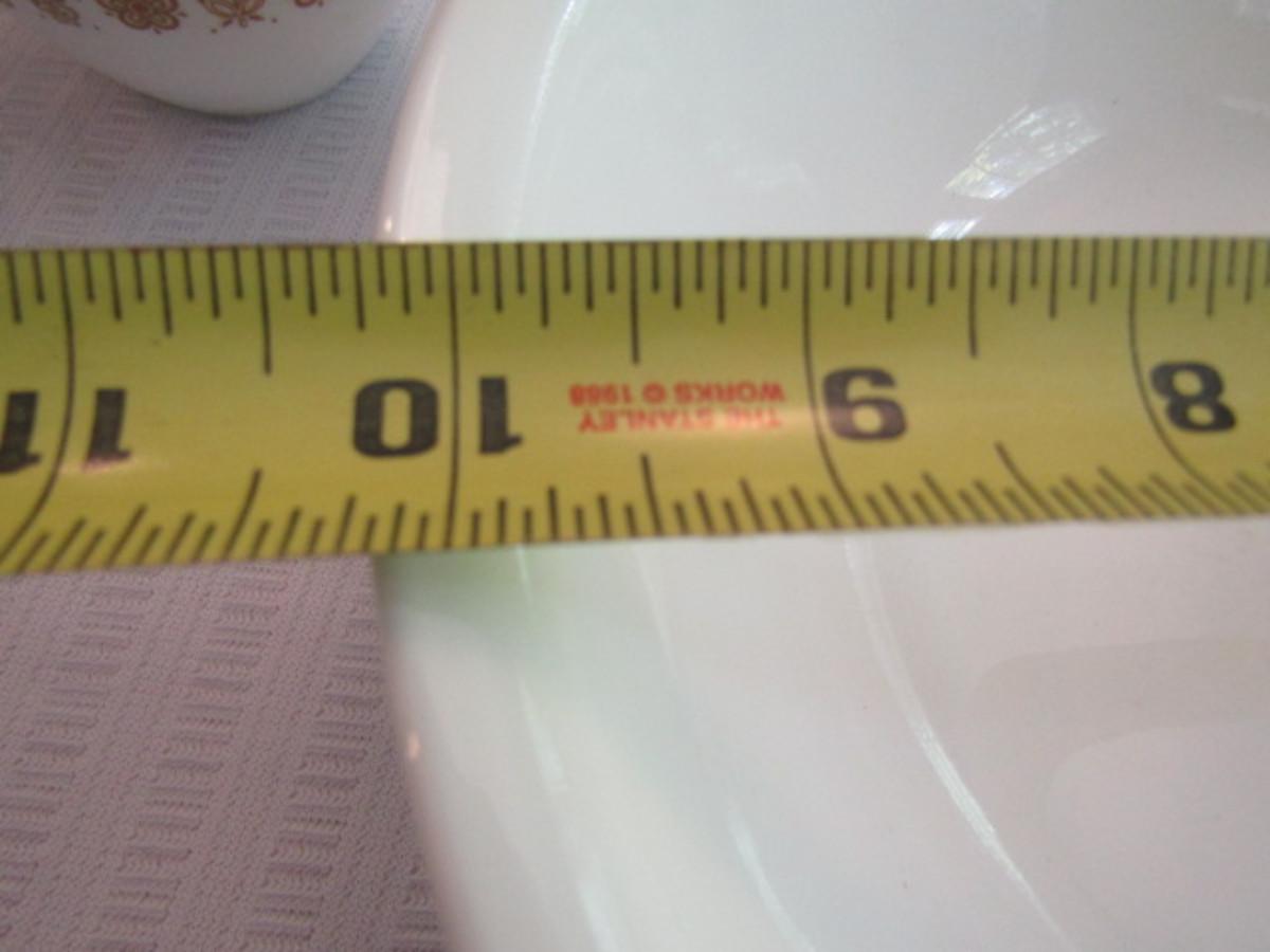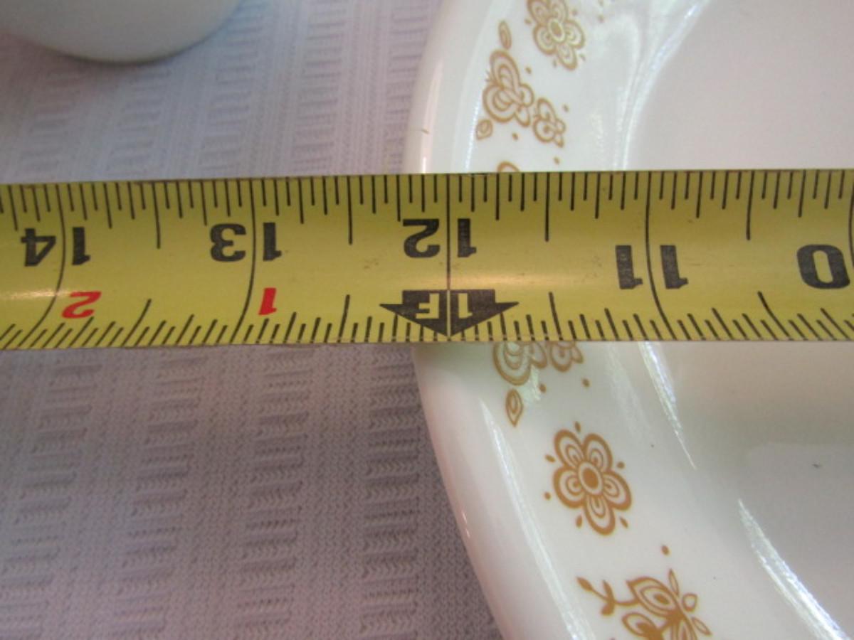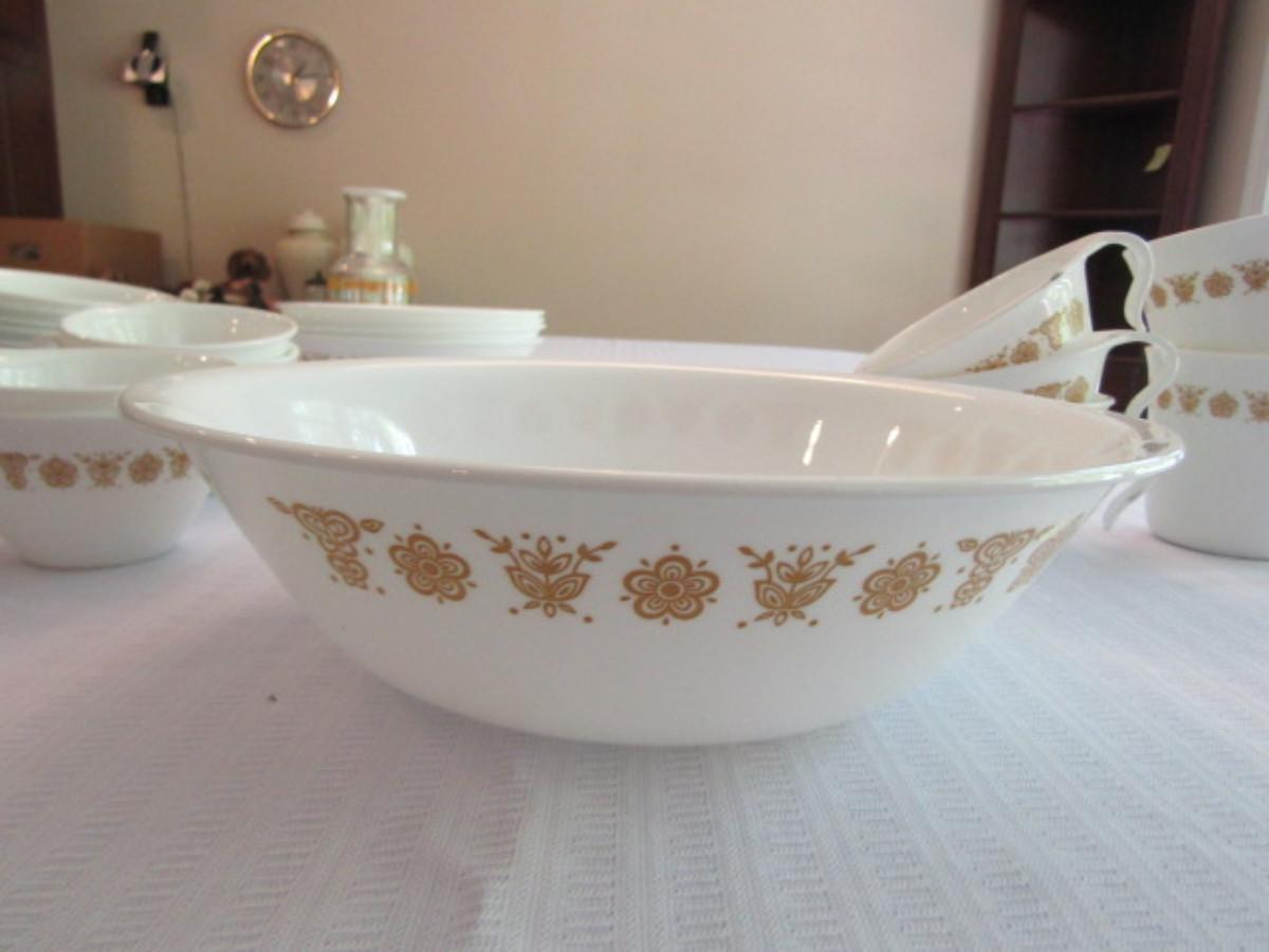 Assorted Vintage Corelle Dinnerware- Butterfly Gold Pattern. Berry bowls- 11, veggie bowl (8 1/2 ")- 4, large veggie bowls (10 1/4")- 1, platter (12 1/4")- 1, cups- 9, mugs- 3.