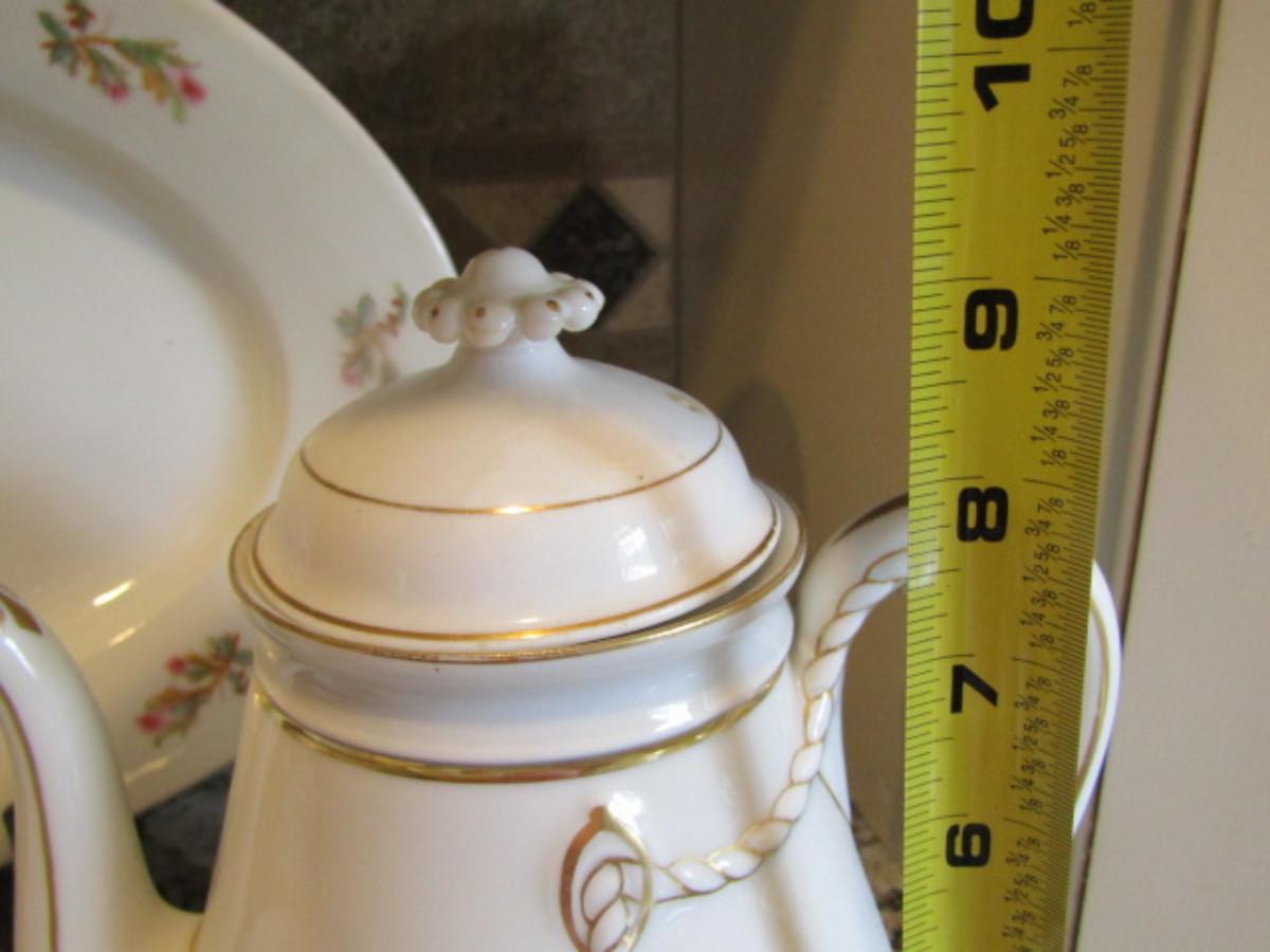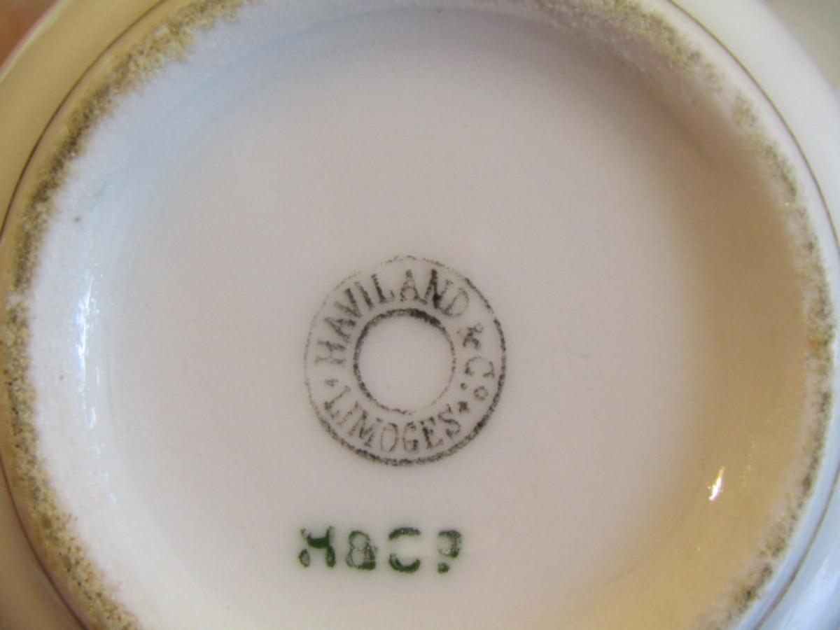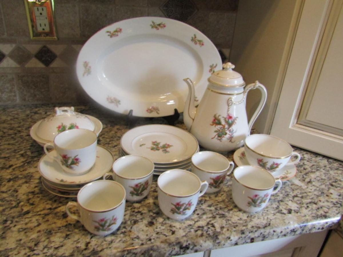 Assorted Vintage Haviland Limoges Dinnerware- Approx 19 Pieces (#23). 1 platter, 6 cups, 4 saucers, tea/coffee pot, large cup with saucer, 4 plates (approx 7"), 1 covered bowl. Please allow for chipping.