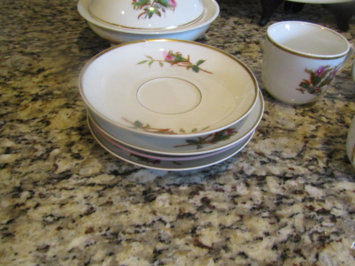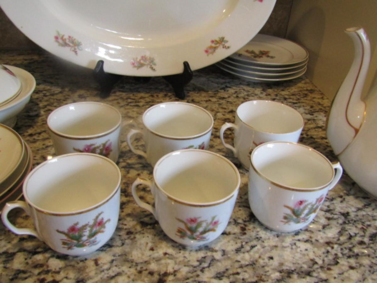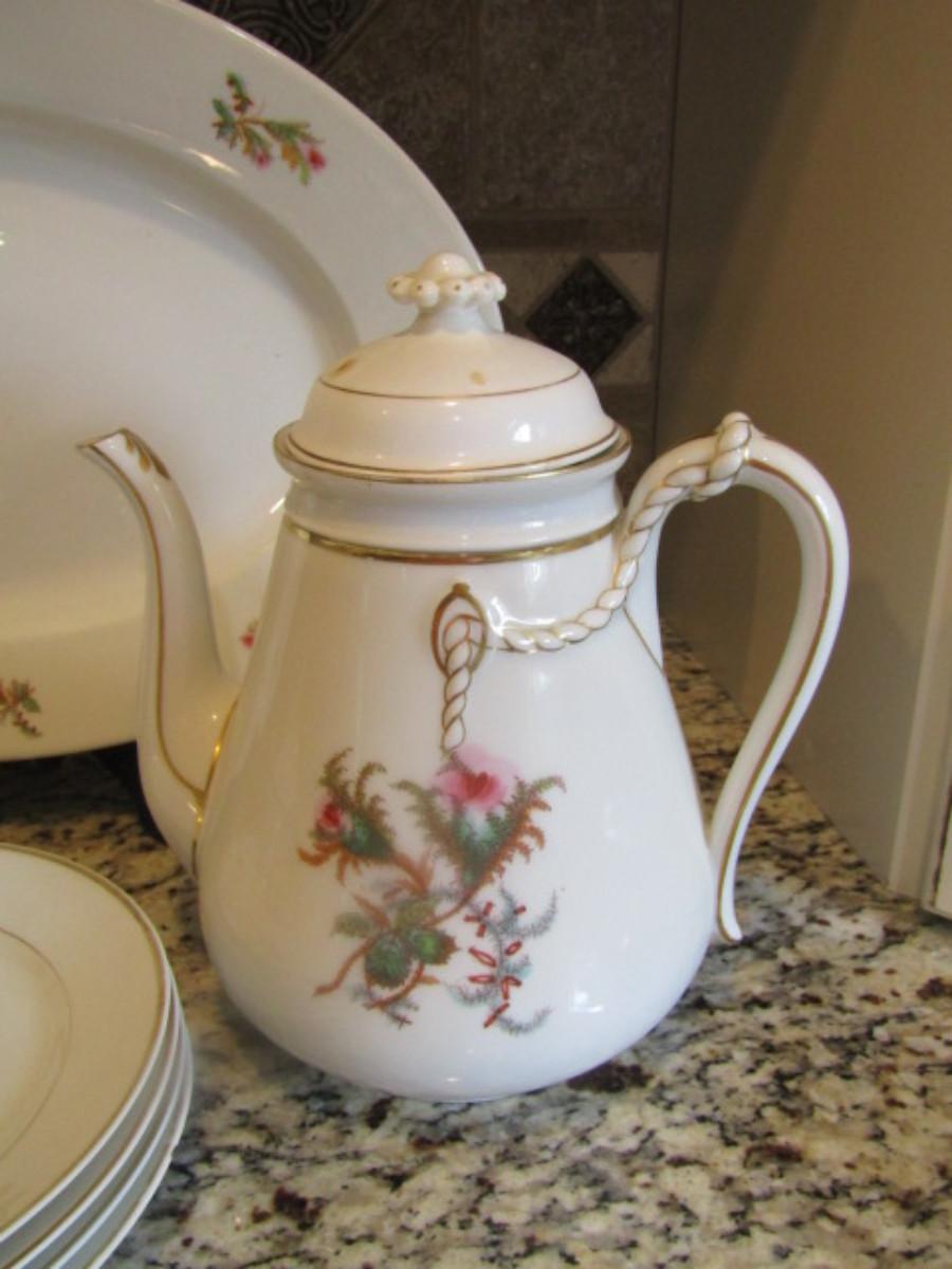 Assorted Vintage Haviland Limoges Dinnerware- Approx 19 Pieces (#23). 1 platter, 6 cups, 4 saucers, tea/coffee pot, large cup with saucer, 4 plates (approx 7"), 1 covered bowl. Please allow for chipping.