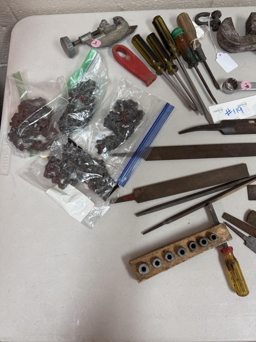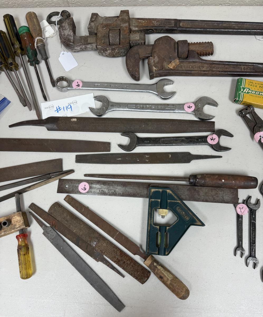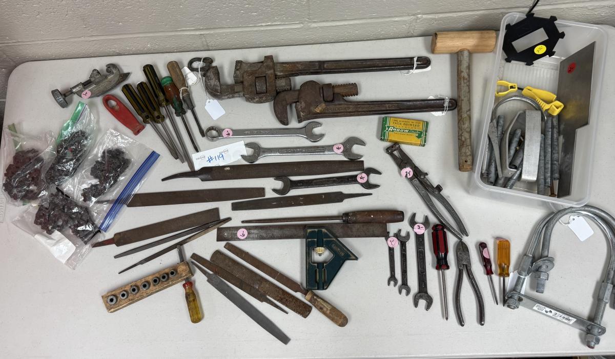 Wrenched, screwdrivers, metal files, pipe wrenches, and more