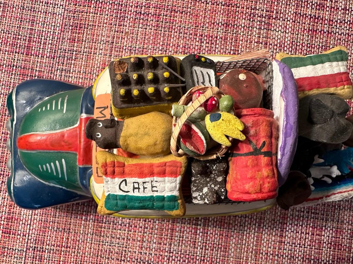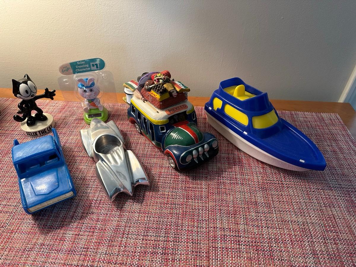 Felix the cat - ceramic limited edition, Easter Bunny Figurine, Blue Plastic Truck, Metal Car - candle holder, Plastic Boat, Ceramic "Mexico" loaded wagon car