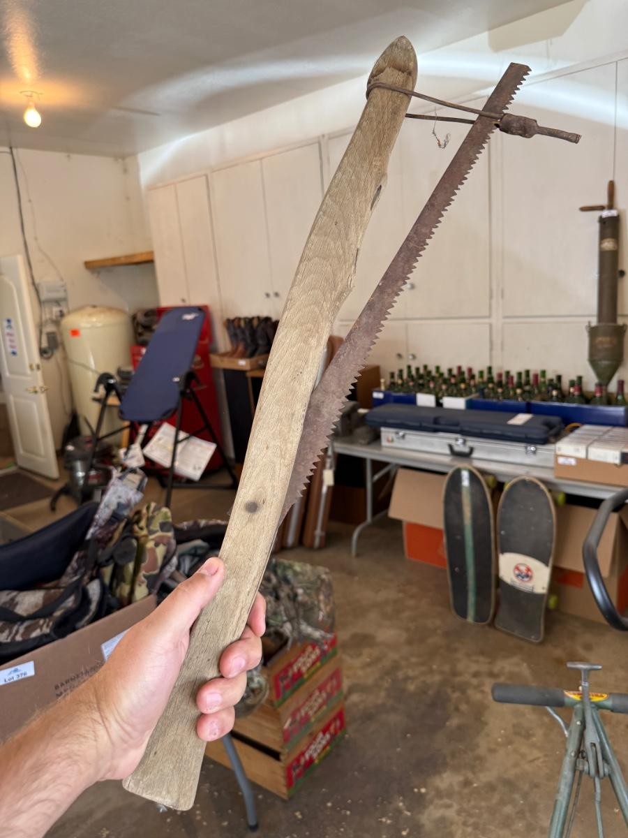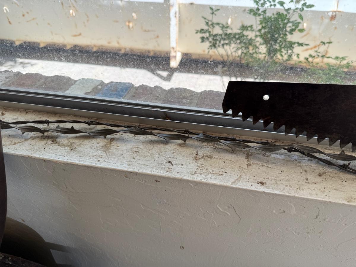 Vtg. hand tools in window & 2 piece barbed wire