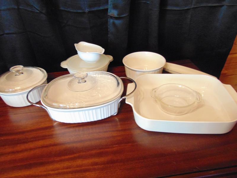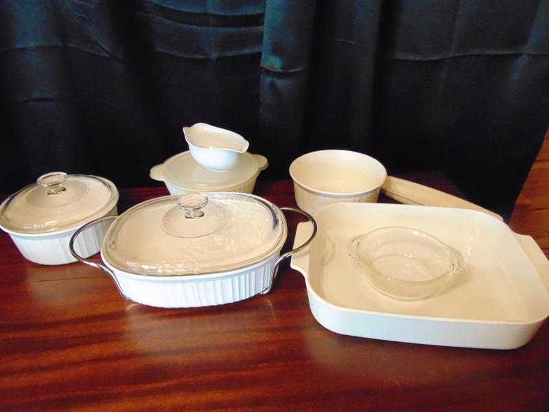 Casserole Dishes two with glass lids and square pan are glass the covered dish in back is microwaveable plastic