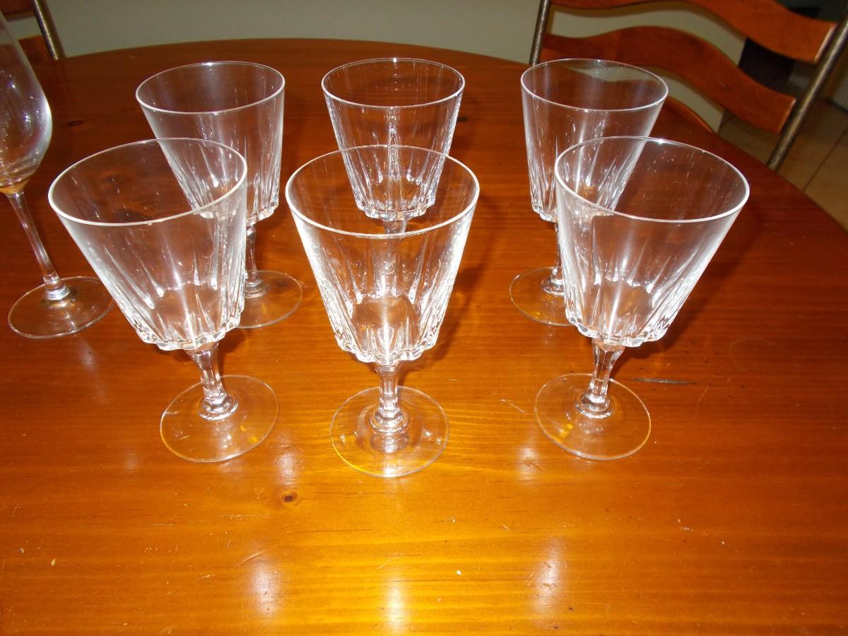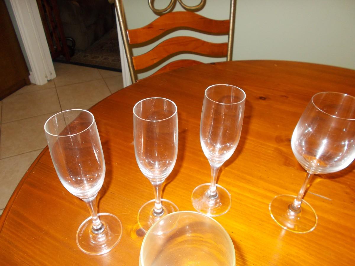 This lot includes 6 matching clear wine glasses, four matching blush tinted wine glasses, three matching champagne glasses and a single additional wine glass. All are in flawless condition.