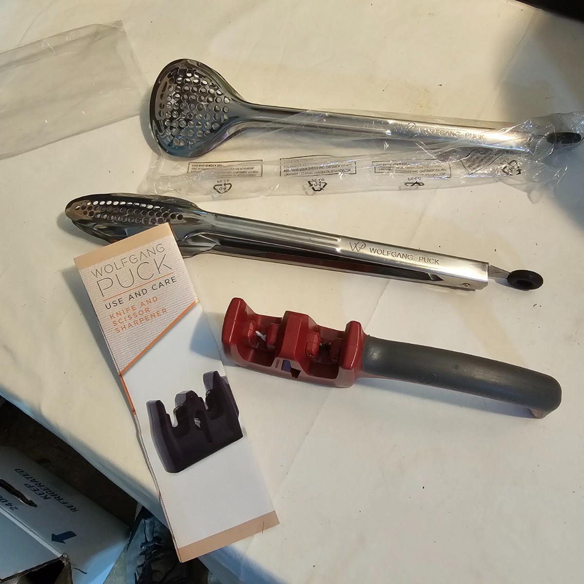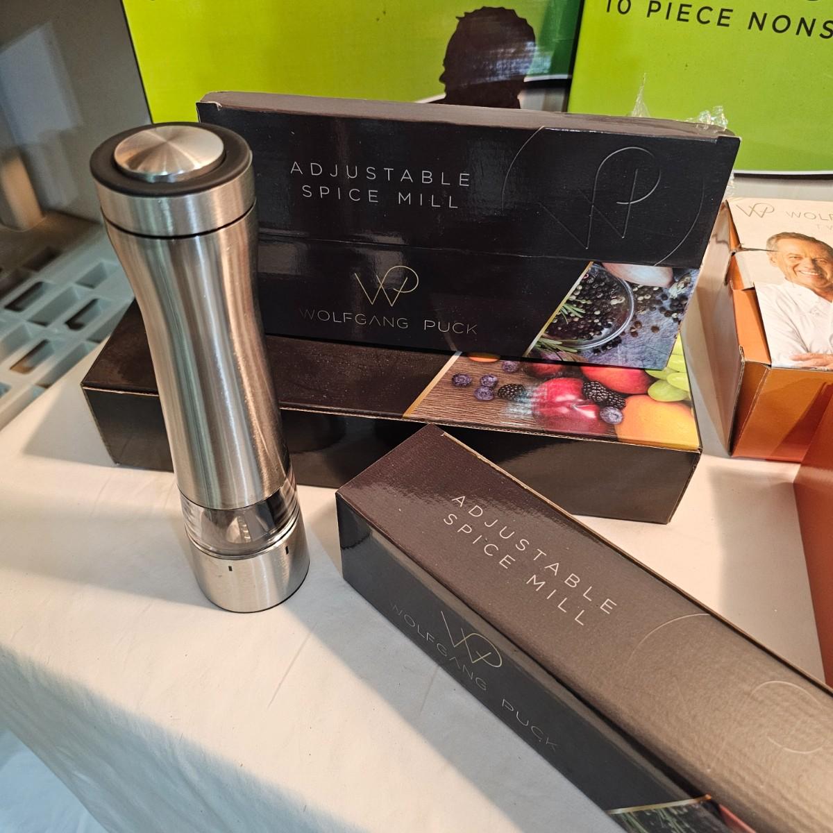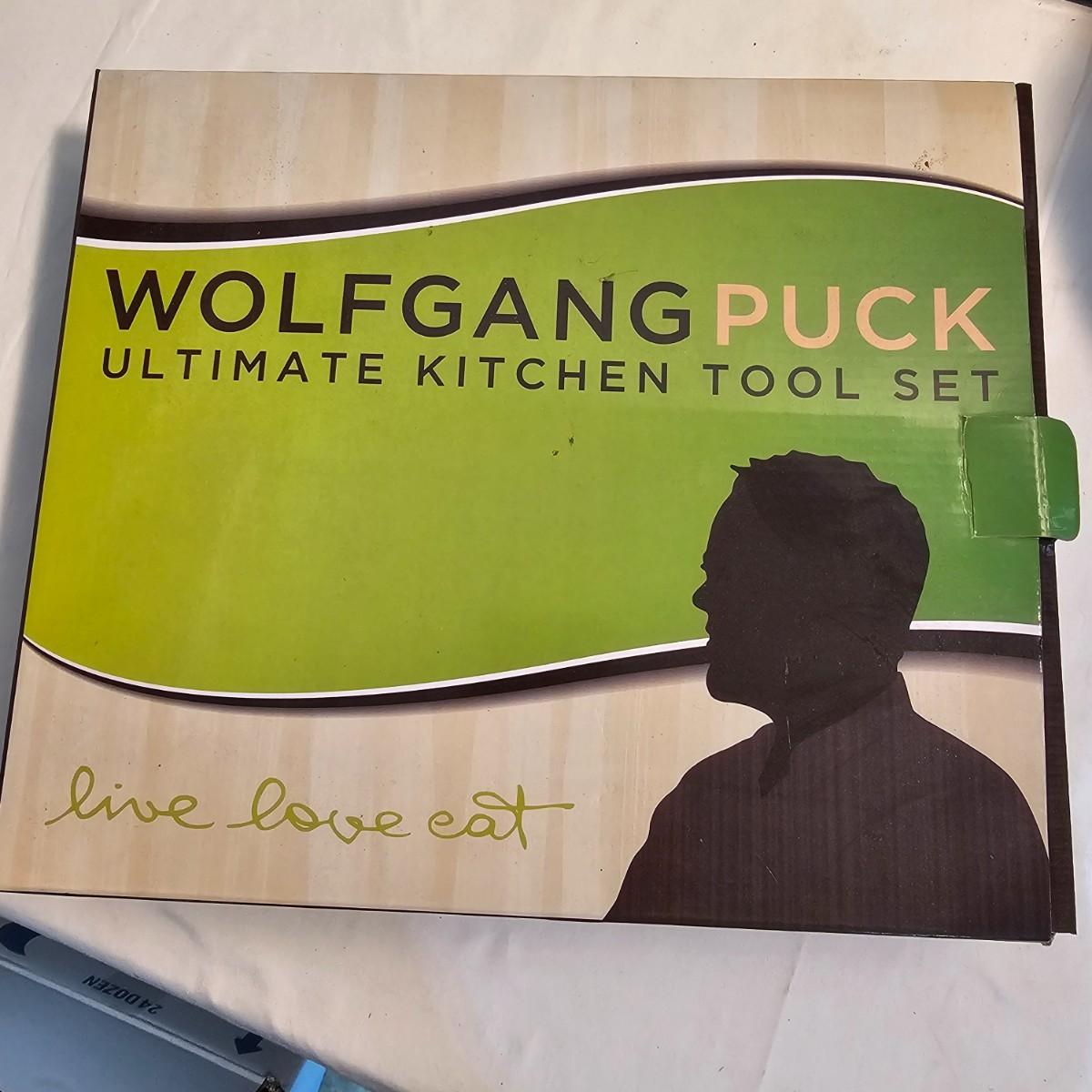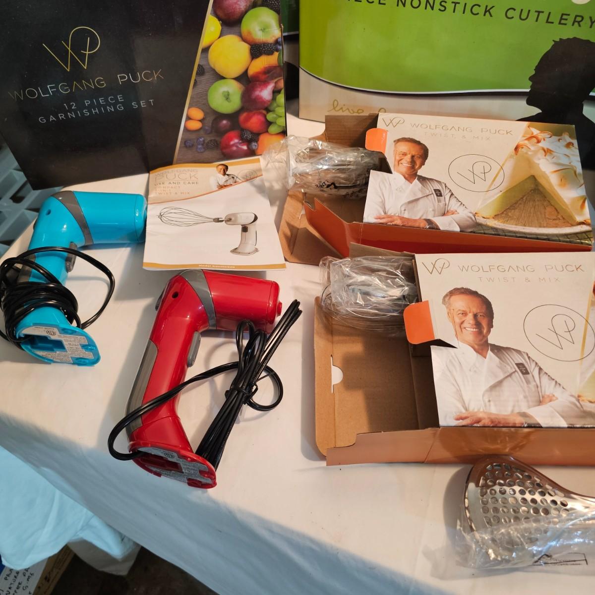 Everything in this lot is by Wolfgang Puck. Rice cooker, pie maker, and mini food processor are all electric. One garnishing set and ultimate kitchen tool set, NIB. Two boxes of knives, with one knife missing. Two stainless adjustable spice mills and two electric "Twist & Mix". Some small utensils and a knife sharpener. All electric items powered on when plugged in. See photos for details. Shipping available.
