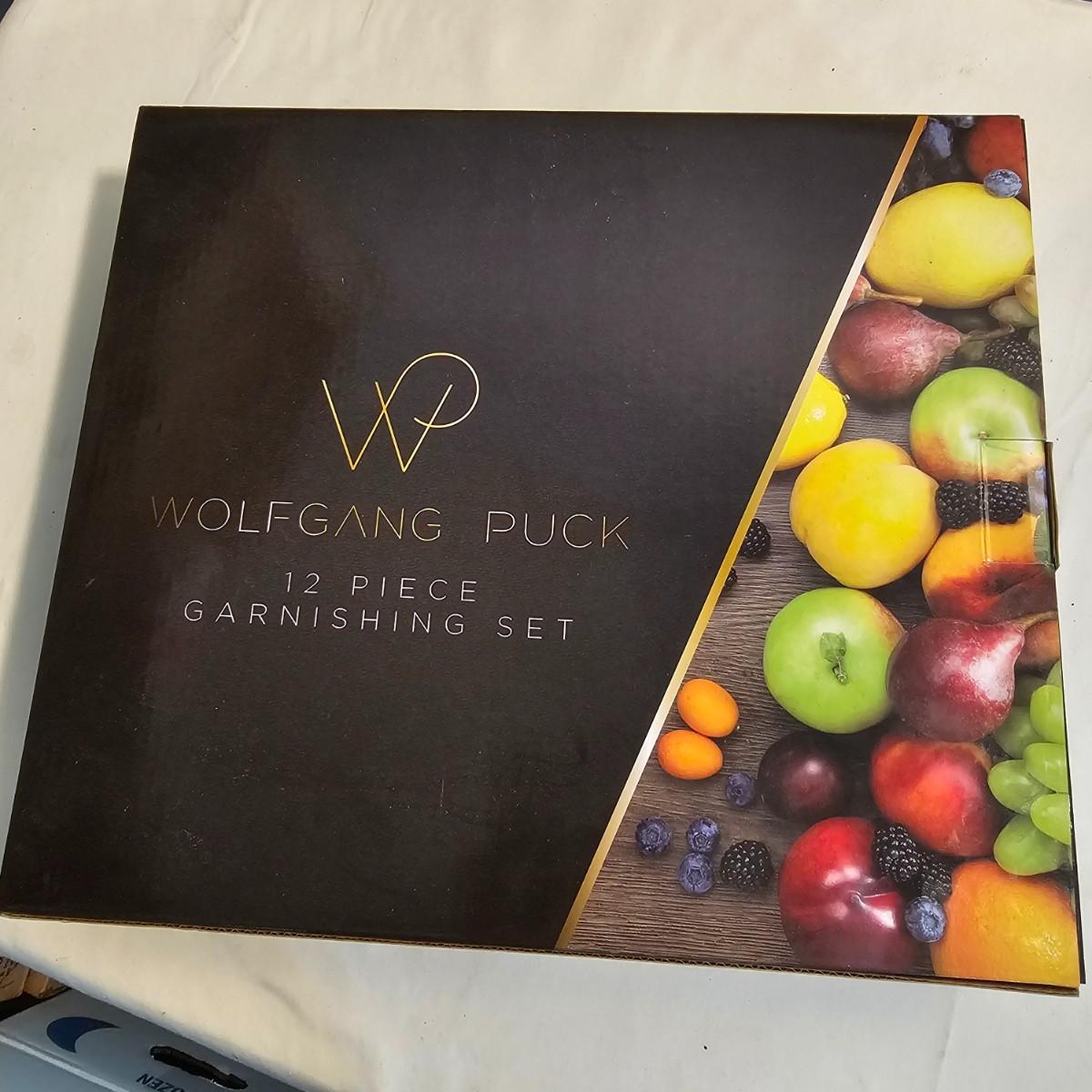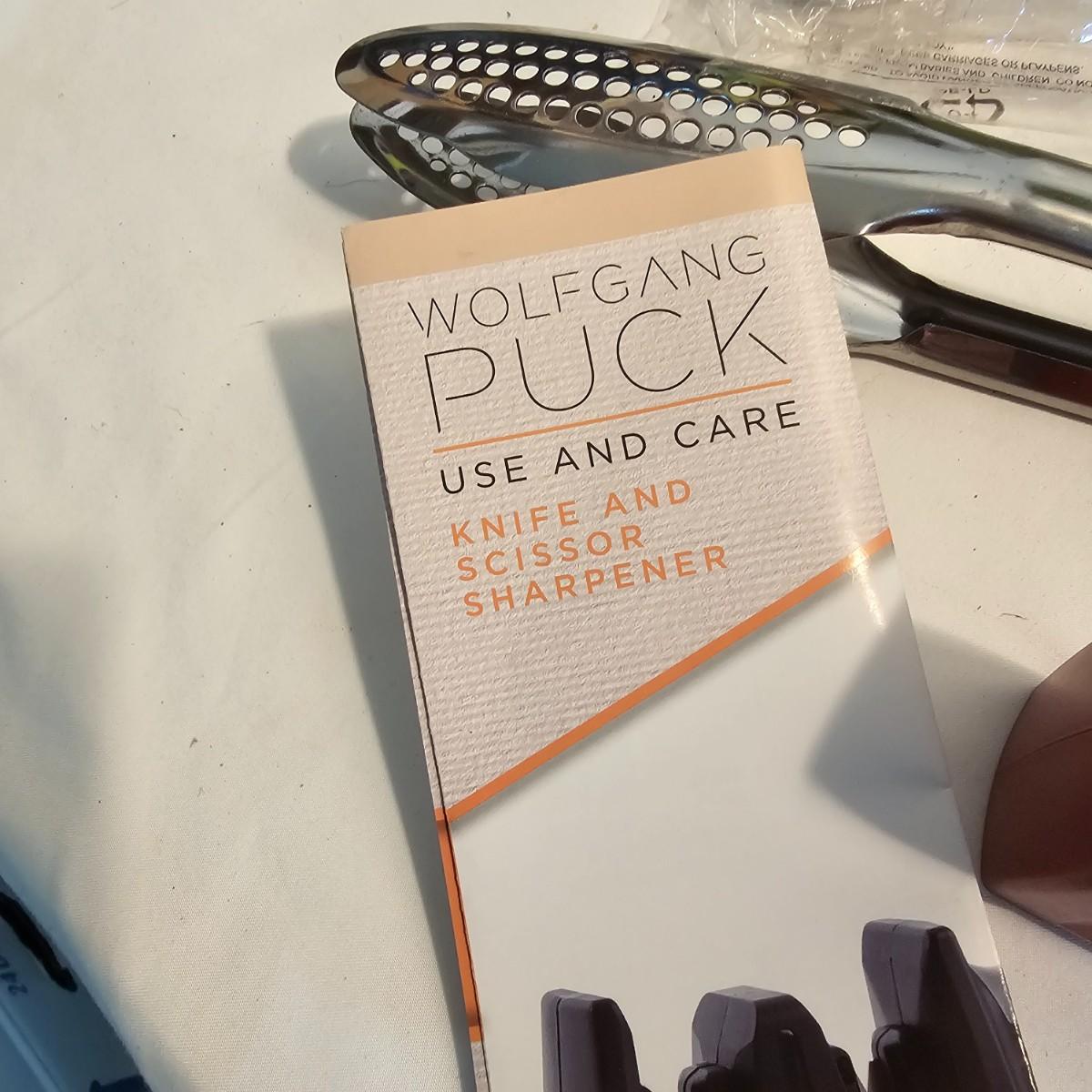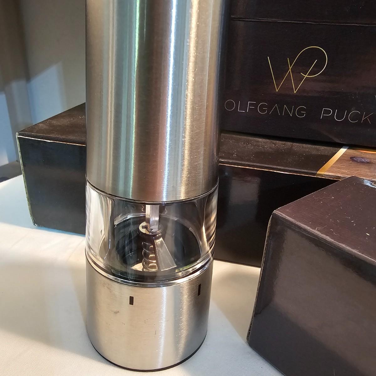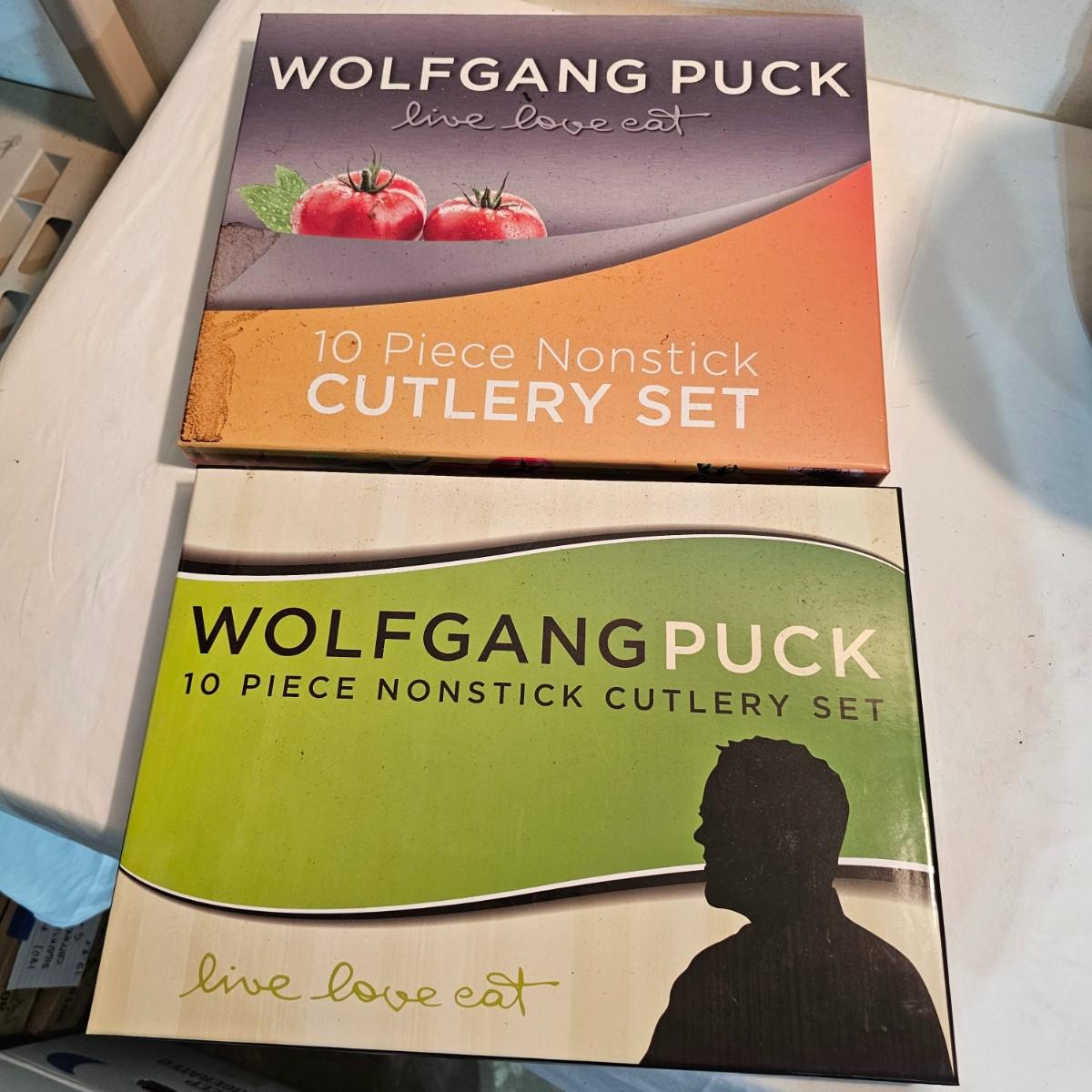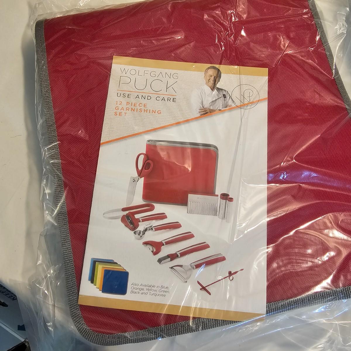 Everything in this lot is by Wolfgang Puck. Rice cooker, pie maker, and mini food processor are all electric. One garnishing set and ultimate kitchen tool set, NIB. Two boxes of knives, with one knife missing. Two stainless adjustable spice mills and two electric "Twist & Mix". Some small utensils and a knife sharpener. All electric items powered on when plugged in. See photos for details. Shipping available.