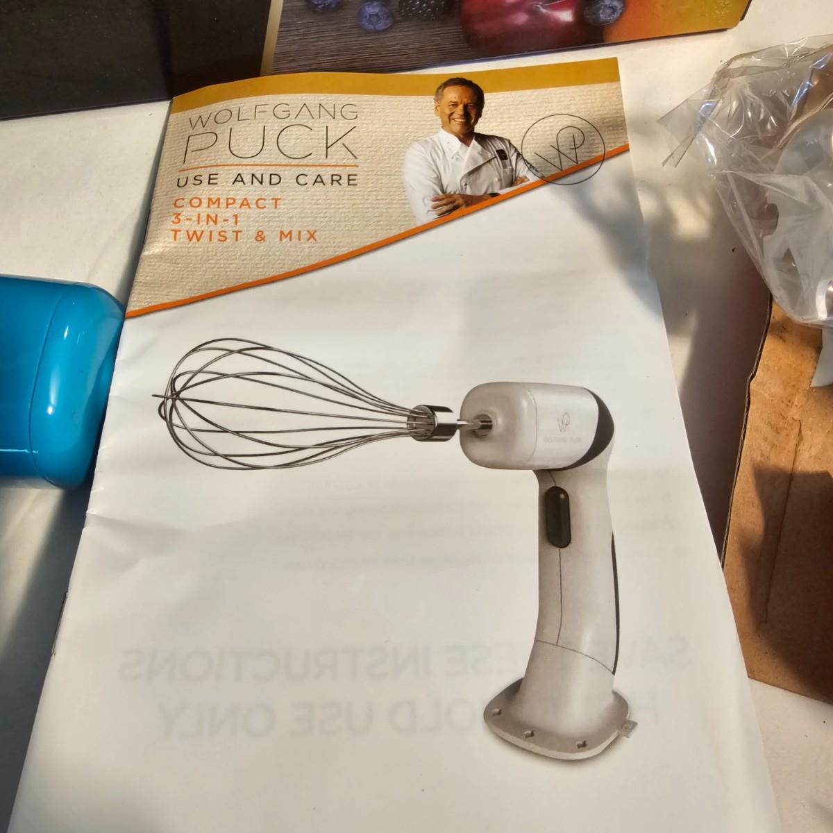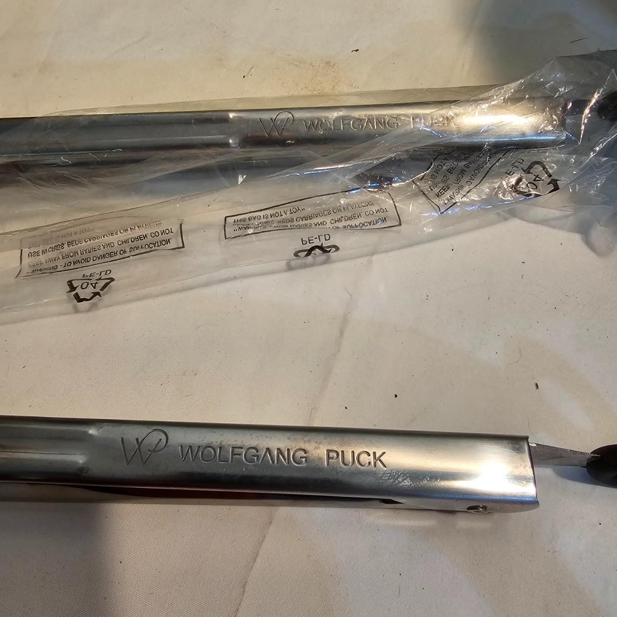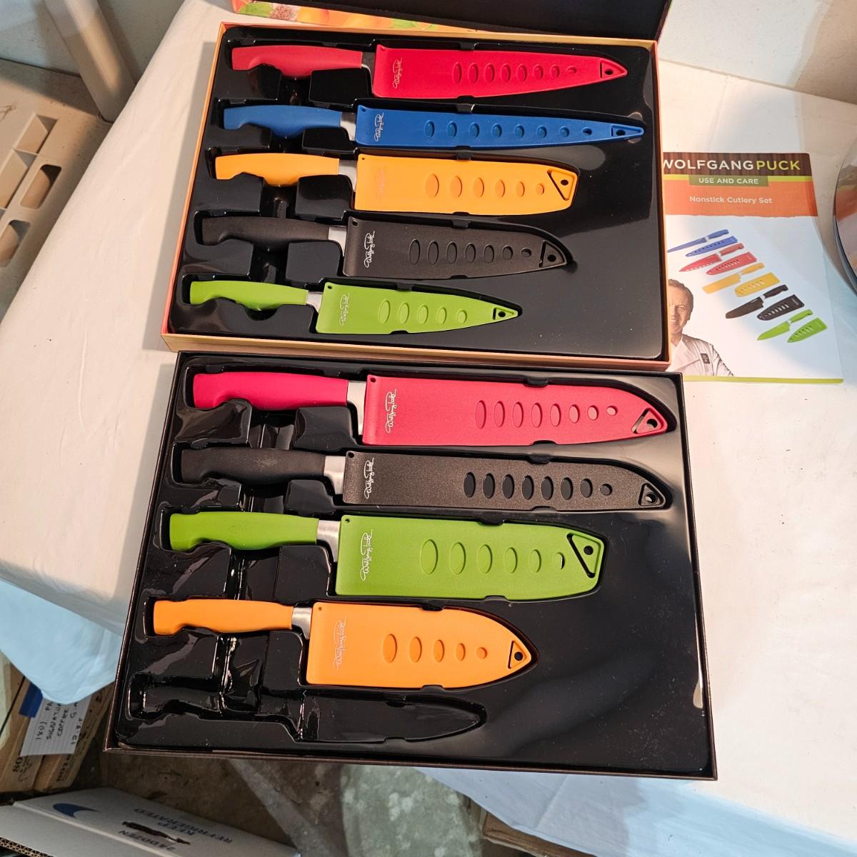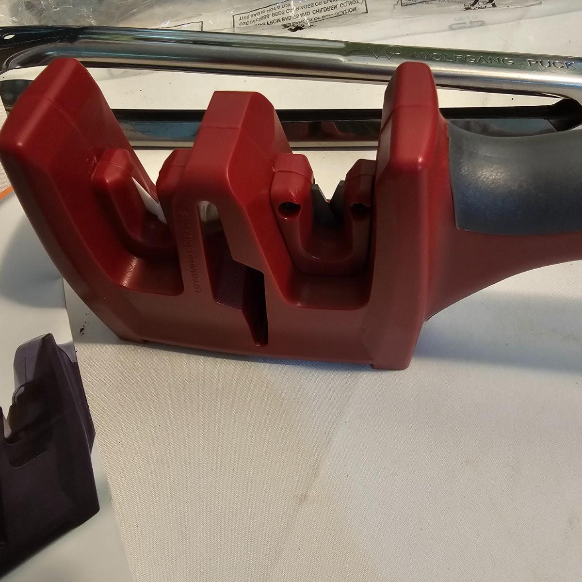 Everything in this lot is by Wolfgang Puck. Rice cooker, pie maker, and mini food processor are all electric. One garnishing set and ultimate kitchen tool set, NIB. Two boxes of knives, with one knife missing. Two stainless adjustable spice mills and two electric "Twist & Mix". Some small utensils and a knife sharpener. All electric items powered on when plugged in. See photos for details. Shipping available.