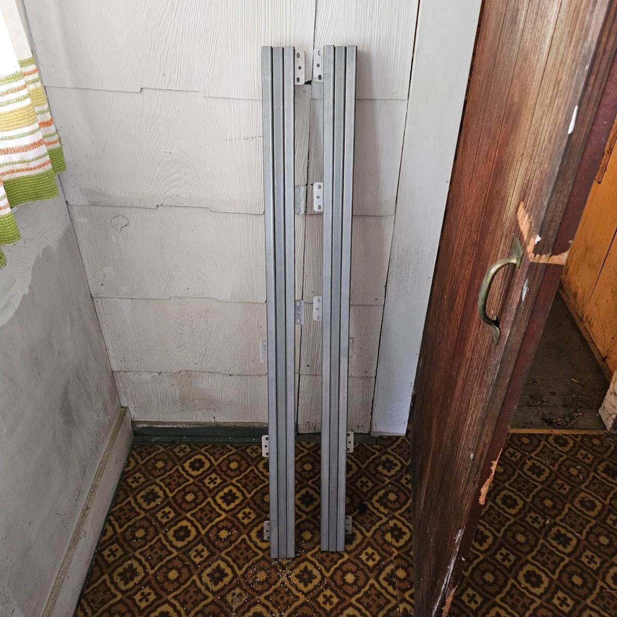 A collection of table tops and leaves to go together to make dining room tables or other. No legs with these, just the tops. Table pieces are 40"W x 30"Deep, two together would make a 40" x 60" table top. Pieces are veneer over some heavy wood base, are 1.75" thick. Leaves are 40" x 15" and also 1.75" thick. 16 items of each size. Also included are a set of table extenders to lengthen your table. These are metal and extend to 96". These items have been stored in a closet and will need some cleaning and wiping. See photos for details.