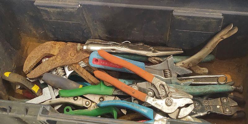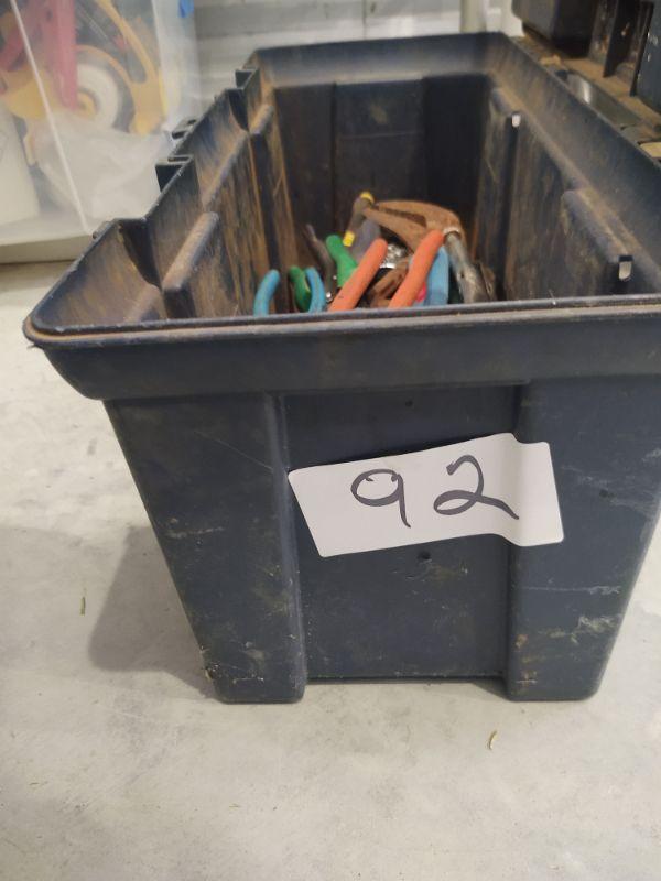 lot 91 - Assorted wrenches, vice grips, etrc. in heavy duty bin